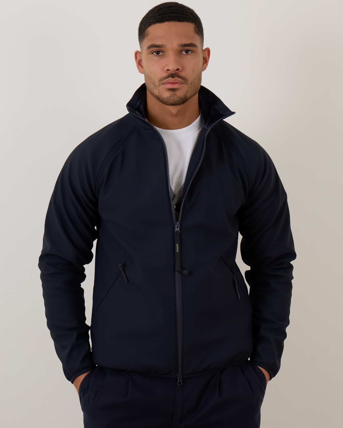 Layer this navy jacket over knitwear and chinos for polished weekend looks, or combine with tailored trousers and a crisp shirt for smart-casual occasions. From Aspesi, this piece pairs beautifully with both white sneakers and leather shoes, adapting to your styling preferences.