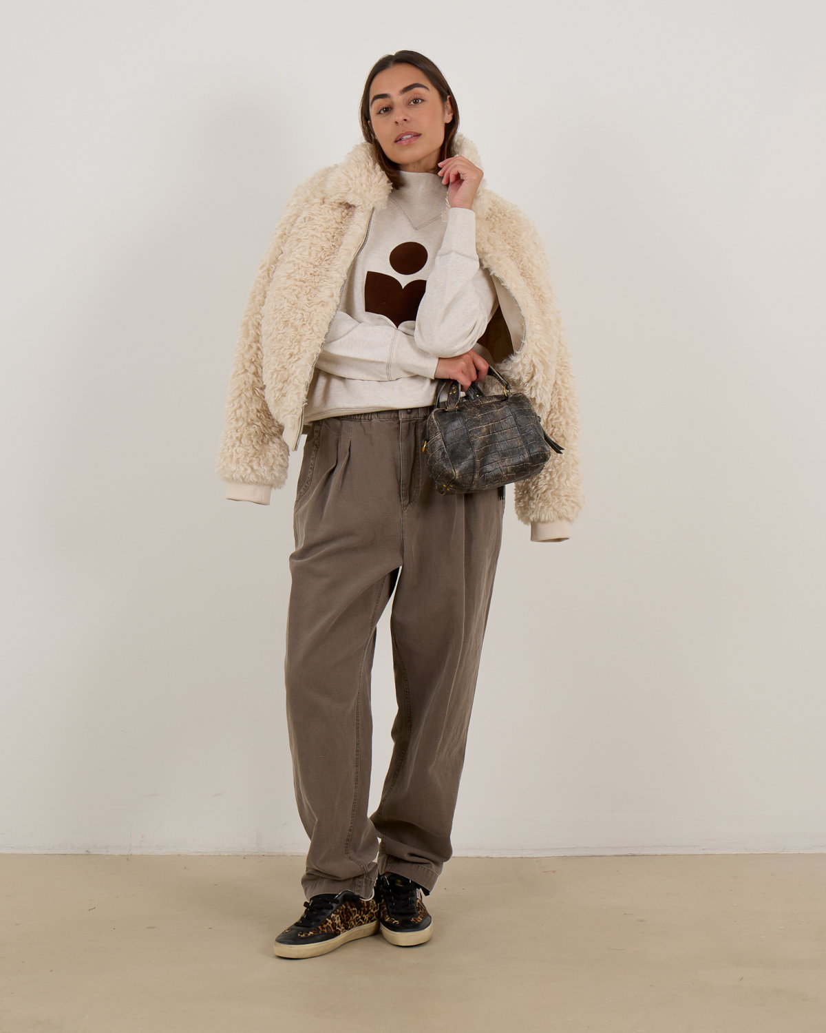 This striking ecru faux fur teddy jacket captures attention with its luxurious textured finish and regular fit silhouette. Crafted from 100% polyester, the women's clothing piece features a high collar and zip closure with ribbed detailing at the hem and cuffs. The curly faux fur creates a bold statement while maintaining comfort throughout wear. Marant Étoile brings sophisticated edge to this standout outerwear piece that elevates any ensemble.