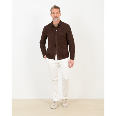 This short brown suede jacket from Alter Ego combines rich coffee tones with refined craftsmanship. The soft suede material delivers luxurious texture and comfortable wear throughout the day. White pearl snap buttons create striking contrast against the deep brown shade, while dual chest pockets with flap closures add functional style. The classic collar and tailored fit ensure a sophisticated silhouette that works across seasons.