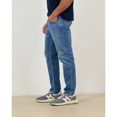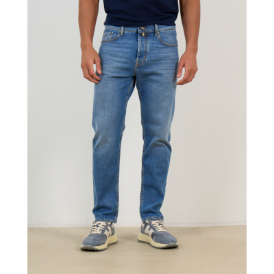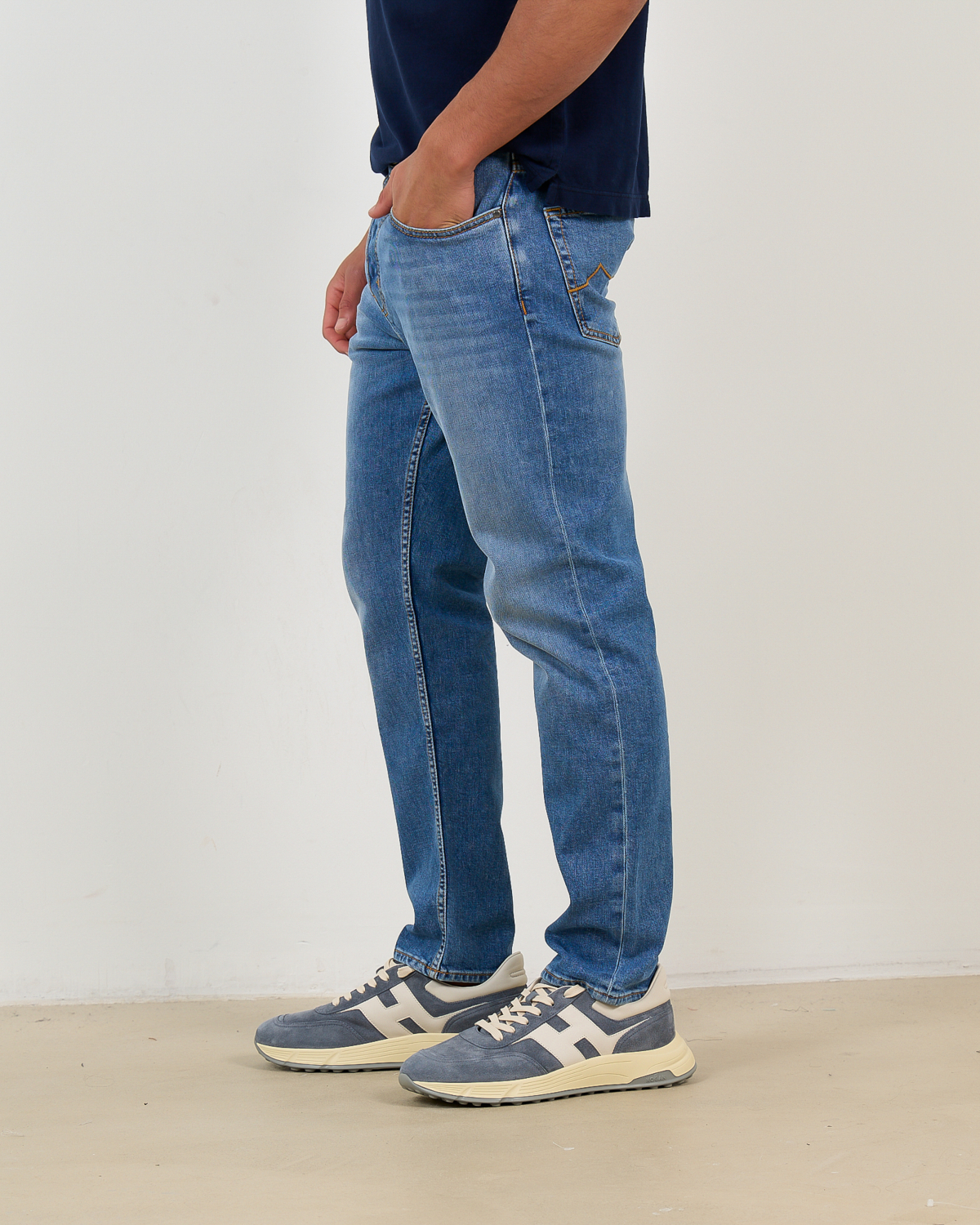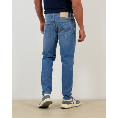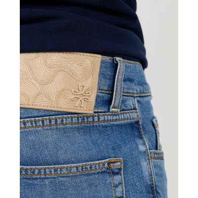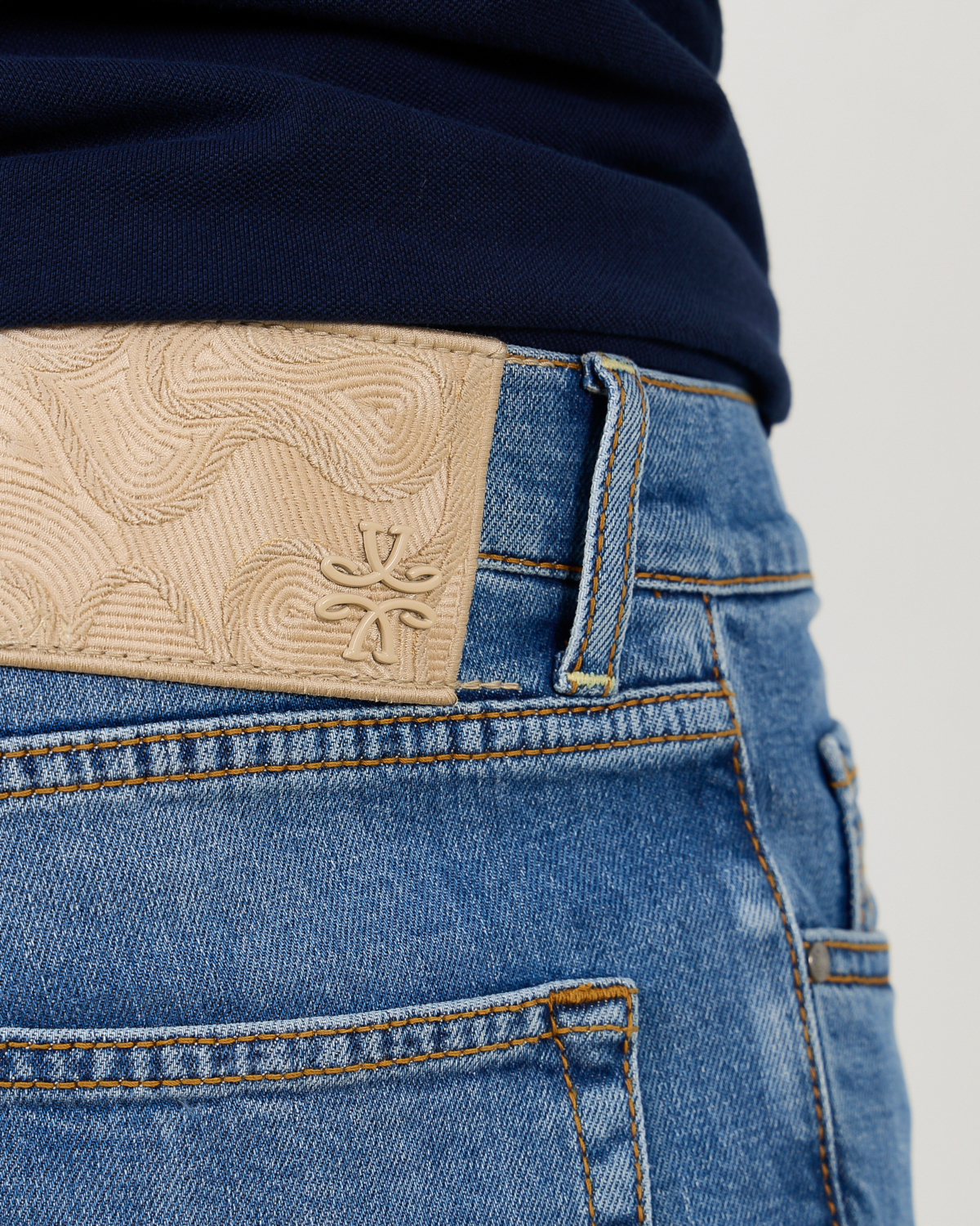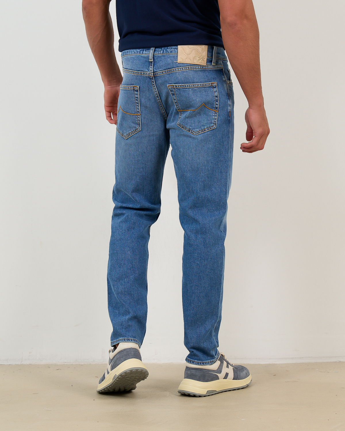 These premium blue jeans from Jacob Cohën combine Italian craftsmanship with contemporary men's clothing design. The medium blue wash features subtle fading and distinctive contrast stitching that adds character. Crafted from a cotton blend of 79% cotton, 20% lyocell and 1% elastane, the fabric offers both comfort and flexibility. The slim fit silhouette creates a tailored appearance through the leg, while the five-pocket styling includes front and back pockets with classic denim detailing. The leather brand patch at the back waistband adds an authentic premium touch.