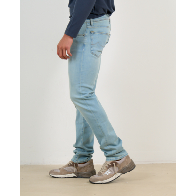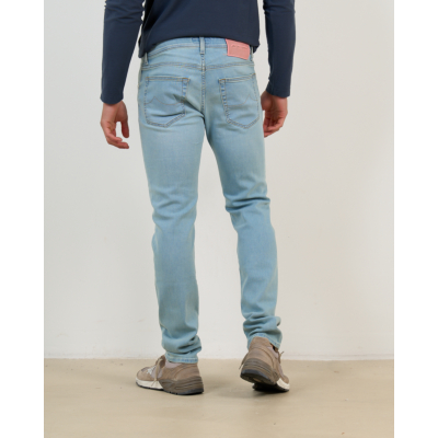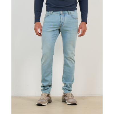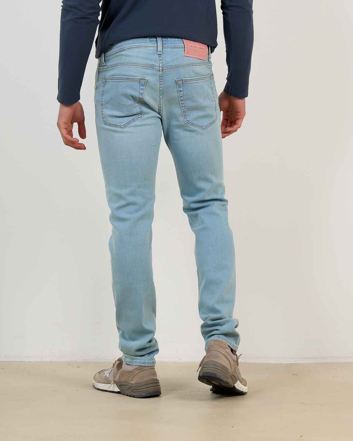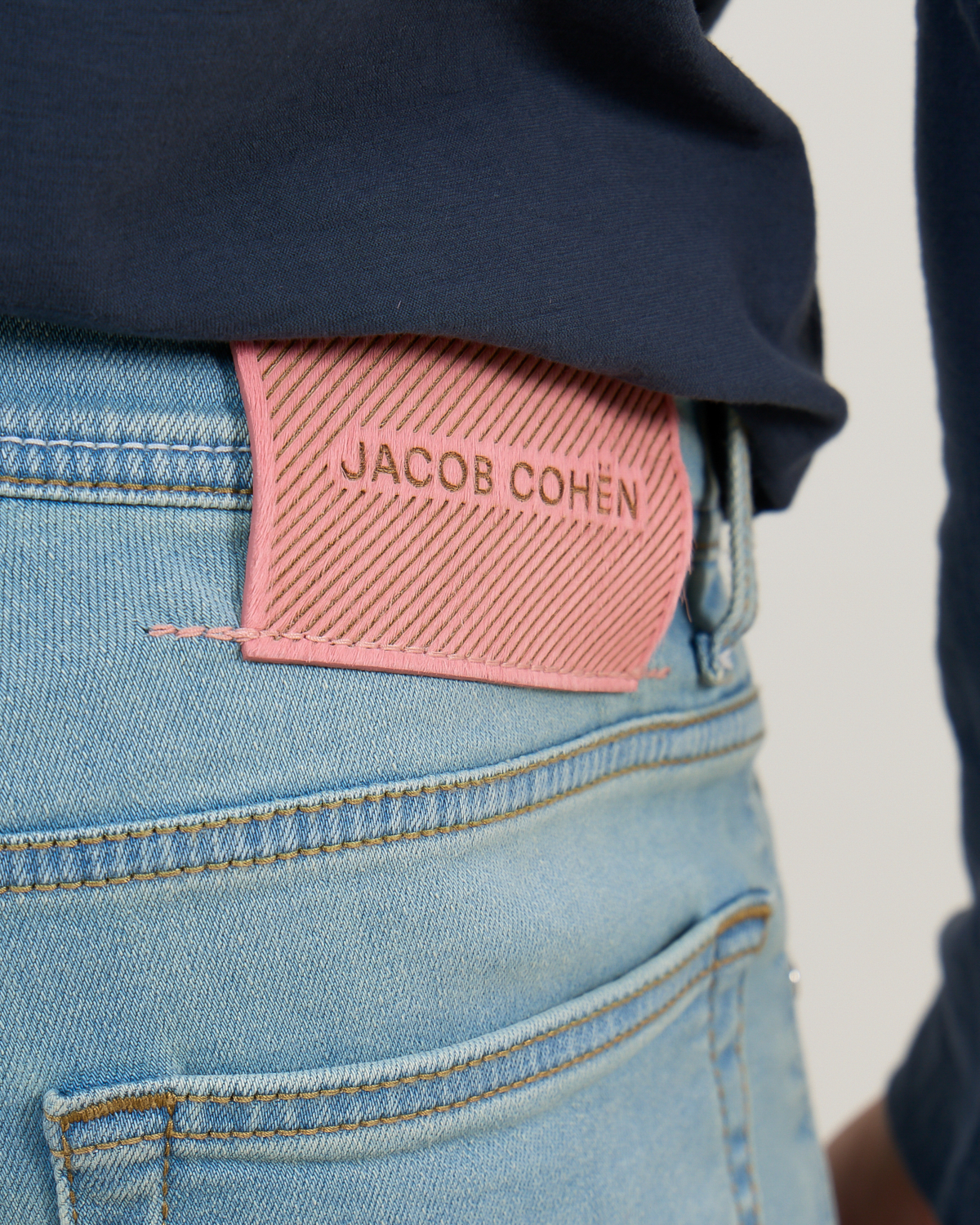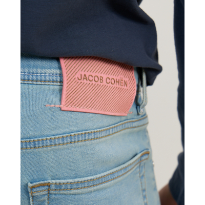 These slim-fit men's jeans in light blue denim bring contemporary style to your everyday wardrobe. The premium fabric blend of 81% cotton, 11% lyocell, and 6% elastane delivers comfort and movement while maintaining structure. Five classic pockets provide practical storage, while the signature leather waistband label adds refined branding detail. The light blue wash creates versatility for both casual and smart-casual occasions. Crafted by Jacob Cohën, these quality men's clothing essentials feature precise stitching and authentic denim construction.