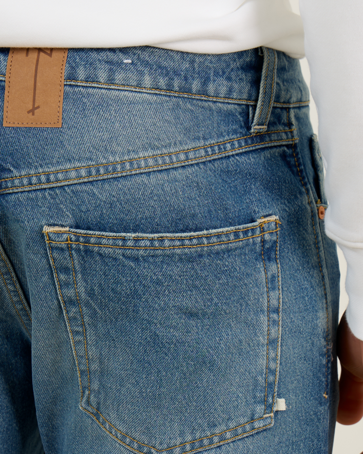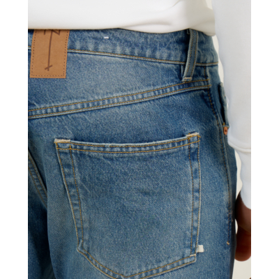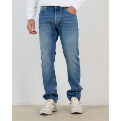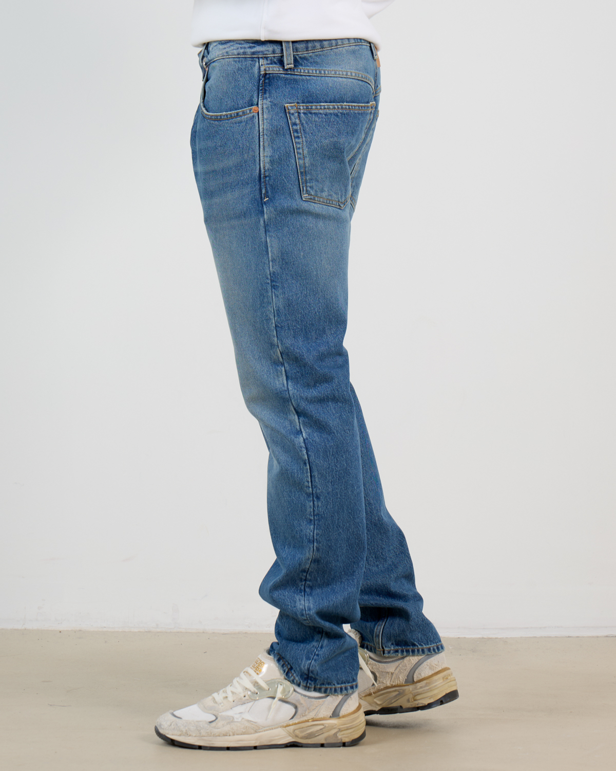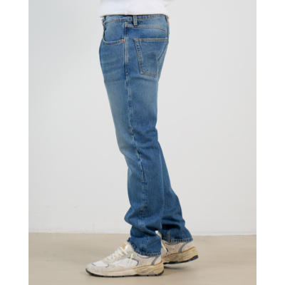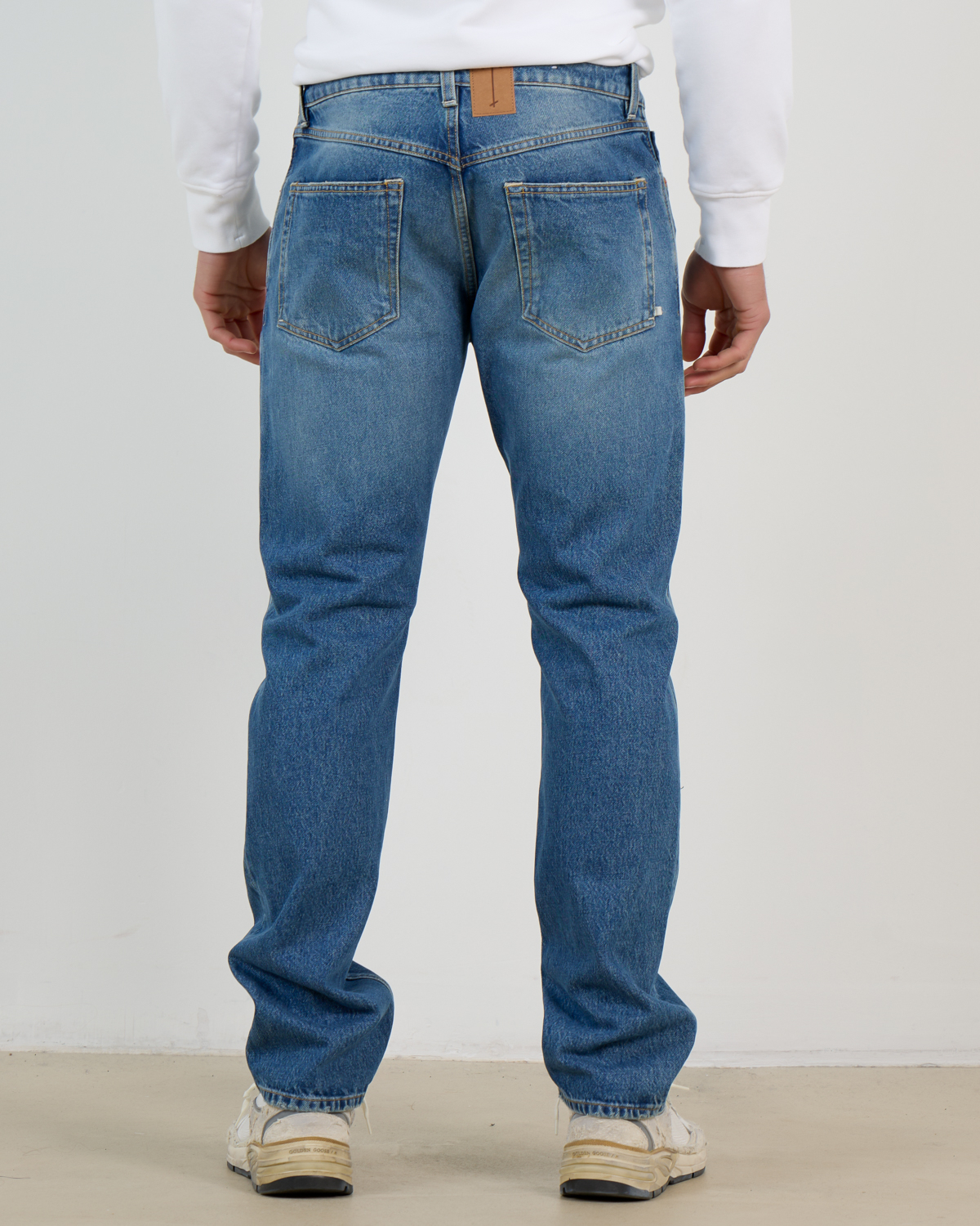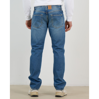 These Sierra jeans in classic blue combine authentic denim character with modern comfort. The medium blue wash features subtle fading that creates natural depth and visual interest. Crafted with a straight leg silhouette, these men's clothing essentials offer a relaxed yet refined fit. The classic five-pocket design includes front and back pockets with clean topstitching throughout. The button fly closure and belt loops complete the traditional denim aesthetic. From Tenue, these jeans represent quality craftsmanship with contemporary appeal.