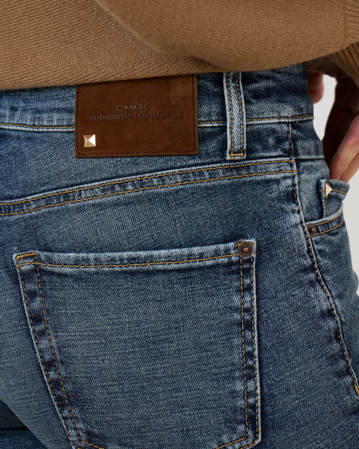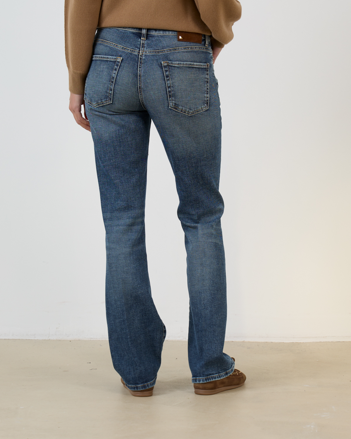 These flared Paris jeans in washed dark blue from Cambio bring back the iconic seventies silhouette with contemporary refinement. The quality cotton blend features 98% cotton and 2% elastane for optimal comfort and movement. Classic five-pocket styling includes front pockets and back patch pockets, finished with contrasting topstitching throughout. The button and zip closure ensures a secure fit, while the flared leg creates an elongated, elegant silhouette.