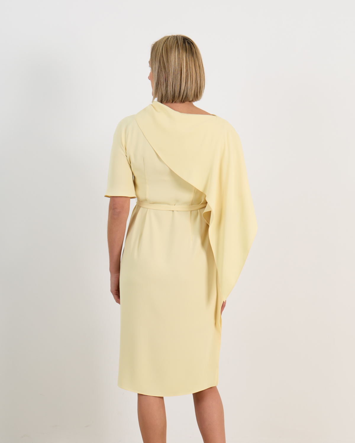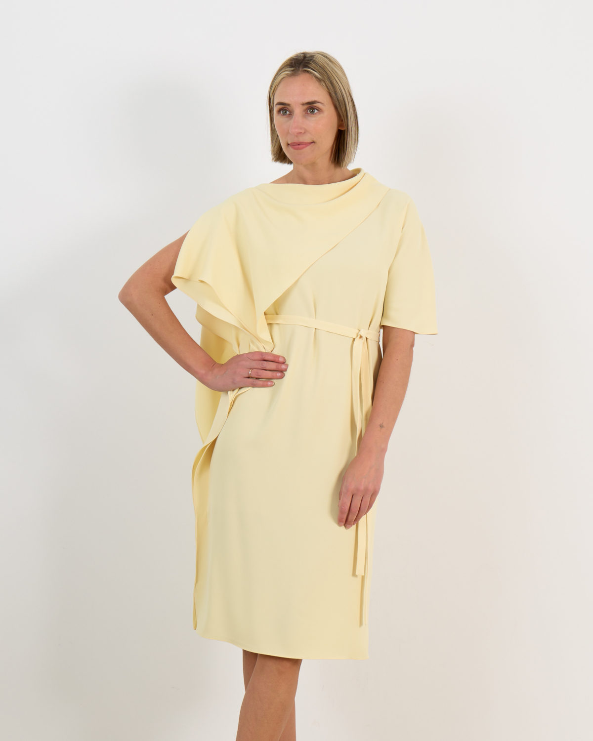 This sophisticated midi dress in light yellow showcases an asymmetrical design that commands attention. The 100% polyester construction features an elegant wrap-style silhouette with a distinctive one-shoulder drape detail and coordinating waist tie. The short sleeve on one side creates visual balance while the flowing fabric panel adds contemporary drama. From Natan, this women's clothing piece combines modern architectural elements with refined femininity for those who appreciate distinctive design.