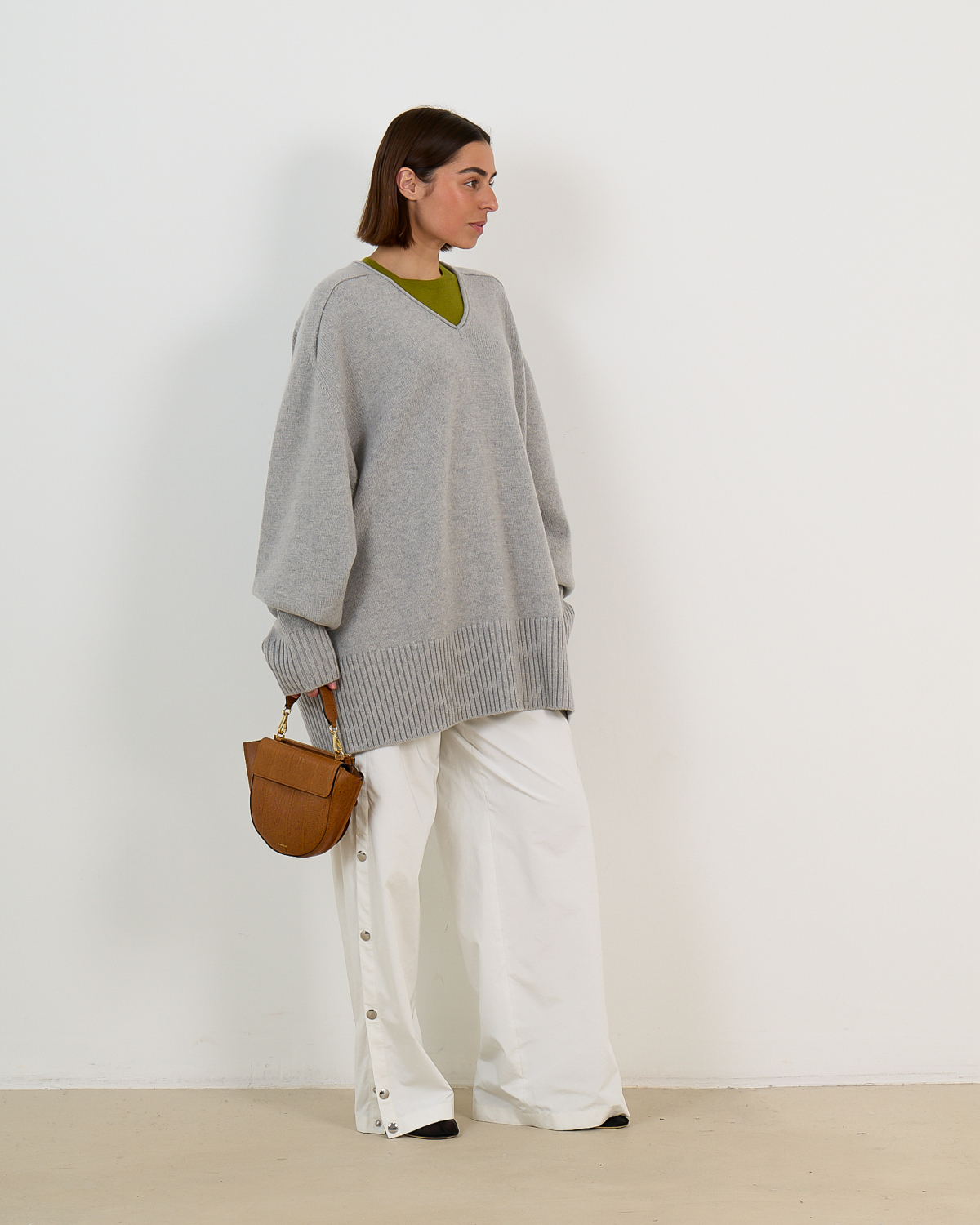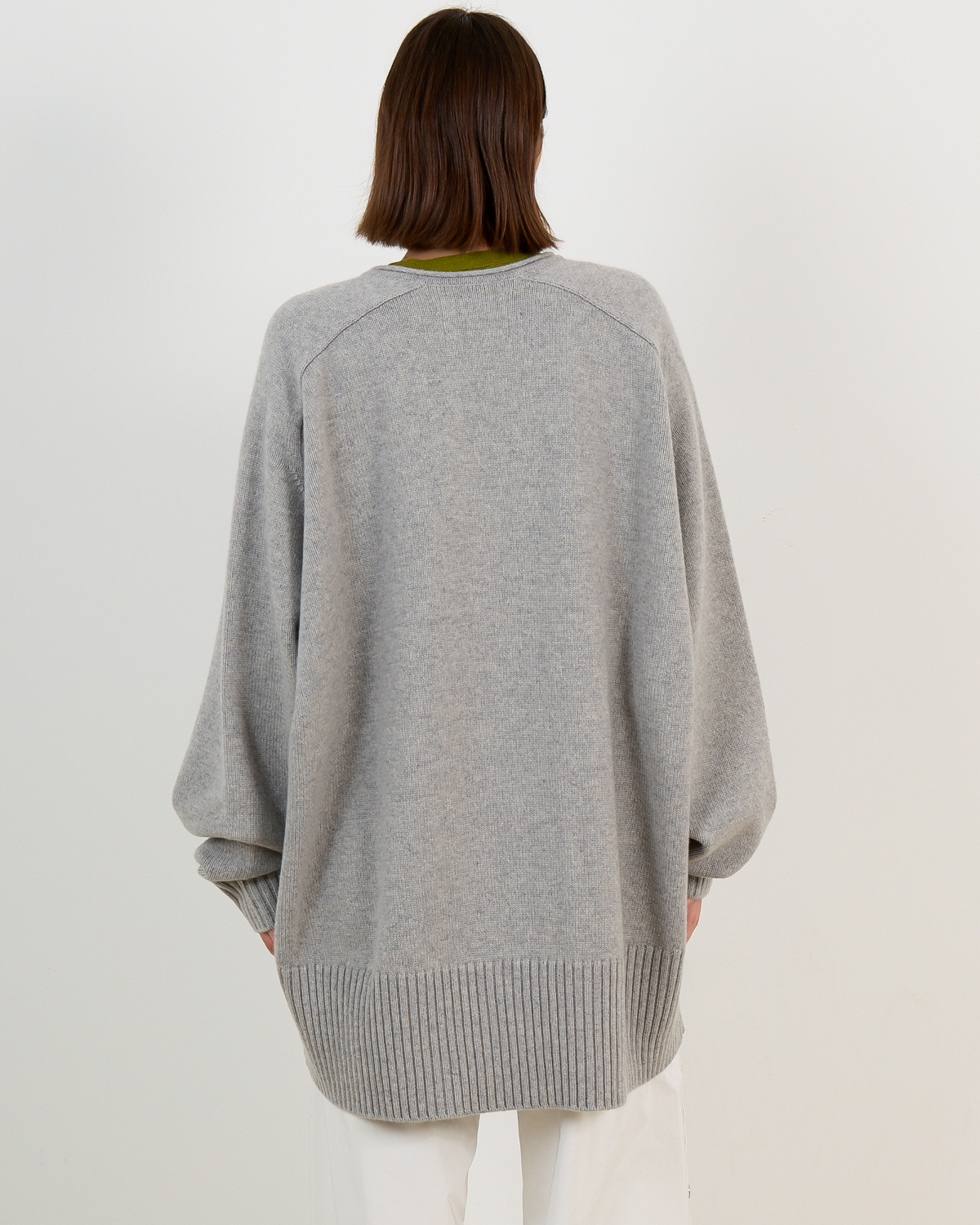 Layer this cashmere knit over fitted tops or wear it solo with tailored trousers for polished daywear. Pair with leather pants and boots for an elevated casual look, or combine with a midi skirt and ankle boots for contemporary styling. The neutral grey shade complements both monochrome palettes and vibrant accent colors beautifully.