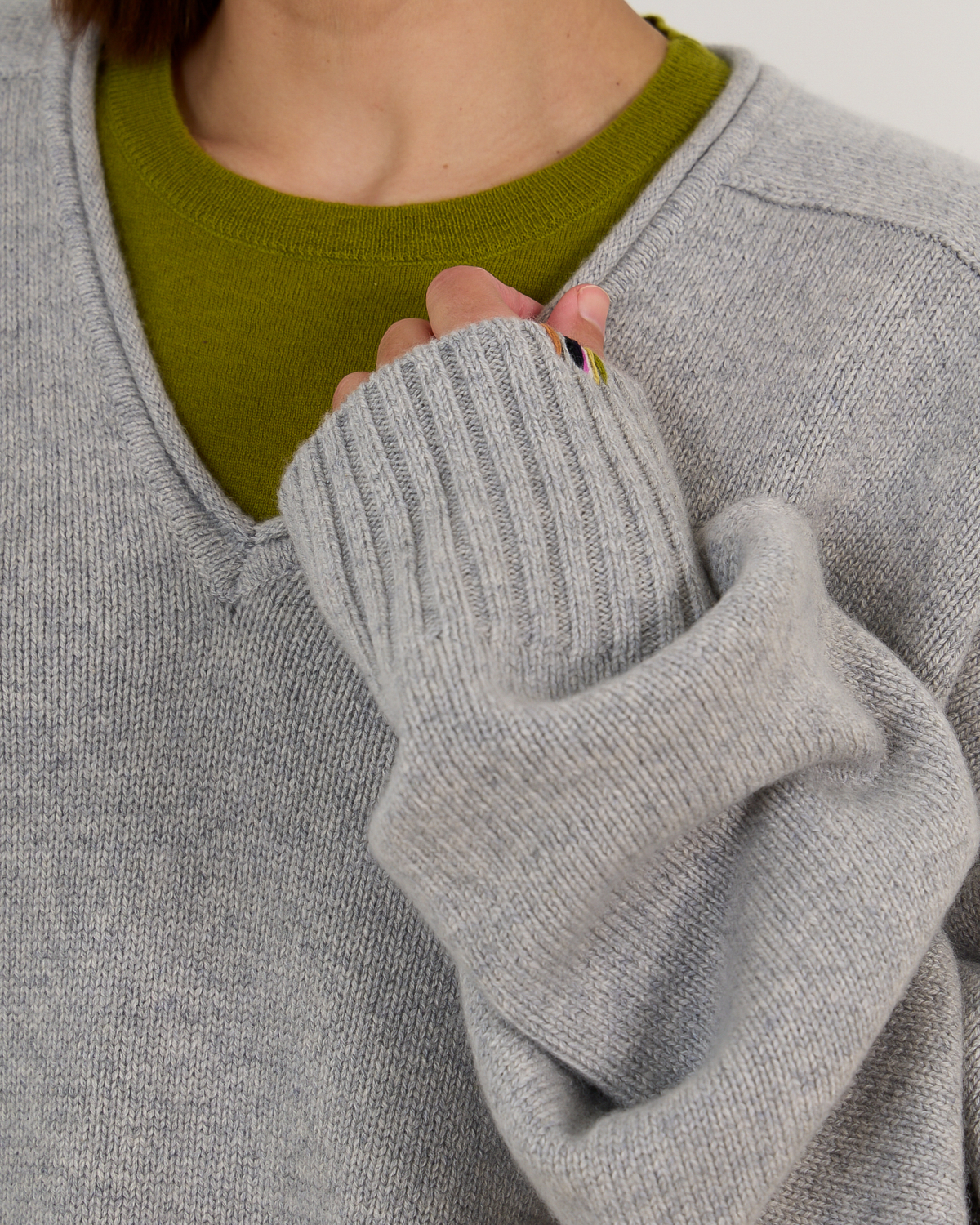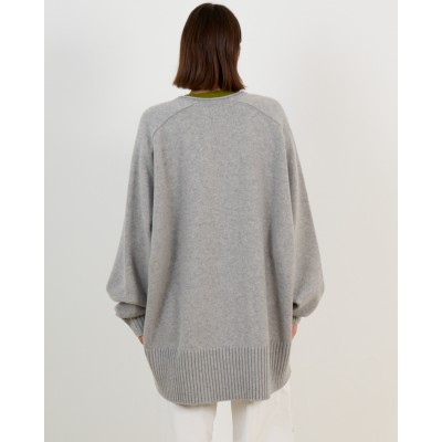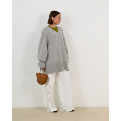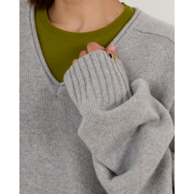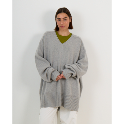This grey cashmere sweater from Extreme Cashmere embodies luxurious comfort in women's clothing. Crafted from 100% cashmere, this oversized piece features a classic V-neckline and long sleeves with ribbed cuffs. The relaxed fit creates an elegantly modern silhouette, while the ribbed hem adds refined structure. The soft grey tone makes this sweater a versatile foundation piece that exudes understated sophistication.
