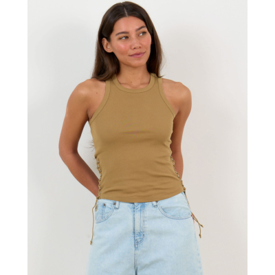 This bronze tank top from Love Stories combines contemporary women's clothing design with eye-catching details. The sleeveless top features a round neckline and distinctive braided lace-up details along both sides, creating an edgy yet refined look. Crafted from 95% cotton and 5% elastane, this slim fit piece offers comfortable stretch while maintaining its shape. The bronze brown tone adds warmth to your wardrobe essentials.