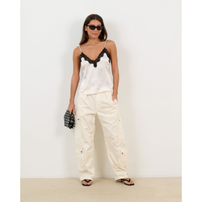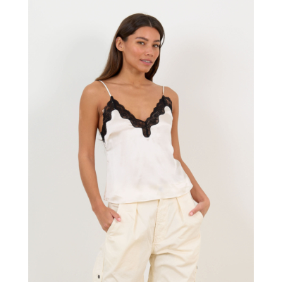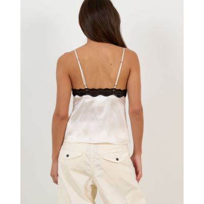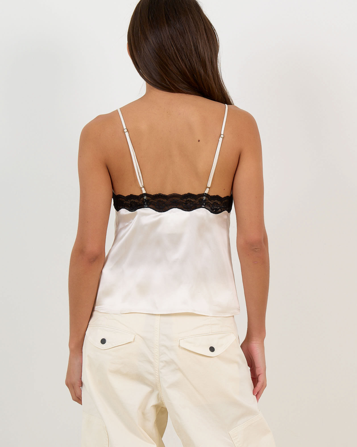 This elegant silk camisole in off white showcases the refined craftsmanship of Love Stories. Made from 100% silk with a regular fit, this women's clothing piece features delicate black lace trim along the V-neckline and back hem. The adjustable thin straps provide a perfect fit, while the luxurious silk fabric drapes beautifully against your skin. The contrast between the soft off white base and intricate black lace creates a sophisticated statement piece that elevates any look.