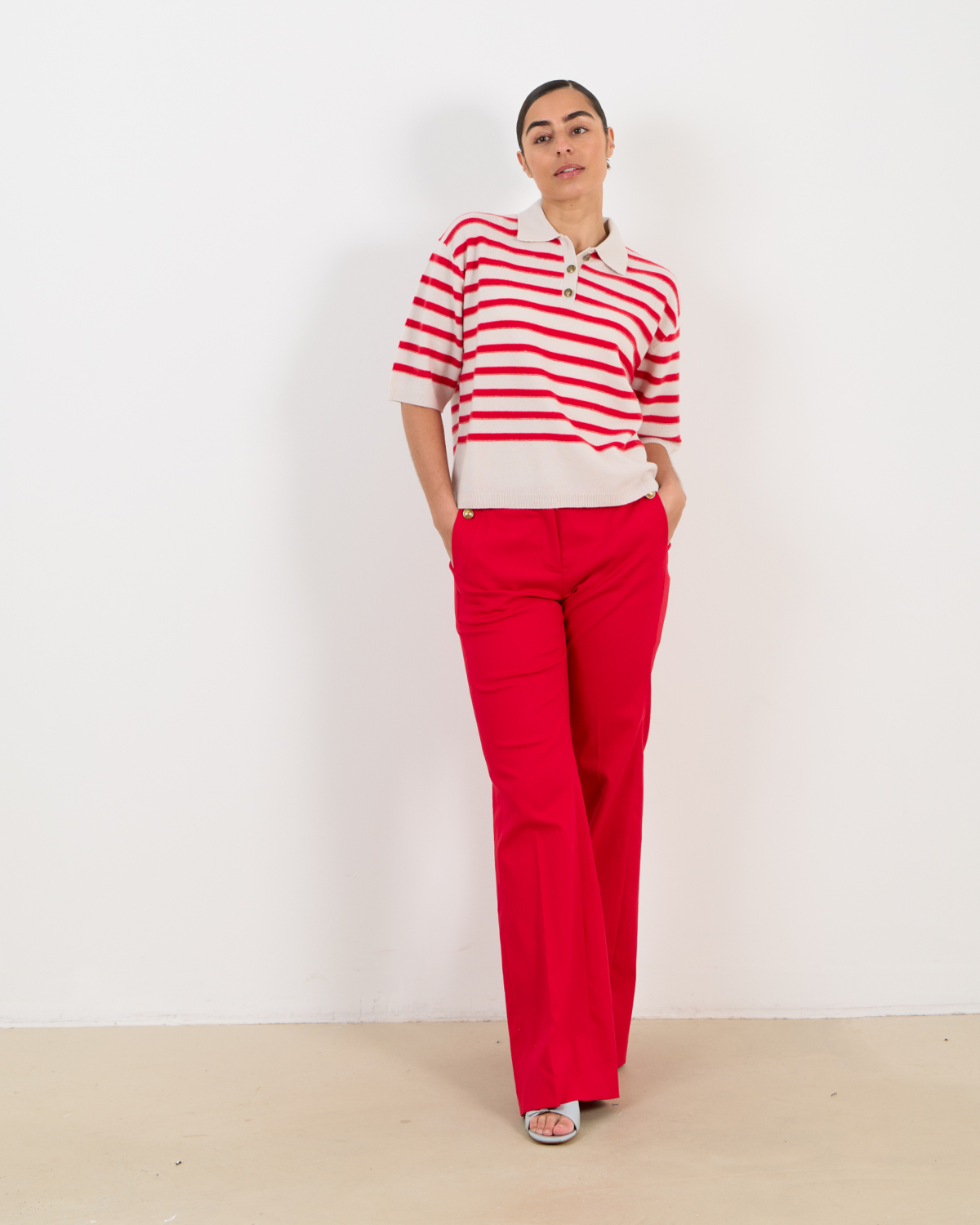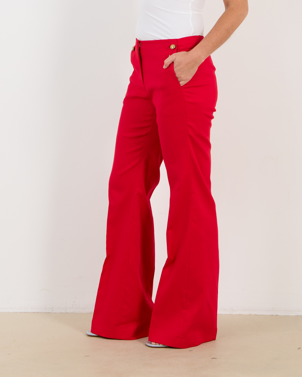 These striking red trousers from Luisa Cerano make a bold statement in women's clothing. The vibrant cherry red cotton blend fabric (97% cotton, 3% elastane) offers comfortable stretch and sophisticated color. Gold-toned button details on the waistband add an elegant touch to the wide-leg silhouette. The high-waisted design creates a flattering fit, while side pockets provide practical functionality. These full-length trousers feature a clean finish and structured tailoring that elevates any outfit.