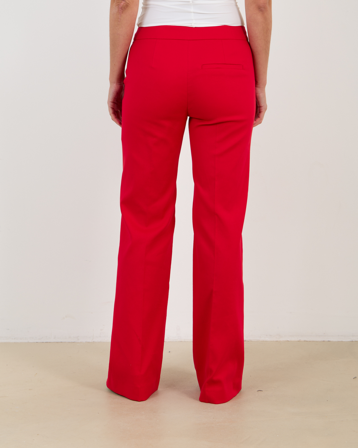 Style these red statement trousers with crisp white shirts for professional looks or pair with neutral blazers for refined business attire. Combine with silk blouses in cream or black tones for evening occasions, or team with fitted knits for contemporary casual styling.