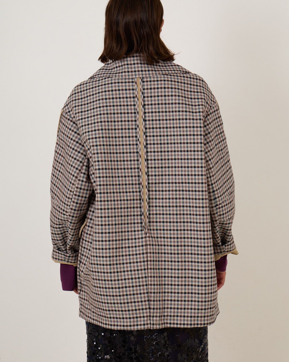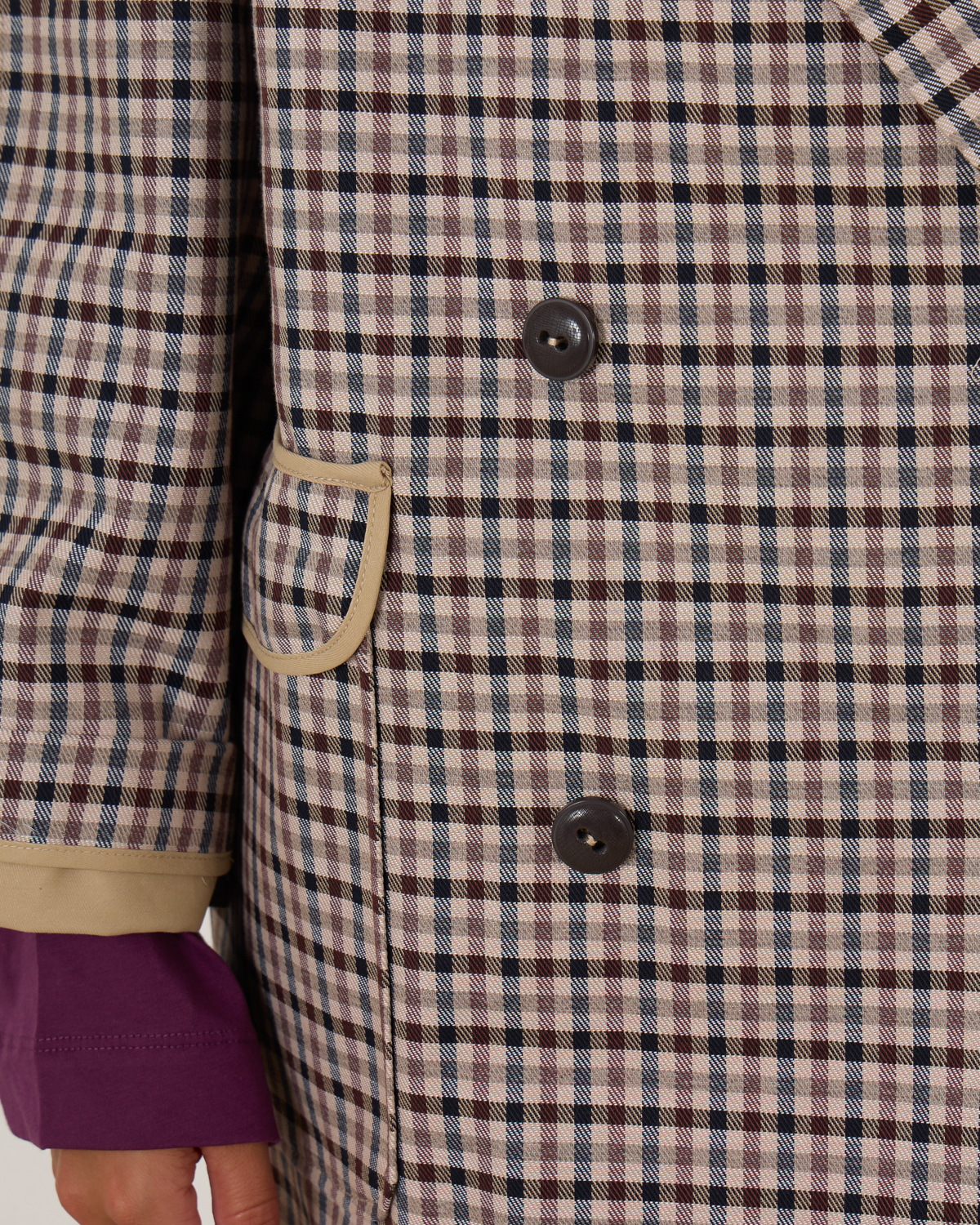 De Baticia blazer is dé blikvanger van het seizoen, uitgevoerd in een stoere geruite katoenmix met een waterafstotende finish. De oversized pasvorm en de klassieke kraag geven de jas een tijdloze uitstraling, versterkt door de double-breasted knoopsluiting en de elegante split aan de achterkant. Met zijn midi-lengte, extra lange mouwen en praktische opgestikte zakken is dit een stijlvolle en functionele laag waarin je je graag hult.