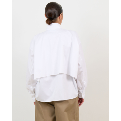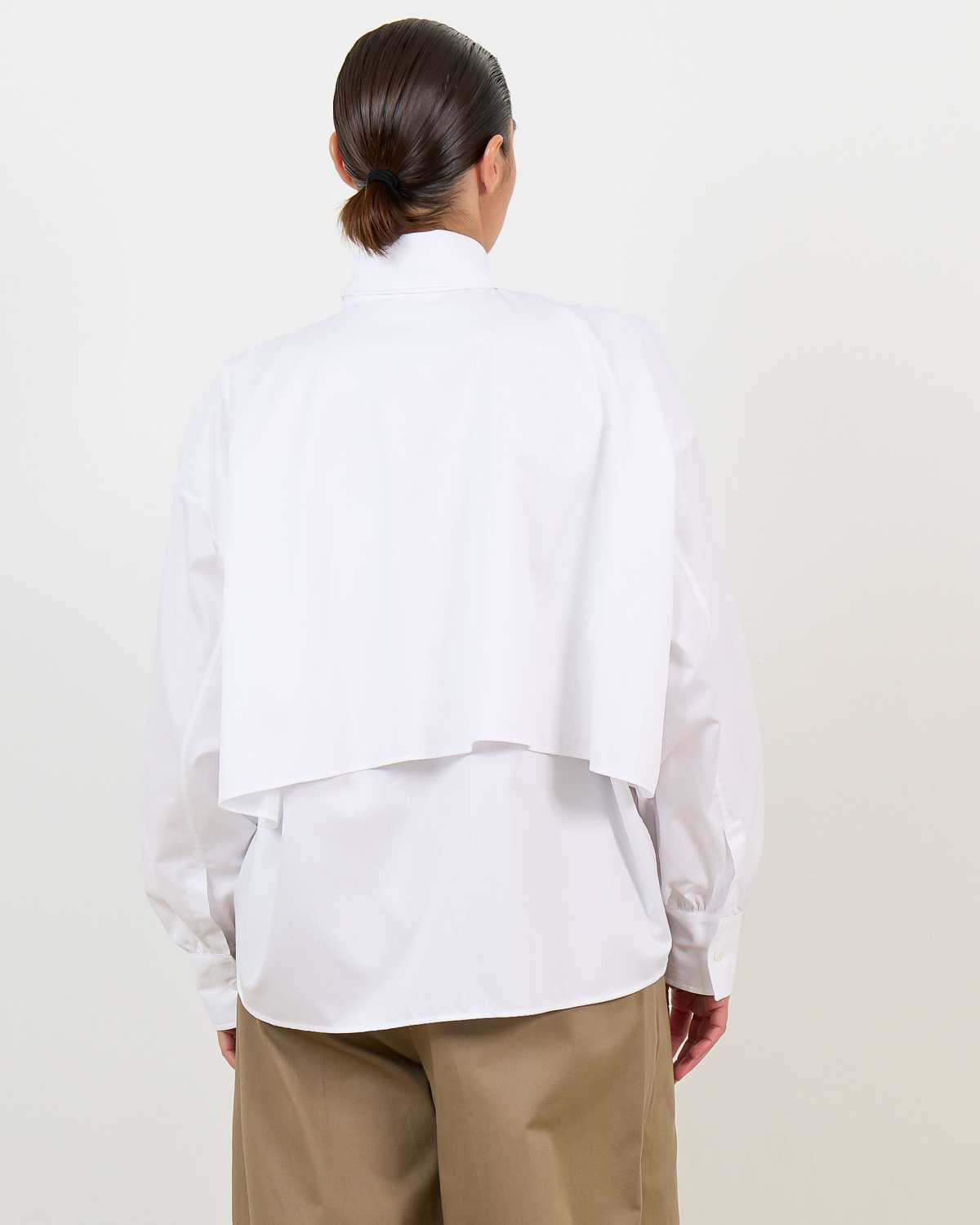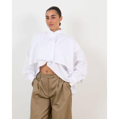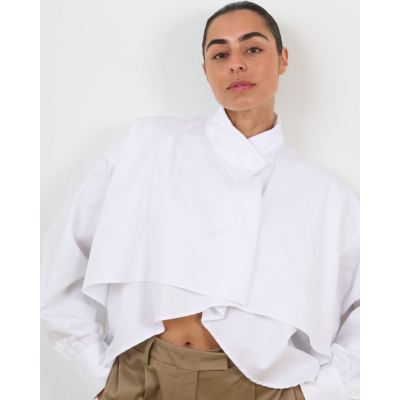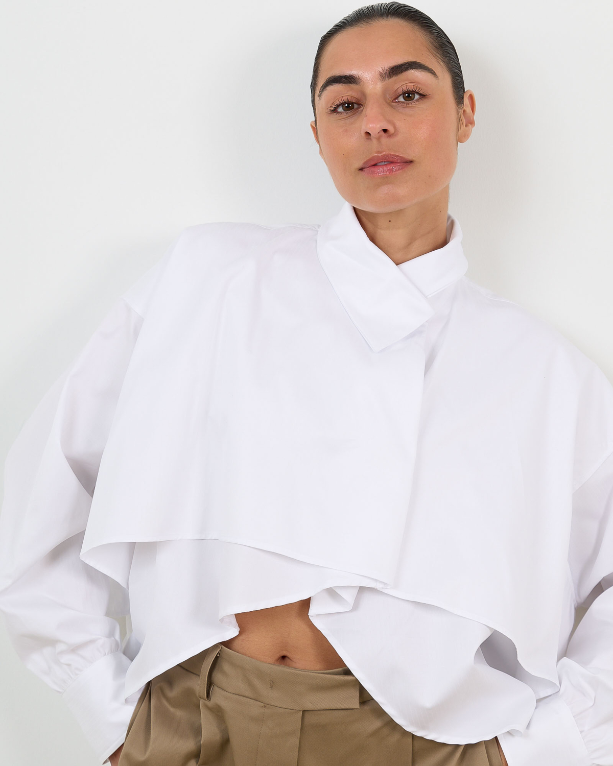 This striking white shirt blouse redefines contemporary women's clothing with its distinctive crossed collar design. Crafted from 100% cotton, this Margaux Lonnberg piece features long sleeves and an oversized fit that creates a bold, architectural silhouette. The unique collar detail wraps elegantly around the neckline, while the cropped length adds a modern twist to classic shirt styling.