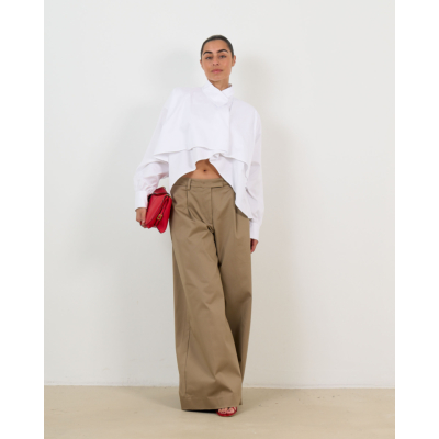 Style this statement piece with high-waisted trousers for a sophisticated look, or pair with wide-leg pants to emphasize the dramatic proportions. The white cotton fabric makes it perfect for layering under blazers or wearing solo with tailored bottoms.