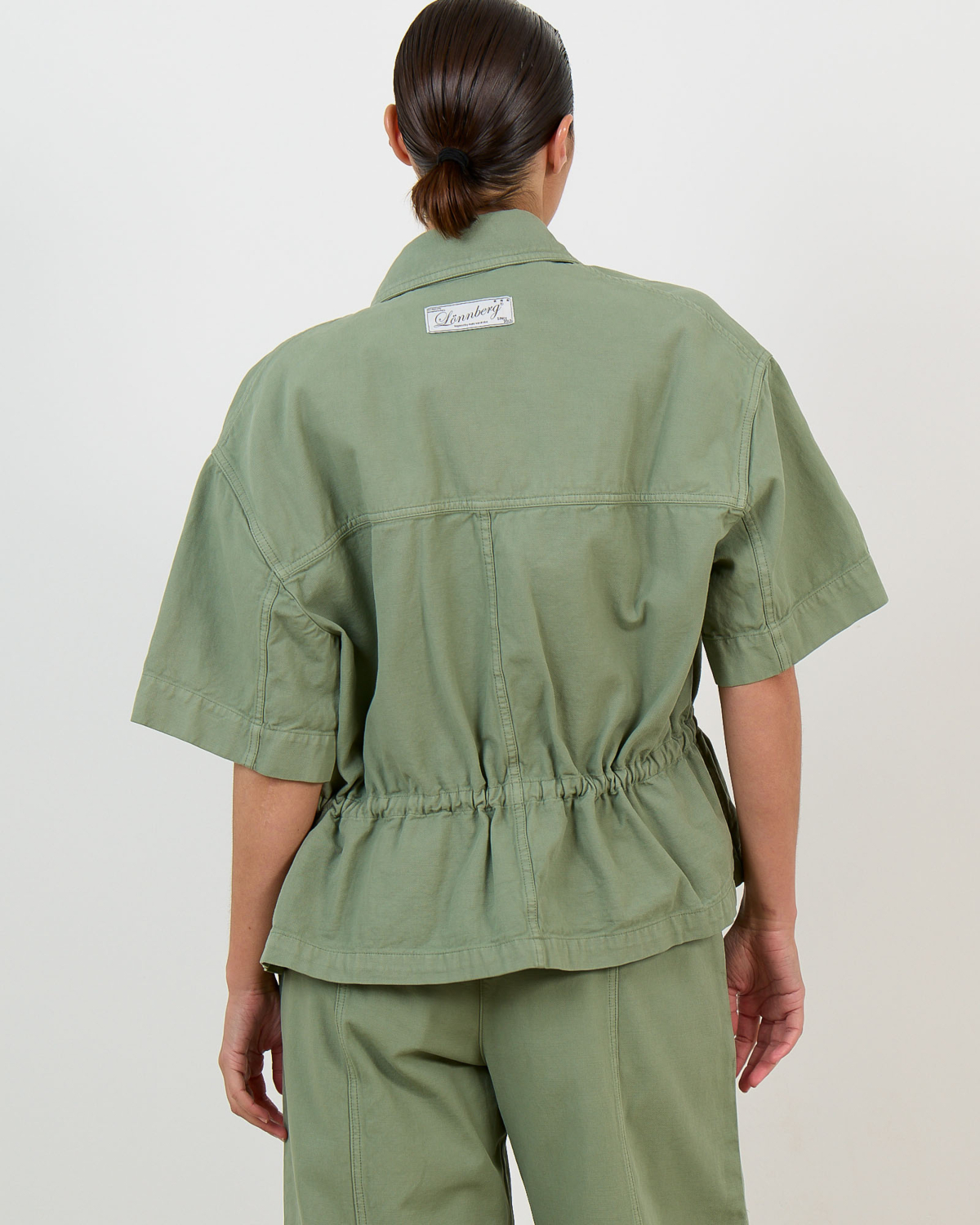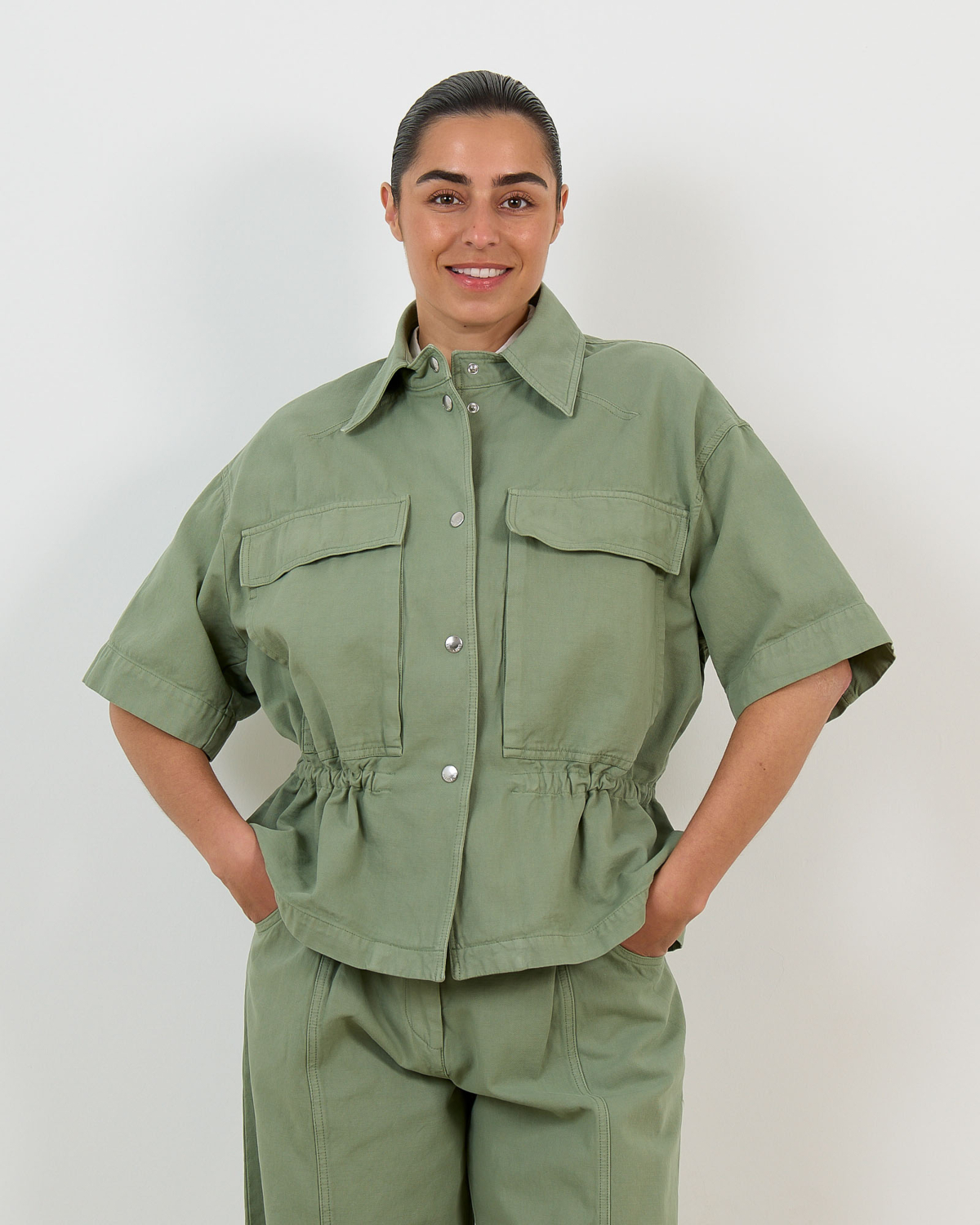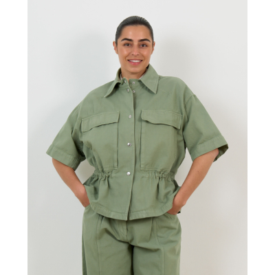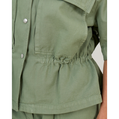 This green cinched waist blouse from Margaux Lonnberg brings contemporary women's clothing to your style collection. Crafted from 100% cotton, this loose fit blouse features short sleeves with rolled cuffs and a classic collar. The button-front closure with silver buttons creates a clean finish, while two chest pockets add functional detail. The cinched waist with elastic gathering creates a flattering silhouette that defines the waistline beautifully.