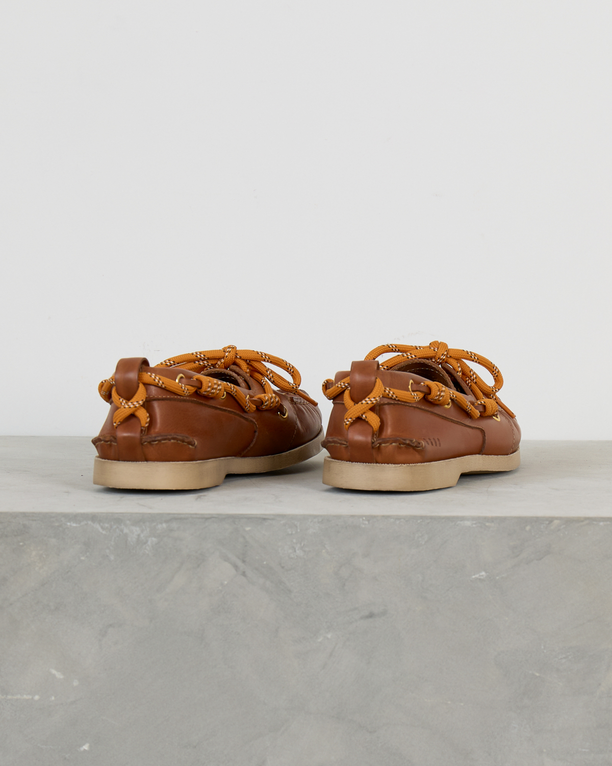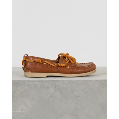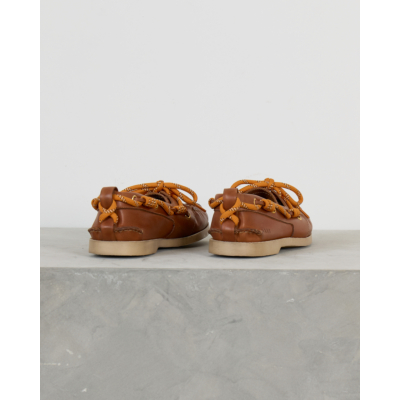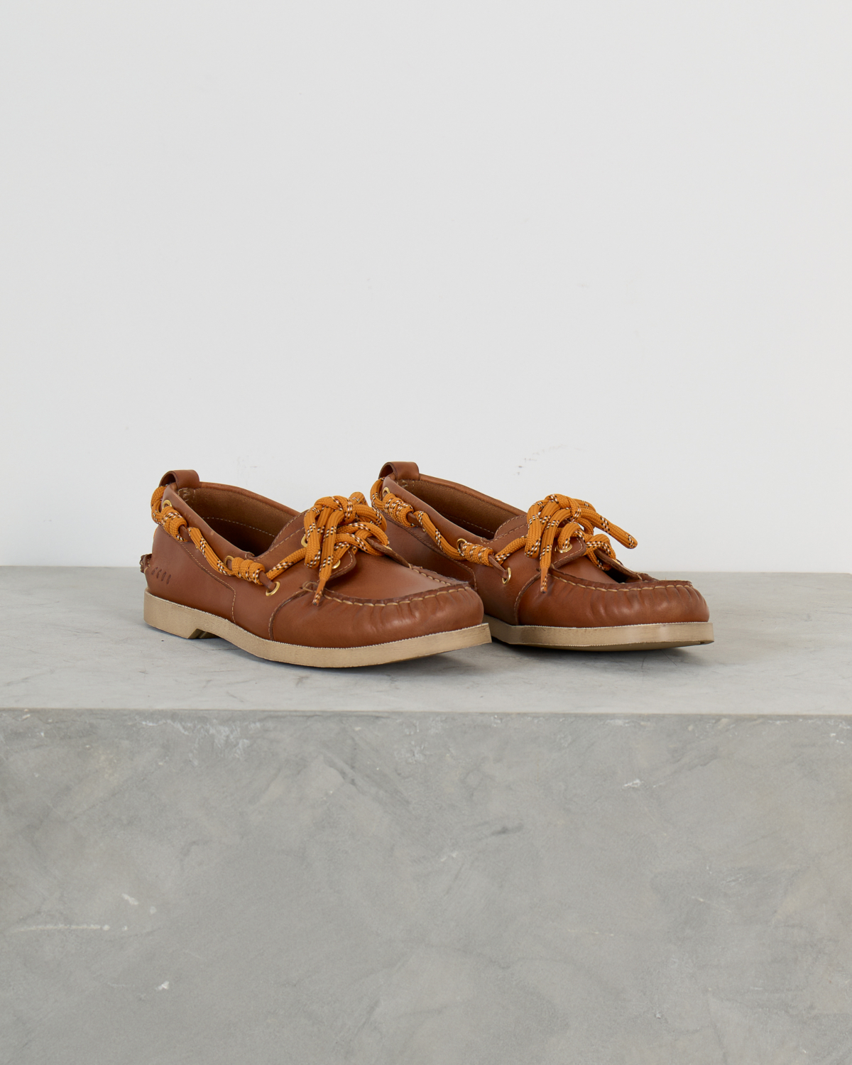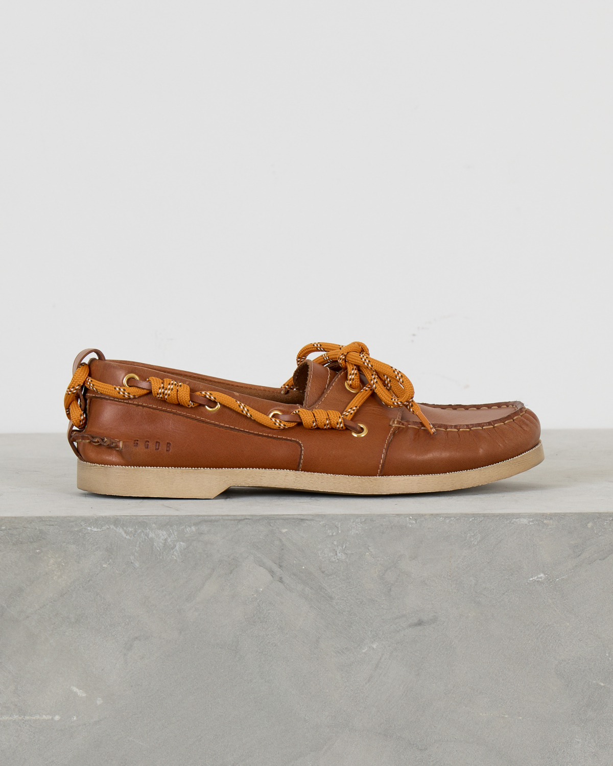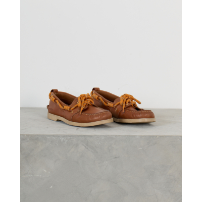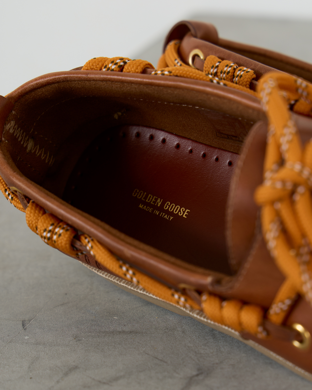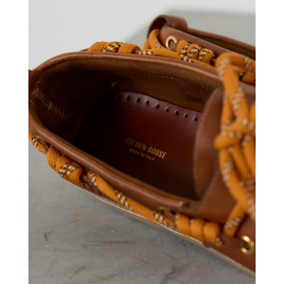 These camel leather boat shoes from Golden Goose bring nautical sophistication to your women's clothing collection. Crafted from premium leather in a rich camel tone, these loafers feature hand-stitched moccasin construction and distinctive orange rope laces with black detailing. The contrast rubber sole provides comfort and durability. Gold-tone eyelets add refined finishing touches to this classic boat shoe silhouette.