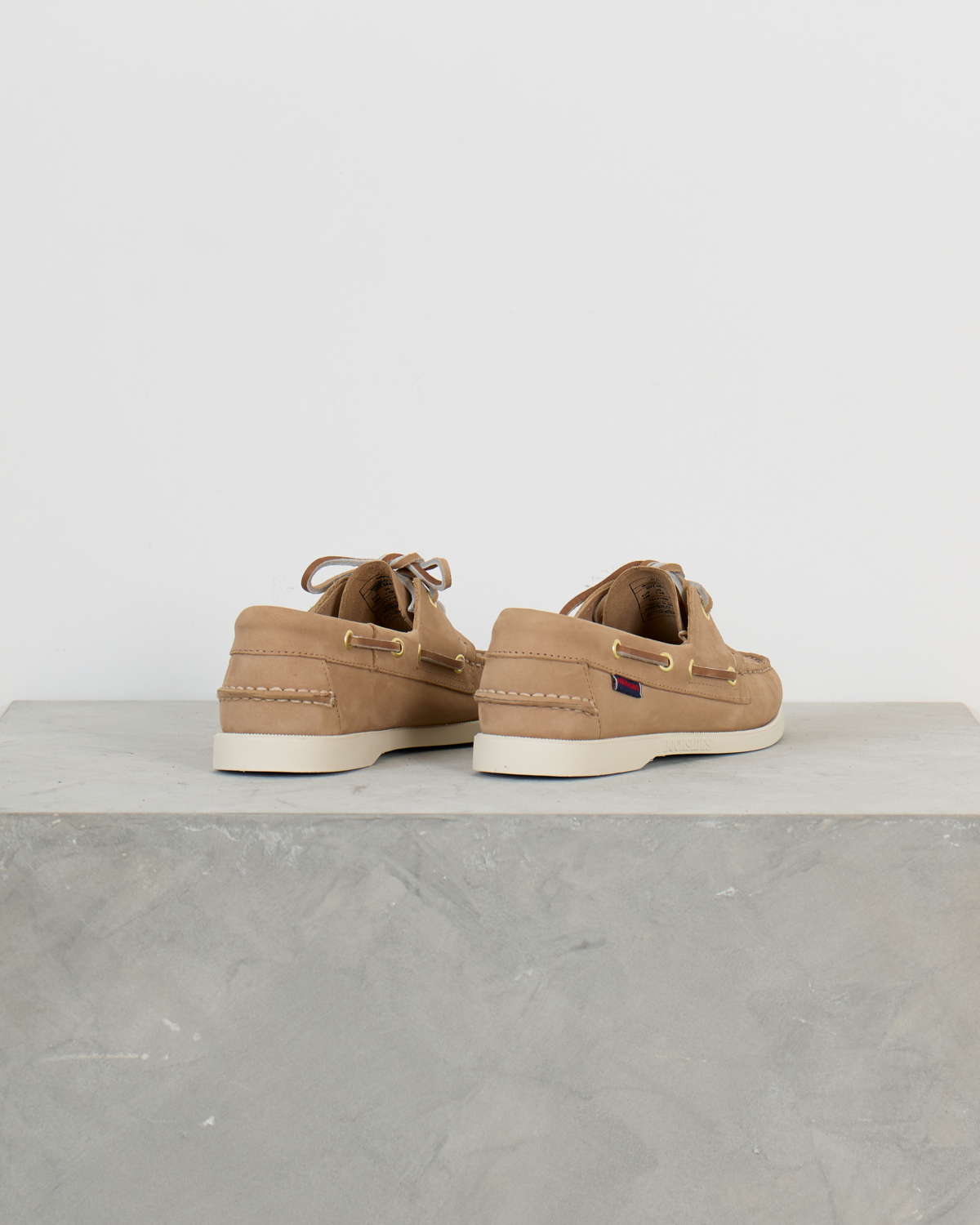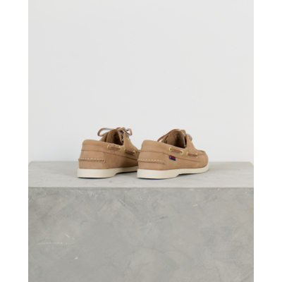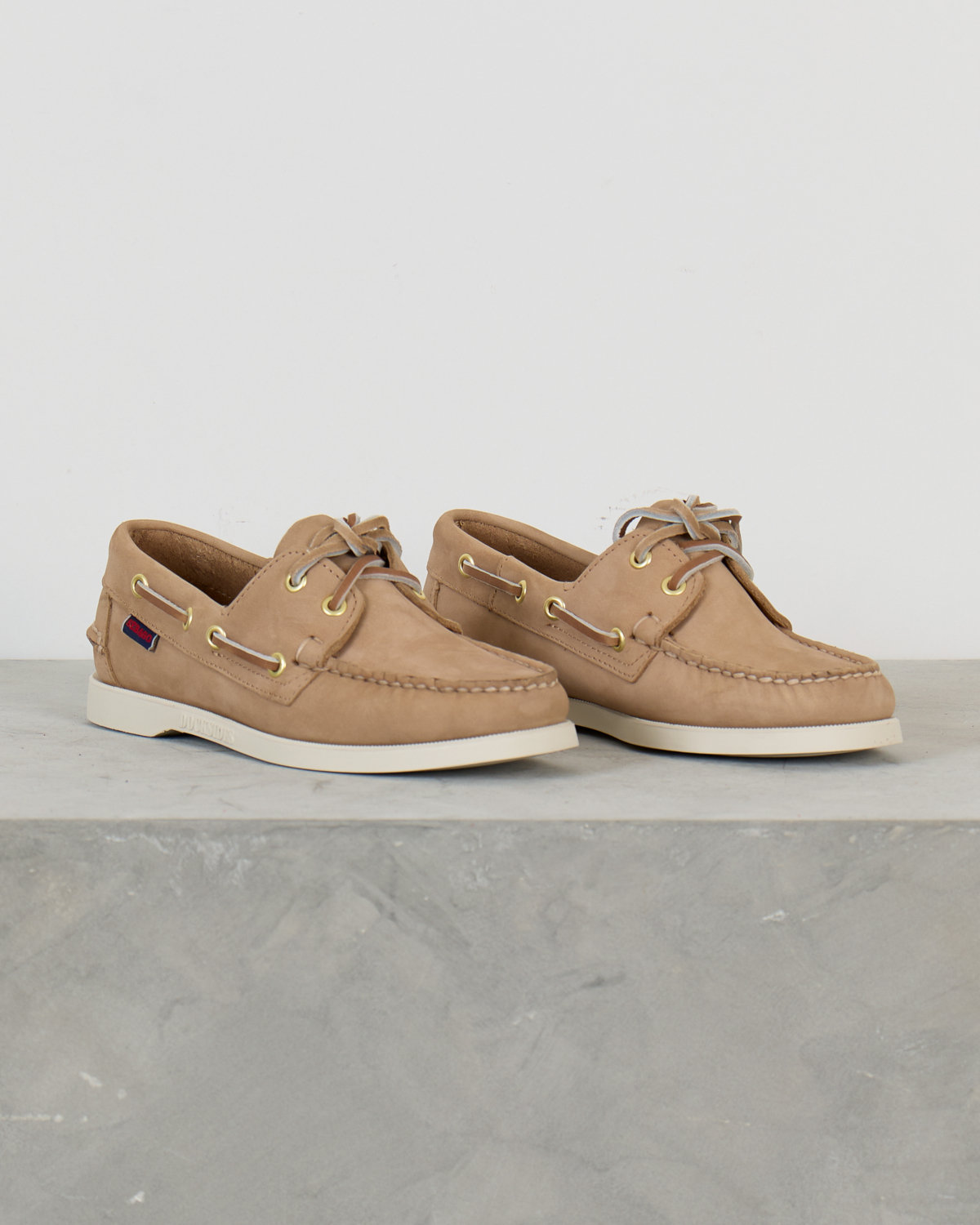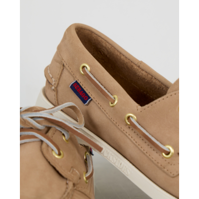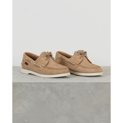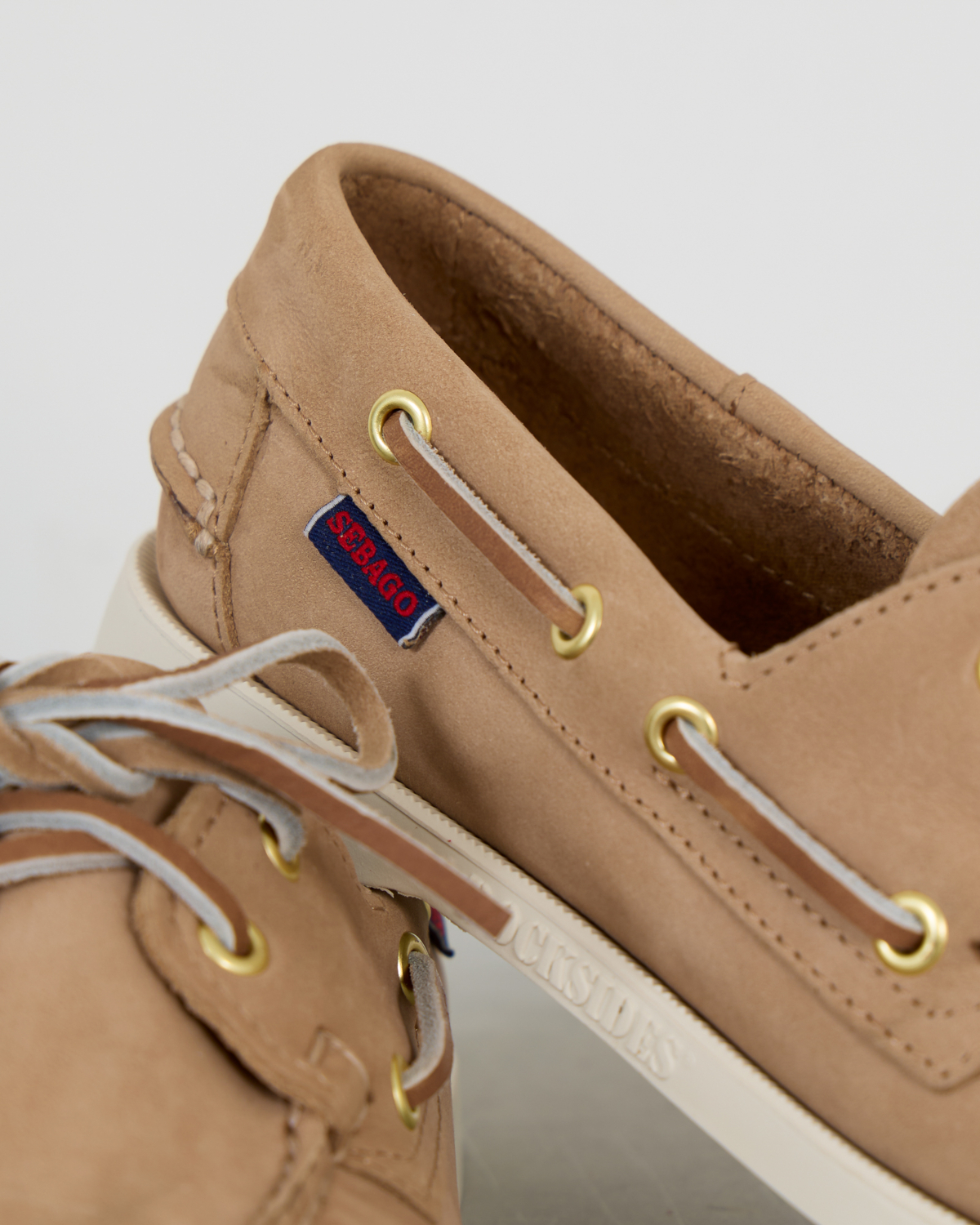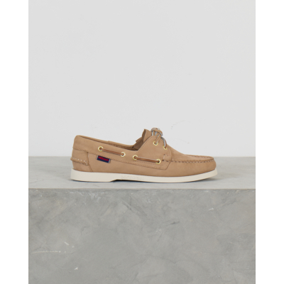 These Portland boat loafers in warm beige showcase the authentic maritime heritage of Sebago. Crafted from premium leather with traditional hand-stitched moccasin detailing, these women's clothing essentials feature classic lace-up closure with gold eyelets and signature brand logo. The contrast white sole and decorative stitching create a refined nautical aesthetic. The leather construction ensures durability while maintaining the relaxed elegance that defines quality boat shoes.