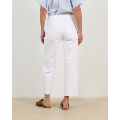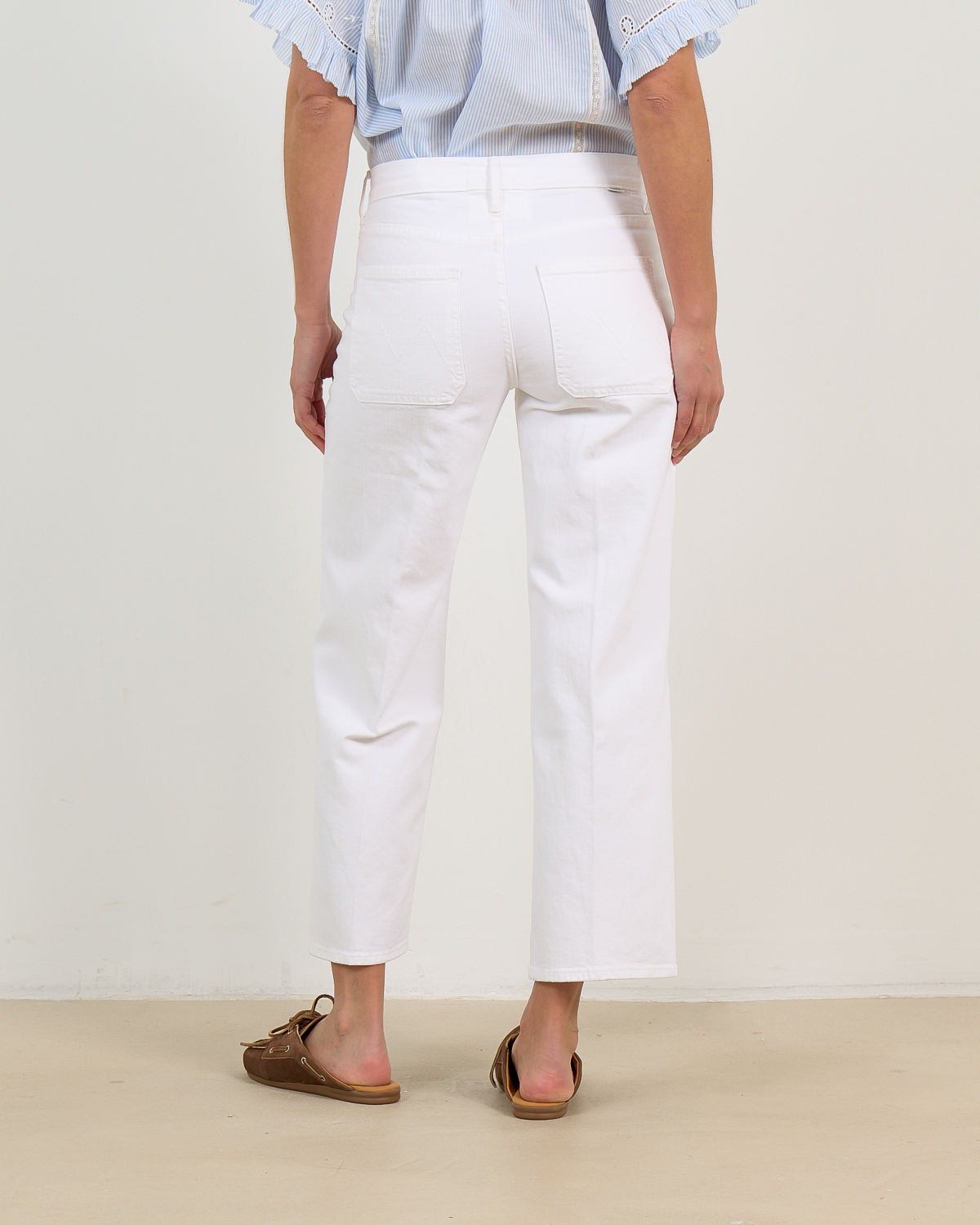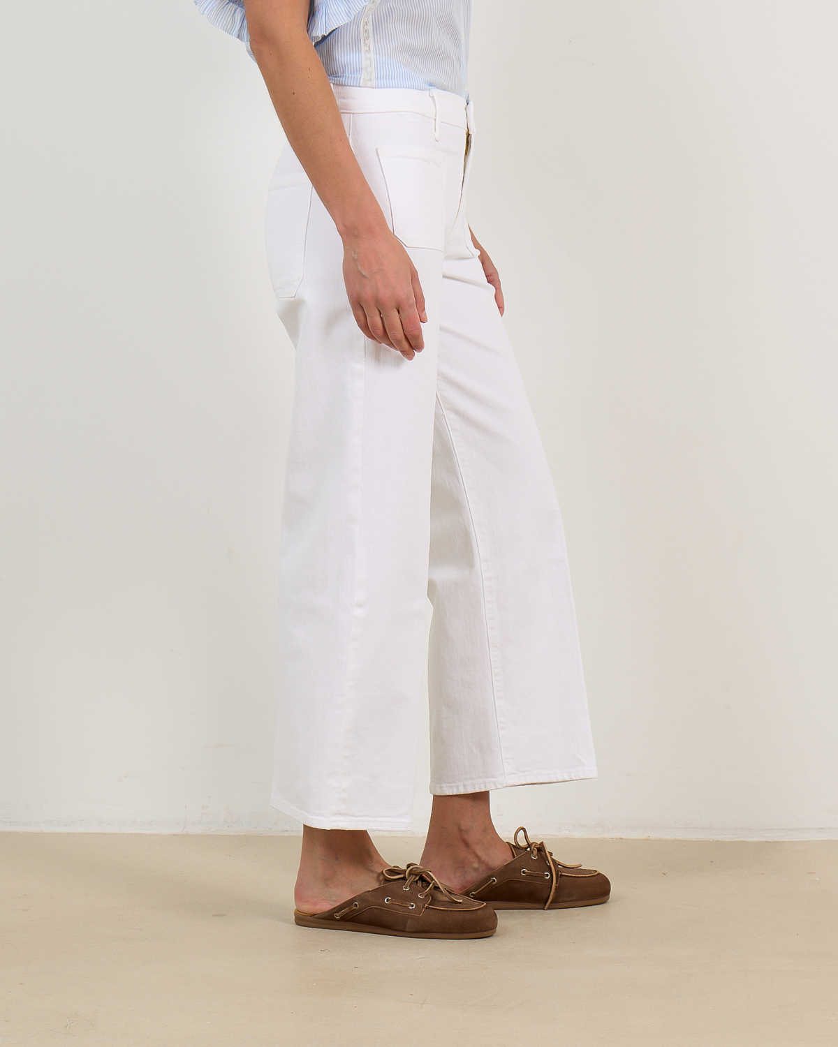 Style these white denim pieces with a crisp button-down shirt for polished casual looks, or pair with a flowing blouse for relaxed weekend styling. The neutral shade complements both vibrant prints and classic stripes, while the cropped length looks elegant with both flat sandals and low-heeled mules.