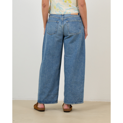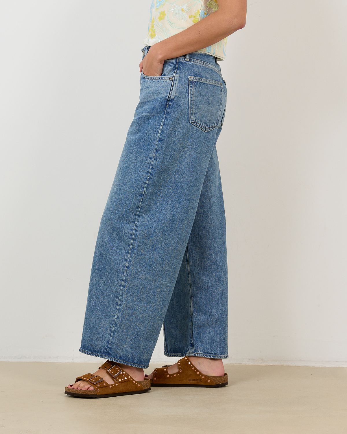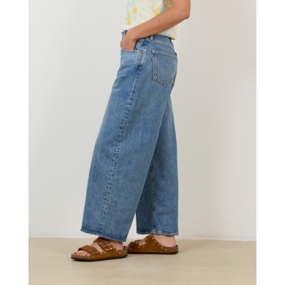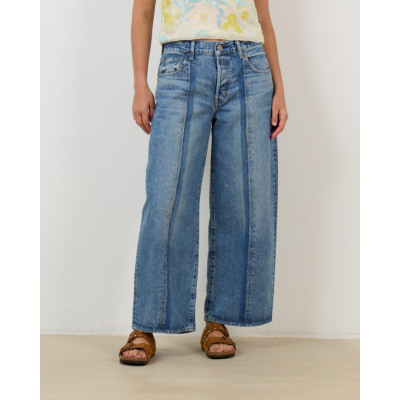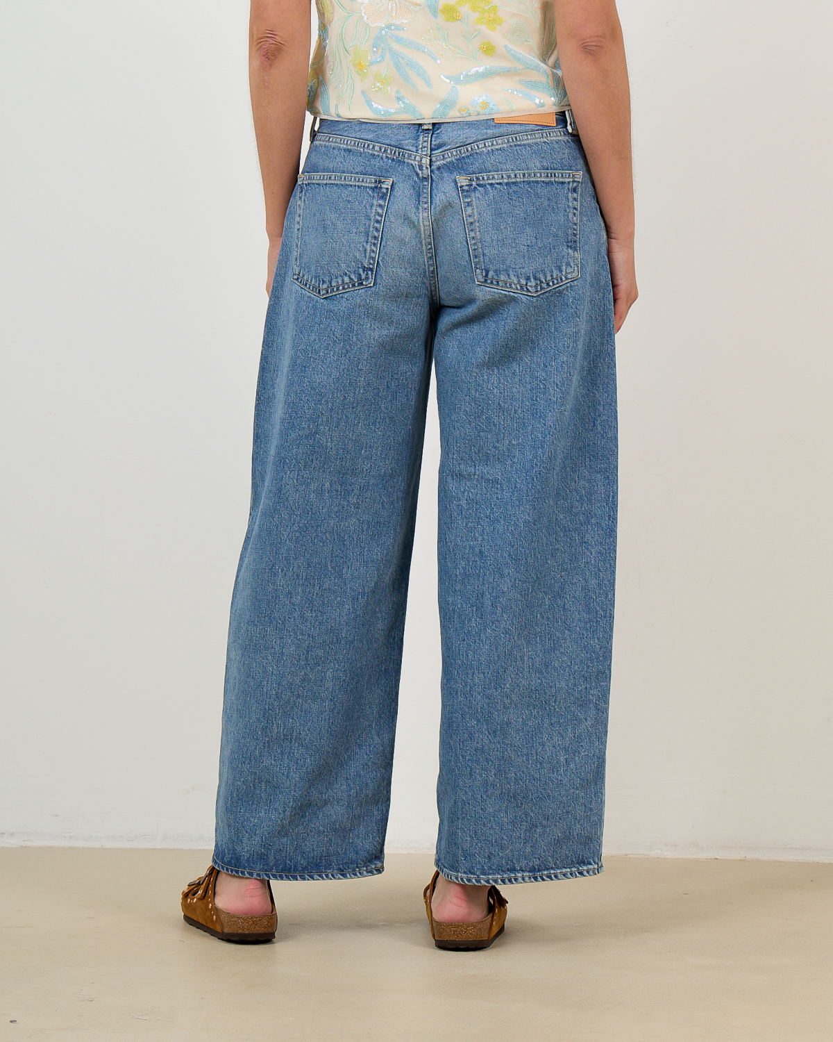 These wide leg denim jeans from Moussy showcase a relaxed silhouette in classic blue. Crafted from 100% cotton, these women's clothing pieces feature raw edge detailing at the hem for contemporary appeal. The high-rise waistband includes traditional button closure and belt loops, while the wide leg cut creates an elegant flowing shape. Five pocket styling with back patch pockets completes the timeless denim design.