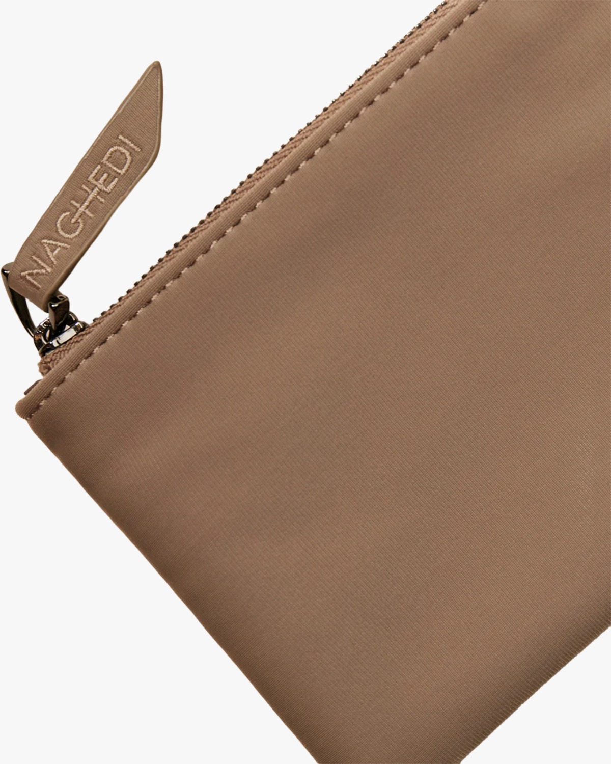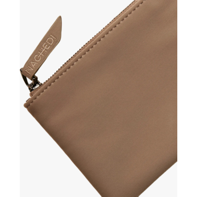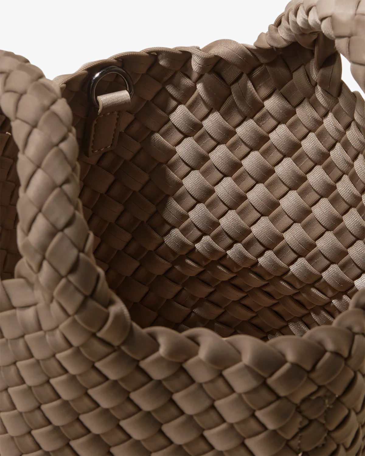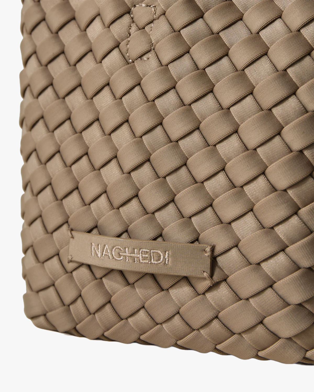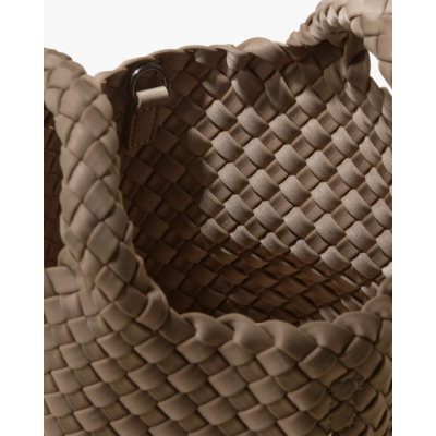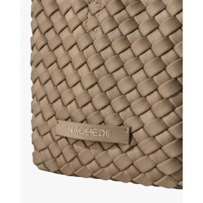 This small woven handbag in beige showcases sophisticated craftsmanship with its distinctive woven neoprene construction. The intricate basketweave pattern creates texture and visual interest throughout the entire bag. Features include braided top handles, a detachable matching shoulder strap, and a zip closure with branded zipper pull. The Naghedi brand label sits elegantly on the front, while the smooth neoprene material offers both durability and modern appeal. This compact size makes it ideal for essentials while maintaining an elevated aesthetic.
