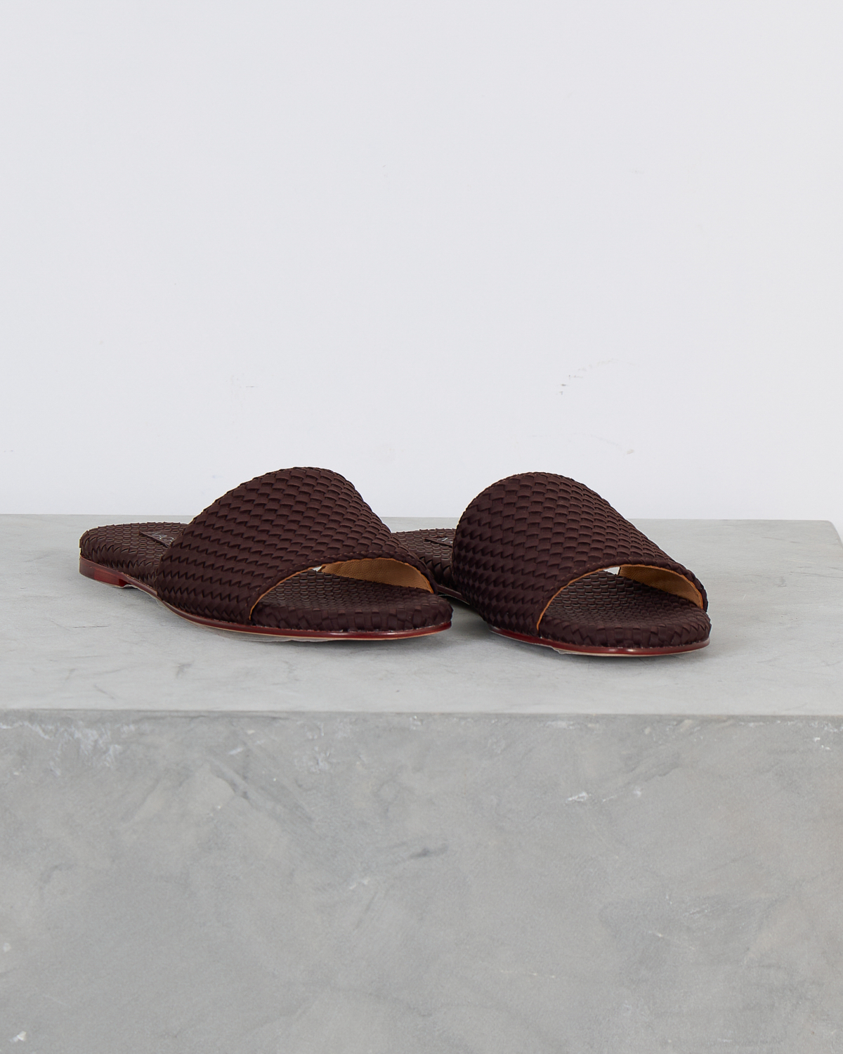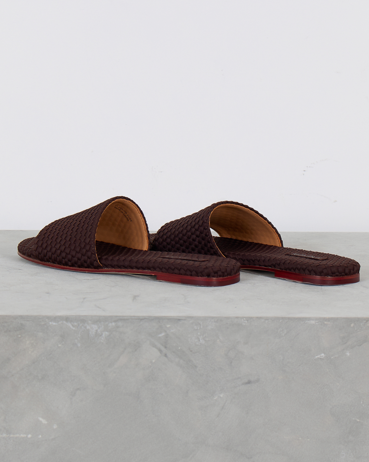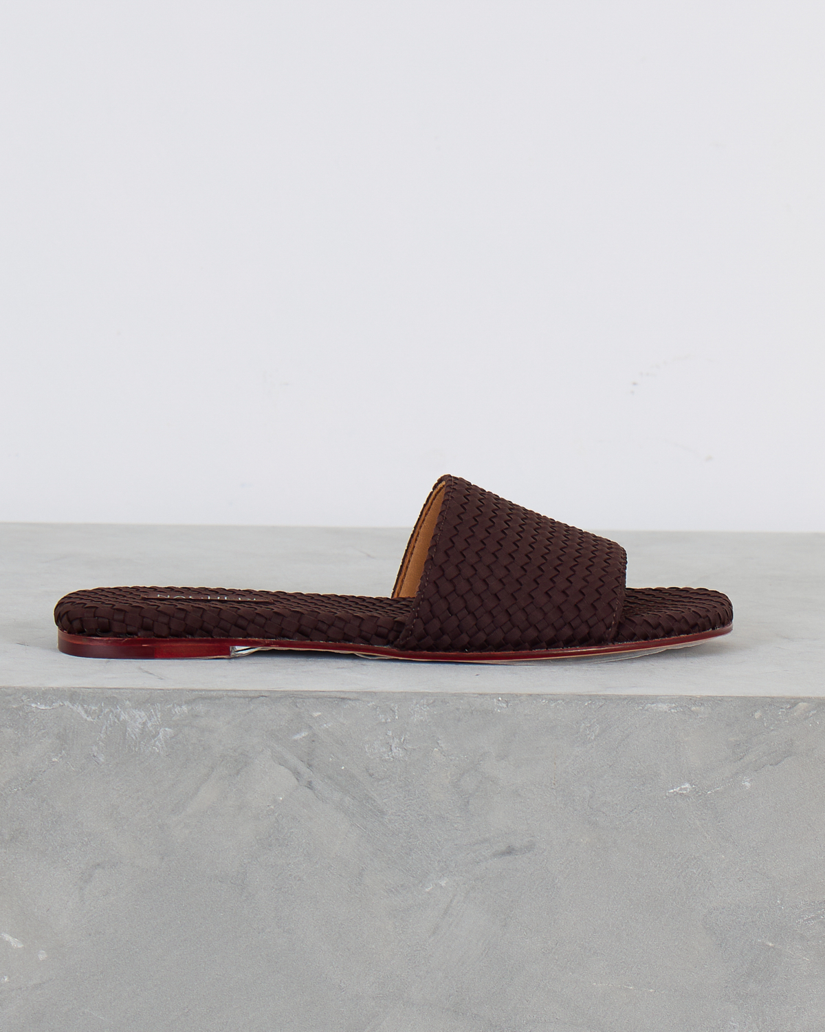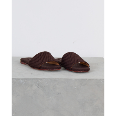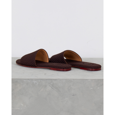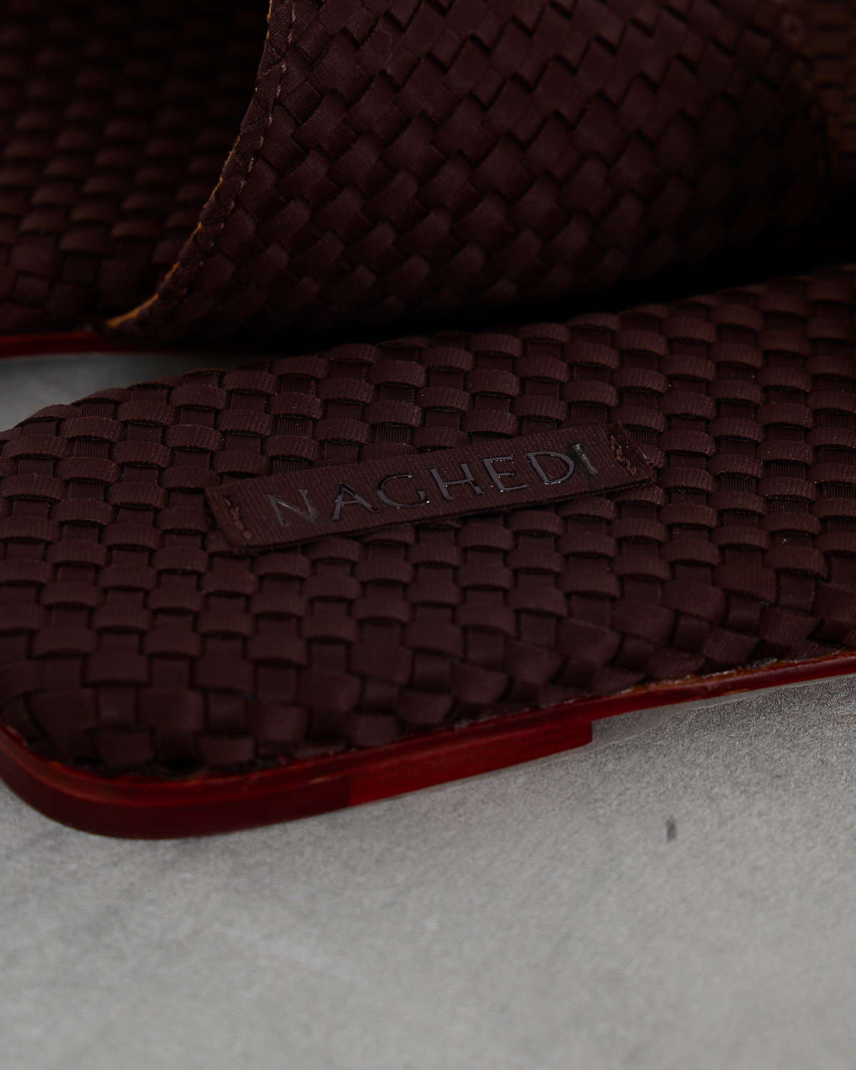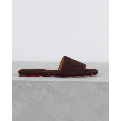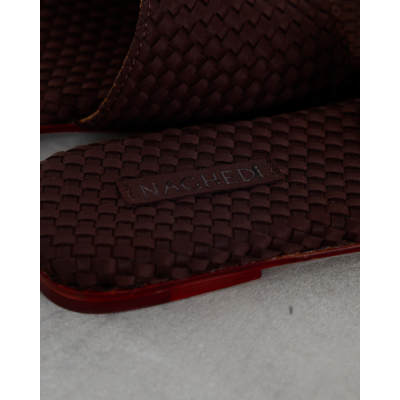 These sophisticated chocolate brown slides showcase exquisite woven leather craftsmanship that elevates any women's clothing ensemble. The intricate basketweave pattern creates rich texture and visual depth across the upper strap and footbed. Premium leather construction ensures durability while the flat profile delivers comfortable all-day wear. A distinctive red accent sole adds an unexpected pop of color that makes these slides truly stand out. Created by Naghedi, these artisanal slides represent the perfect blend of contemporary design and timeless appeal.