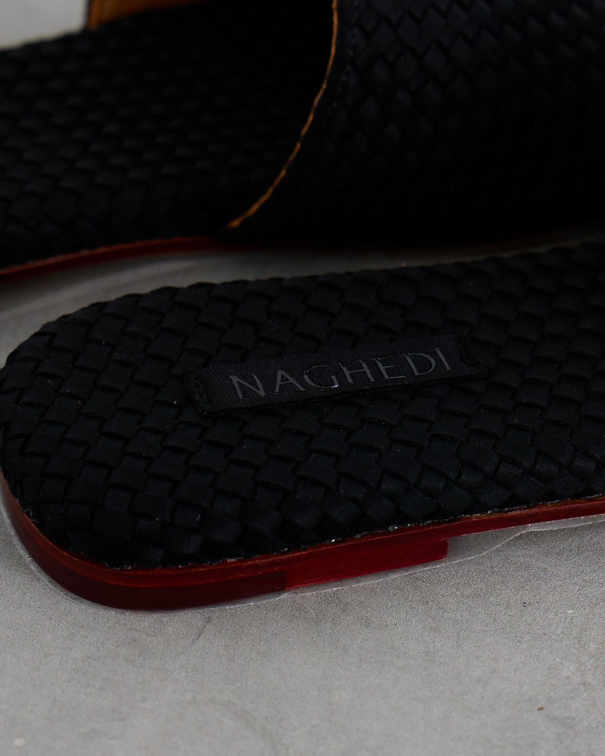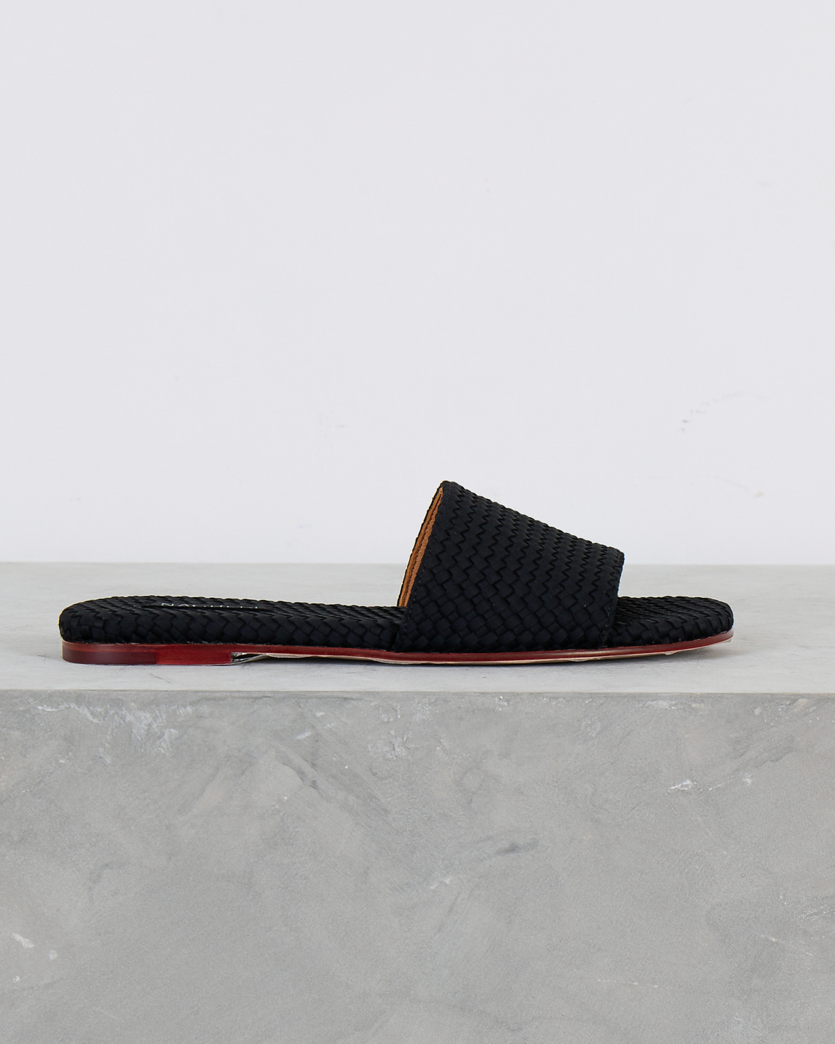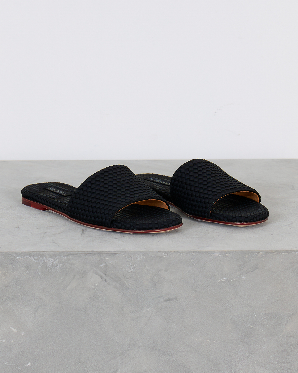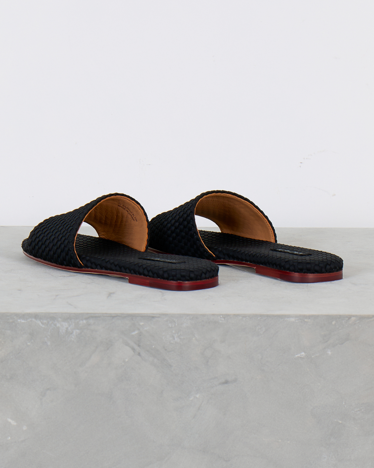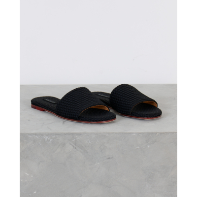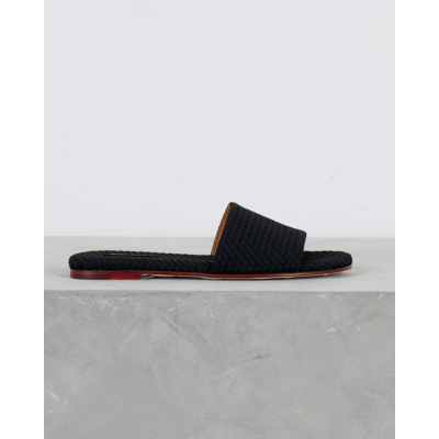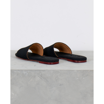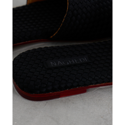 These sophisticated black leather slides feature an eye-catching woven texture that adds depth and visual interest to your women's clothing collection. The premium leather construction showcases intricate basketweave detailing across the wide band, while the flat sole provides all-day comfort. Rich cognac leather lining contrasts beautifully with the black exterior, and the burgundy-toned sole adds a luxurious finishing touch. From Naghedi, these slides embody refined craftsmanship with their textured leather pattern and quality construction.