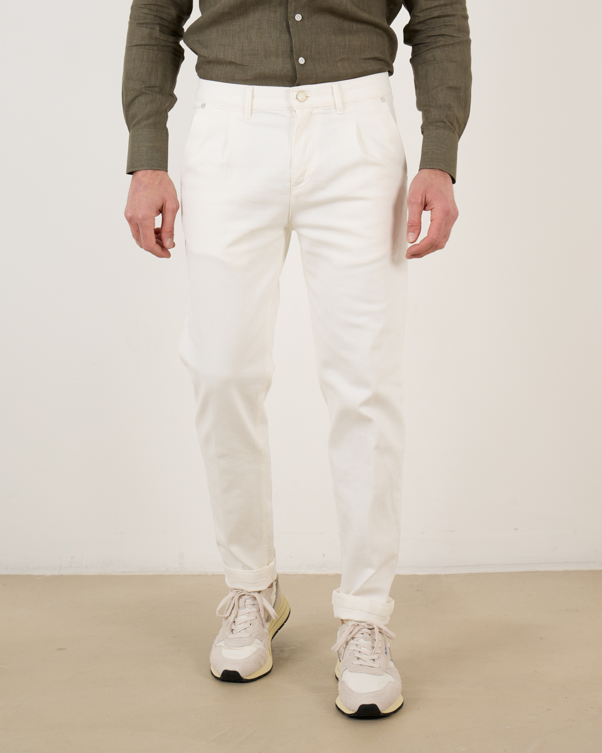 Style these white cotton trousers with navy blazers for smart-casual occasions, or pair them with linen shirts and loafers for refined summer looks. The neutral white shade complements earth-toned knitwear and works particularly well with olive green shirts for contemporary contrast. Perfect with leather sneakers for weekend styling or dress shoes for more formal settings.