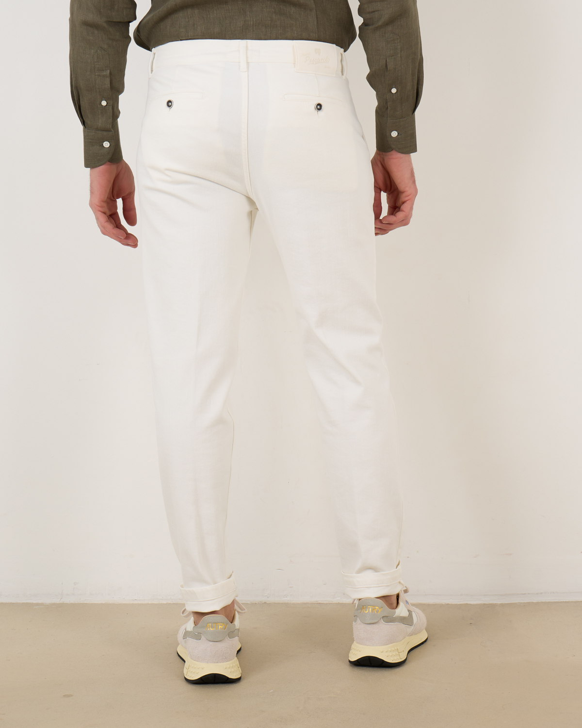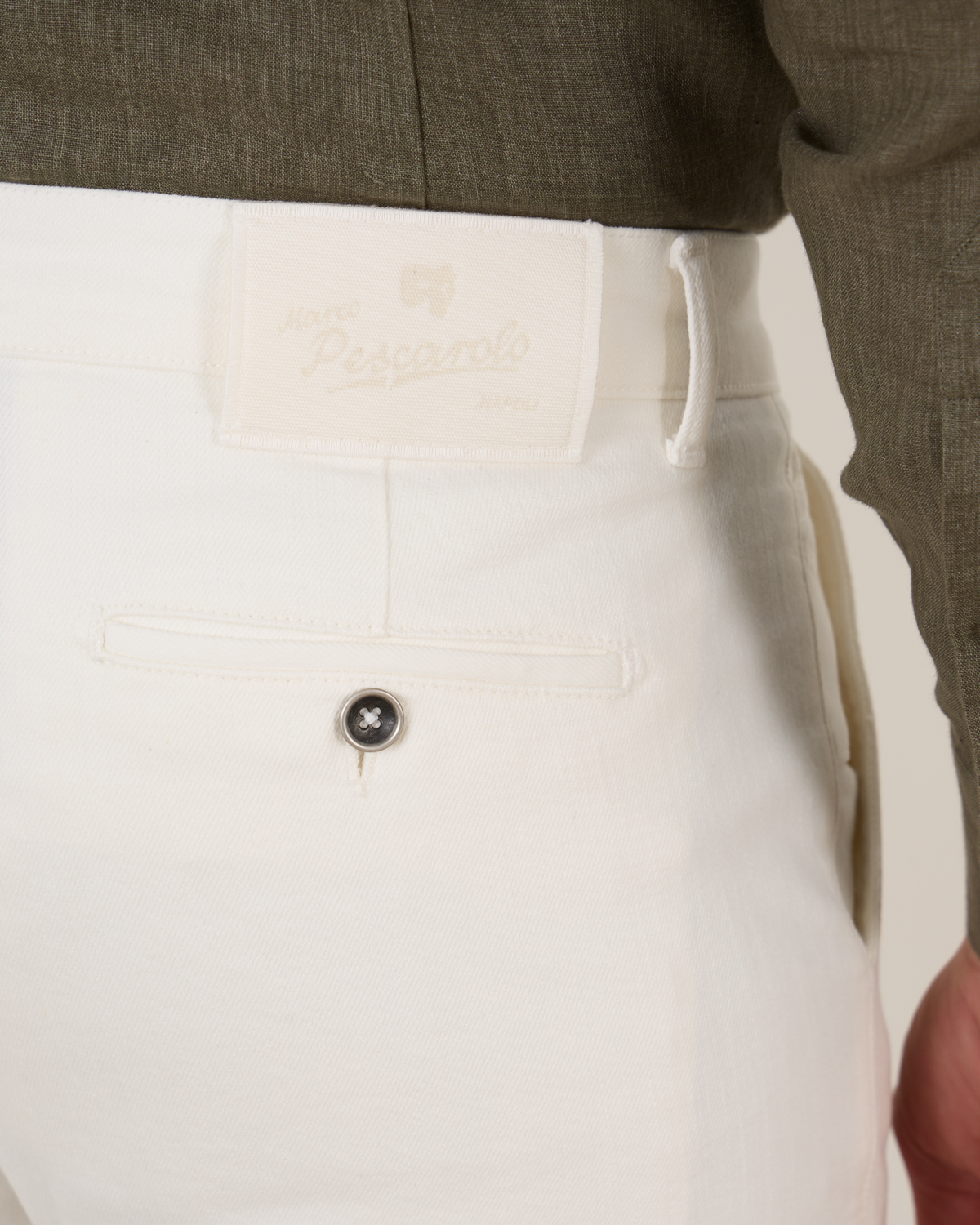 The white Scott trousers from Marco Pescarolo showcase refined Italian craftsmanship in a crisp cotton construction. These classic chinos feature a clean white finish with distinctive side-adjusters at the waistband for personalized comfort. The straight-leg silhouette offers a contemporary fit, while welt pockets at the back and slanted front pockets provide functional storage. Finished with branded buttons and a zip fly closure, these men's clothing essentials deliver both style and versatility.