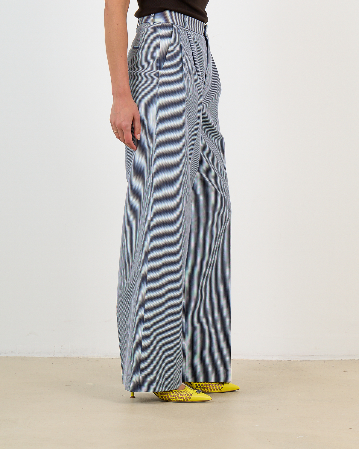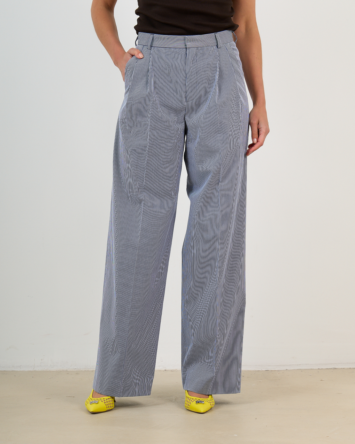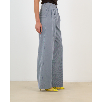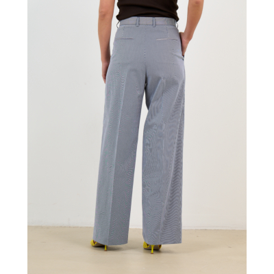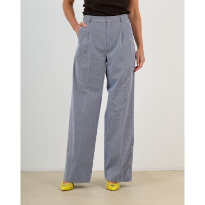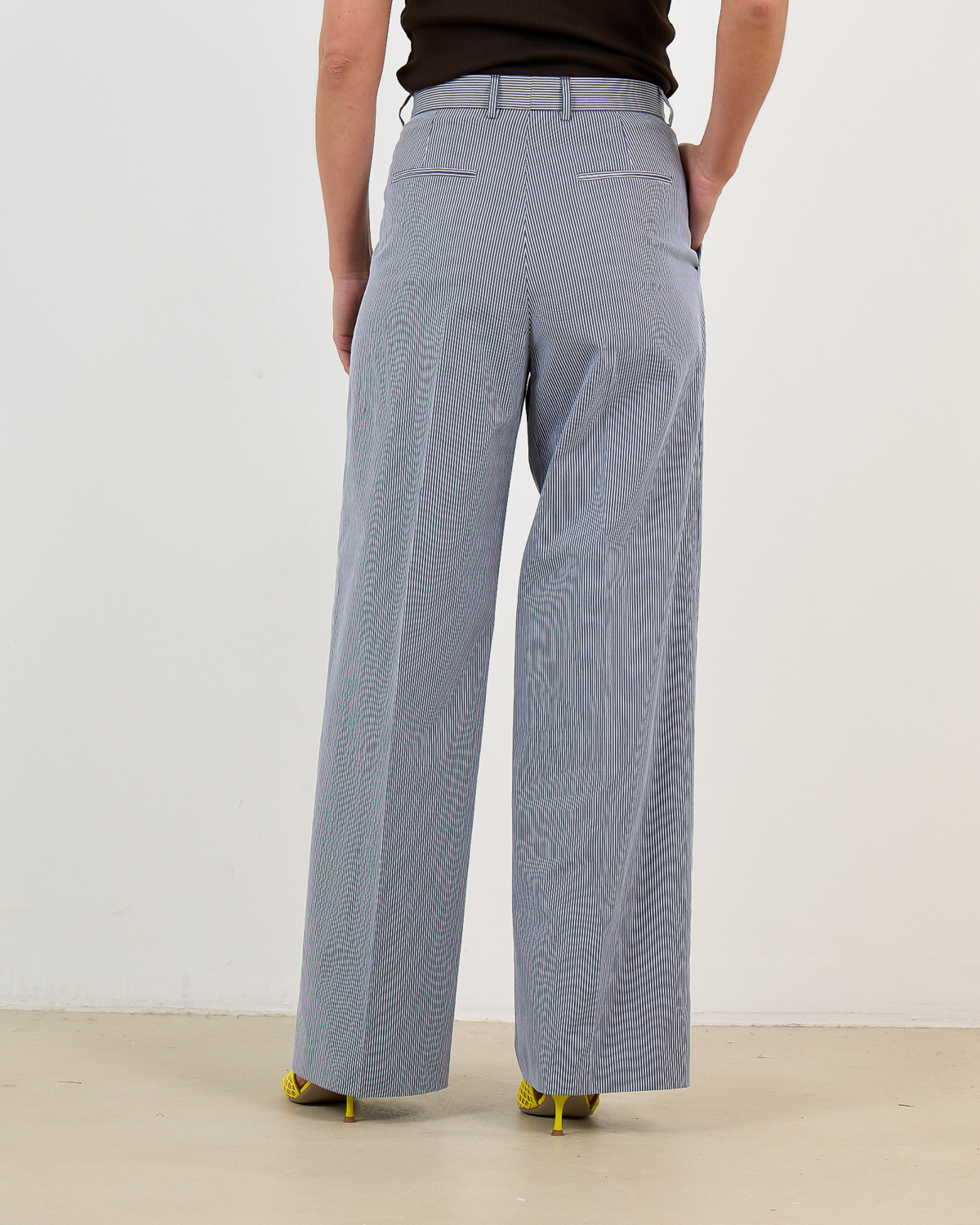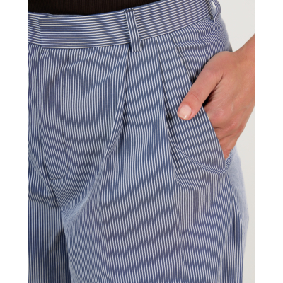 These elegant striped trousers showcase refined navy and white pinstripes crafted from 100% cotton. The regular fit design features a high waisted silhouette with a wide leg cut that creates a sophisticated statement. The tailored construction includes front pockets and belt loops at the waistband. Indress delivers timeless women's clothing that balances comfort with contemporary style. The navy striped pattern adds visual interest while maintaining versatile appeal for modern wardrobes.