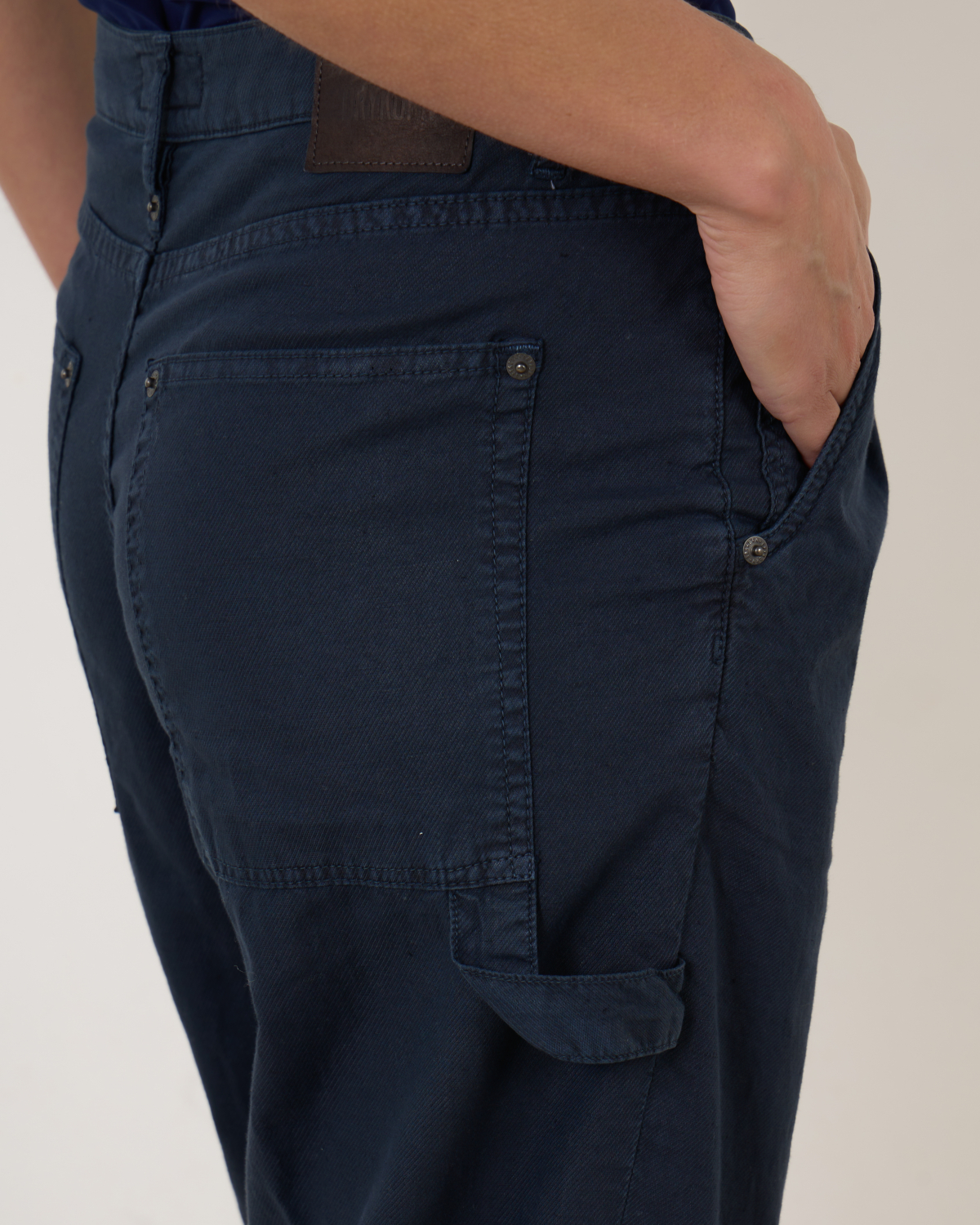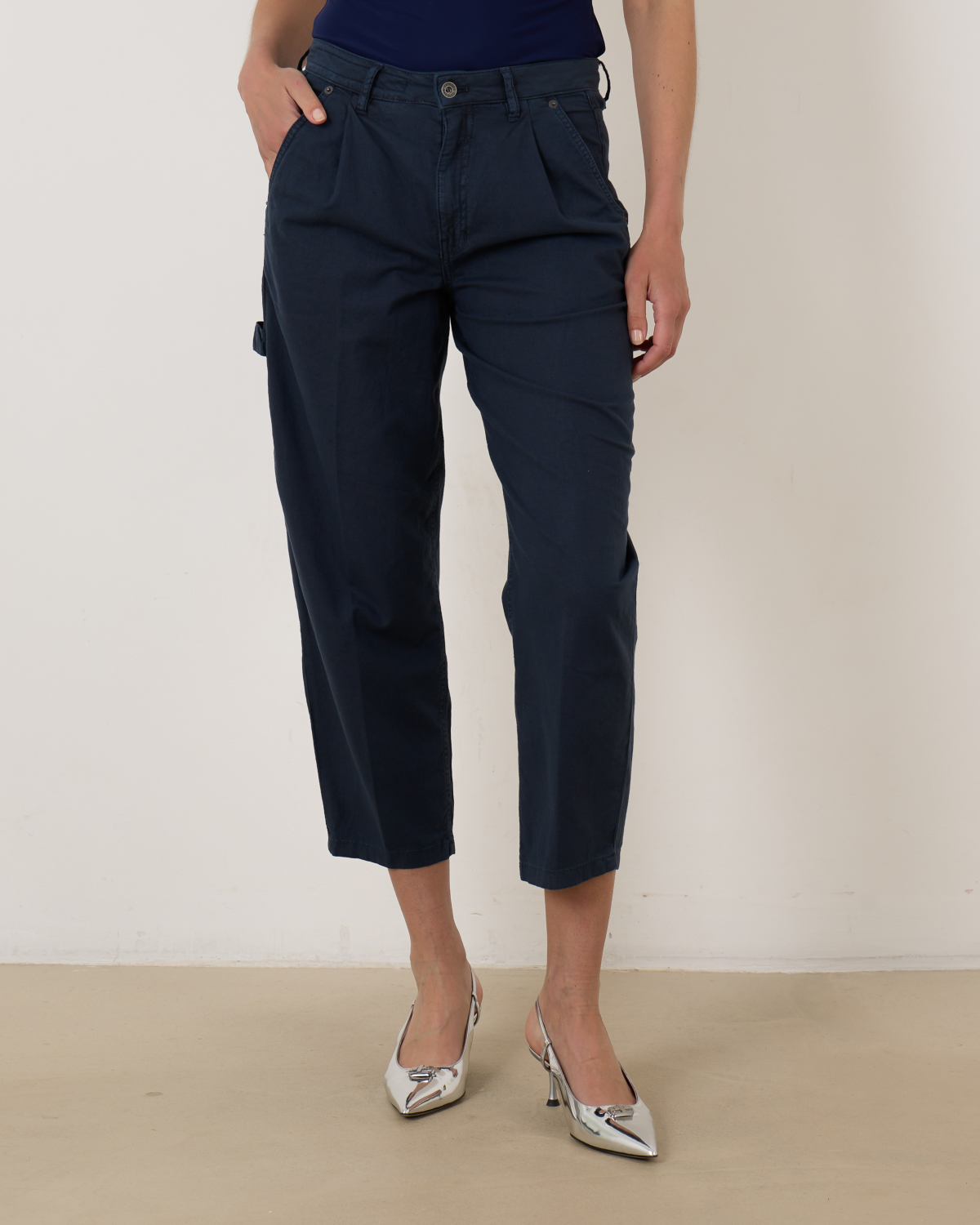 De Drykorn Qualify in navy is een eigentijdse 5-pocket cargobroek met plooien en een hamer lus. Gemaakt van een comfortabele katoen-linnenmix met stretch en geverfd via een speciale garment-dye techniek voor een unieke, levendige kleur. De broek heeft een regular fit en wordt mid-waist gedragen.