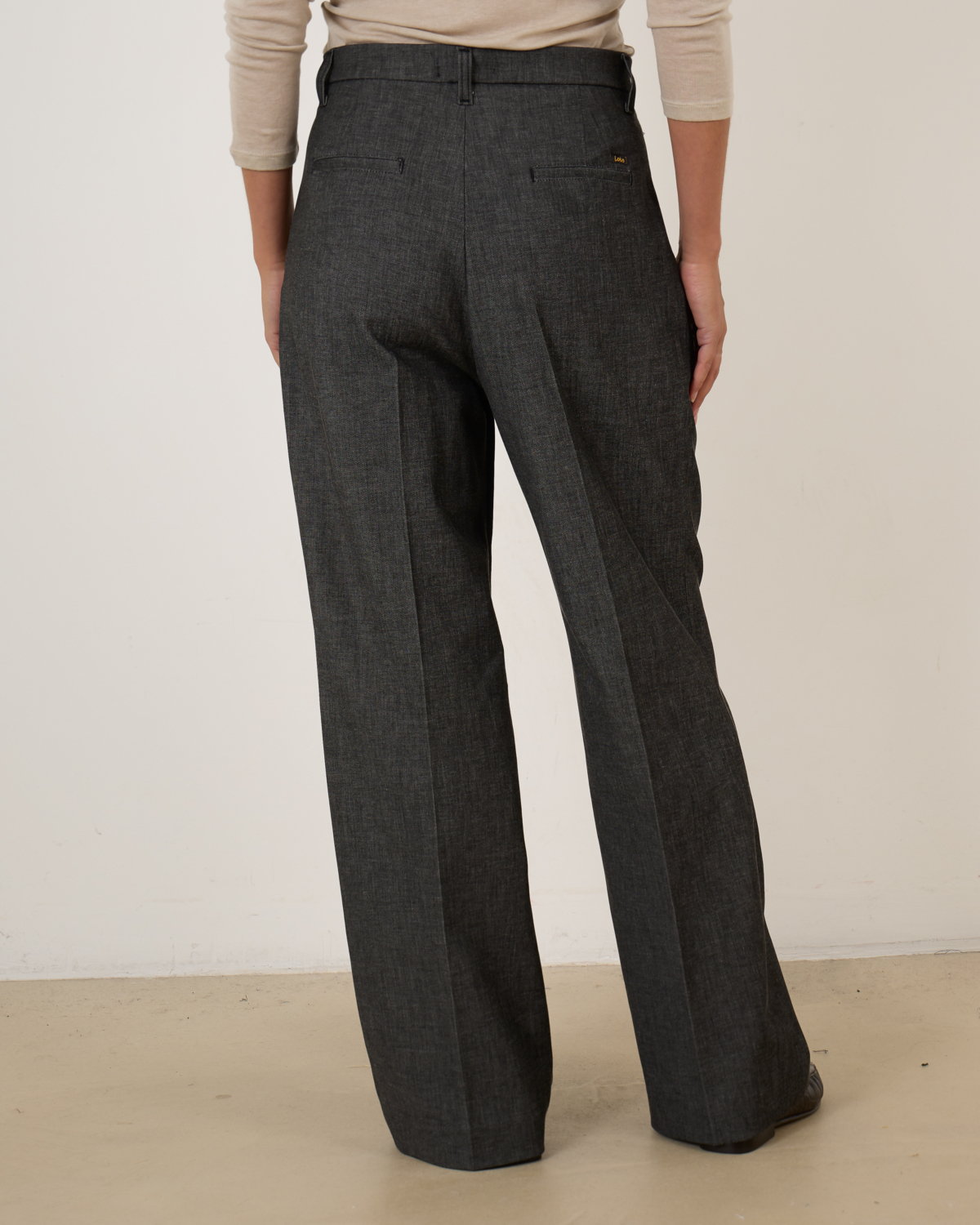 De Wanda Suit is een rechte broek met een hoge taille, verfijnde plooien en een aangesloten tailleband die zorgt voor een elegante pasvorm. Het ontwerp heeft een wijde pijp die het silhouet luchtig en modern maakt, terwijl de paspelzakken een klassieke, verzorgde afwerking bieden. Dankzij de lichte stretch in de stof combineert deze broek moeiteloos comfort met een perfect getailleerde look, ideaal voor zowel zakelijke als meer casual gelegenheden.
