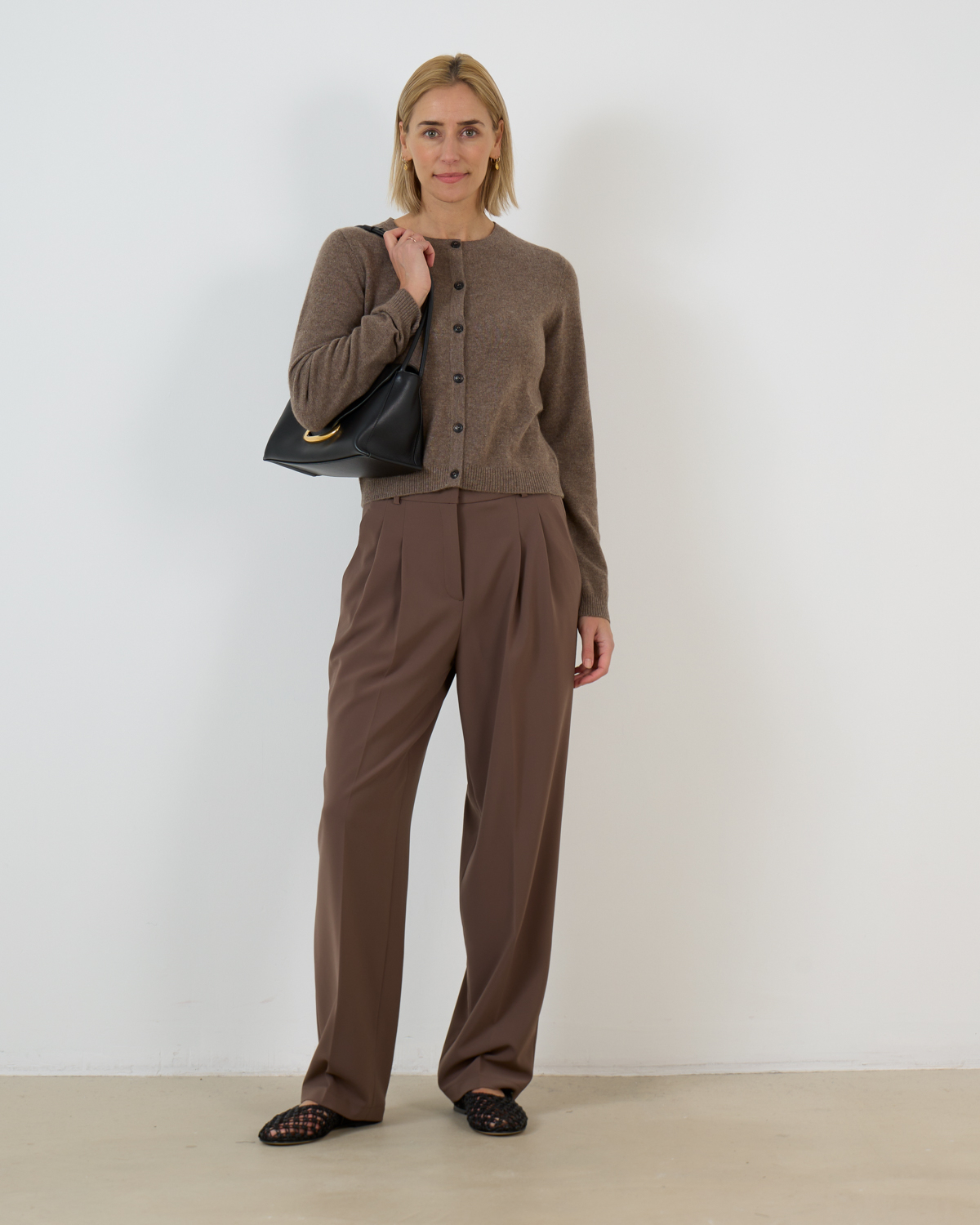 These sophisticated light brown wide-leg trousers showcase modern tailoring with distinctive pleated detailing at the front. The high-waisted design features a matching fabric belt and side pockets for practical elegance. Crafted from a premium polyester-polyurethane blend (90% polyester, 10% polyurethane), these Cambio trousers offer structured comfort in a regular fit. The full-length cut and refined brown shade create a striking silhouette that elevates contemporary women's clothing.