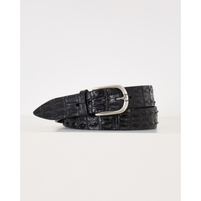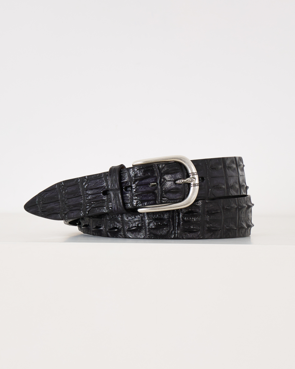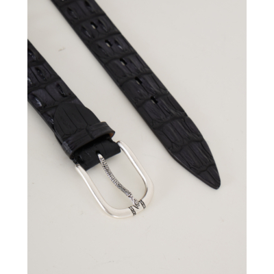 This black men's belt from Paolo Vitale features an embossed crocodile leather pattern that adds sophisticated texture to any outfit. The genuine leather construction ensures durability, while the silver-toned buckle with decorative detailing provides a refined finish. The classic black color makes this belt a versatile accessory for men's clothing essentials.