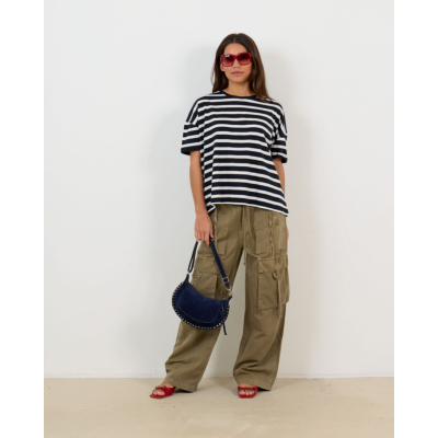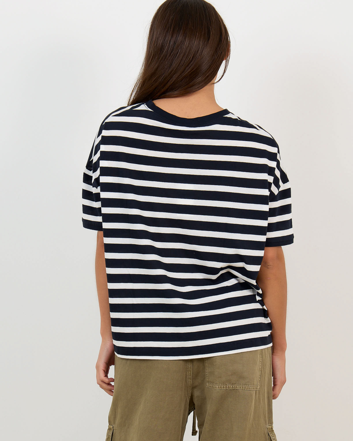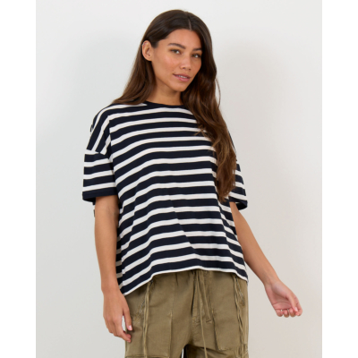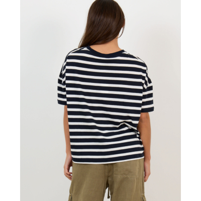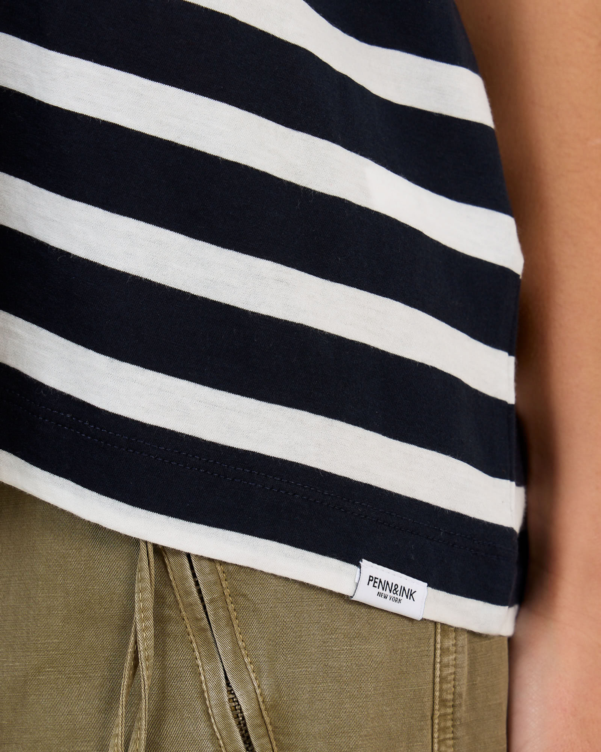 This striped tee in navy blue and cream brings timeless elegance to your women's clothing collection. Crafted from 100% cotton, the fabric feels soft against your skin while ensuring breathability throughout the day. The relaxed fit creates a comfortable silhouette with short sleeves and a classic round neckline. The horizontal stripe pattern adds visual interest and a nautical charm that never goes out of style. Penn&Ink delivers quality craftsmanship in this versatile piece that balances comfort with contemporary style.