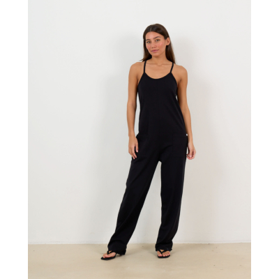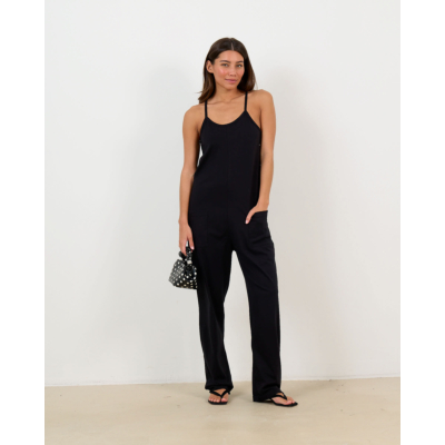 This sophisticated black jumpsuit embodies contemporary women's clothing at its finest. Crafted from 100% cotton, the sleeveless design features delicate spaghetti straps and a flattering V-neckline. The relaxed fit creates an elegant silhouette with straight-leg pants that flow beautifully. Practical side pockets add functionality to this Penn&Ink piece. The timeless black hue makes this versatile jumpsuit a standout addition to your collection.