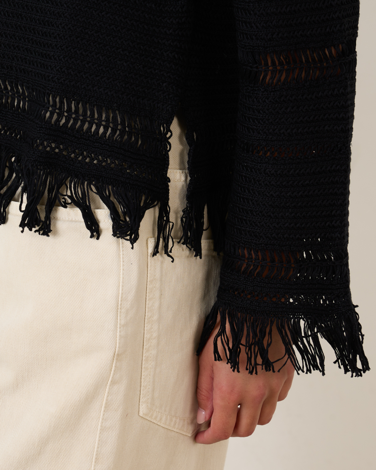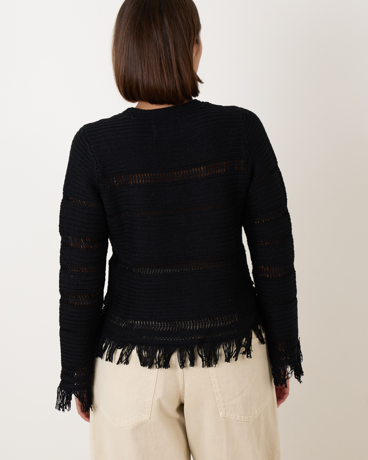 De Azilis Sweater van Marant Étoile kenmerkt zich door een gebreid gebreid macramépatroon, versierd met all-over frankjes. De sweater komt in het zwart en is gemaakt van 100% Katoen. Het silhouet is recht en biedt een relaxed-fit pasvorm.