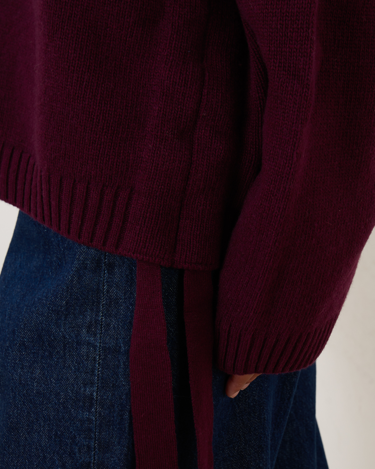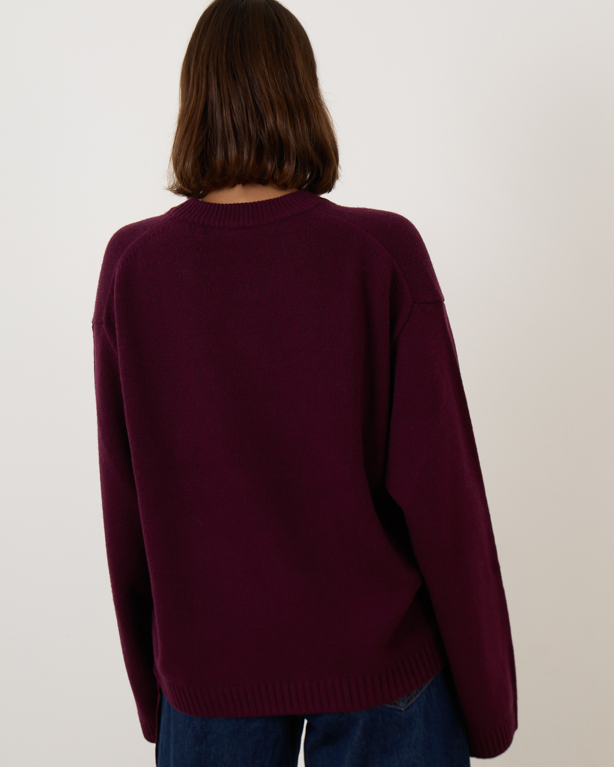 Style this burgundy sweater with tailored trousers for polished office looks, or pair with wide-leg jeans for relaxed weekend sophistication. Layer under structured blazers during transitional seasons, or combine with midi skirts for feminine contrast.