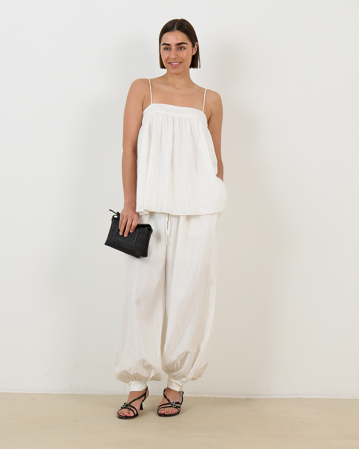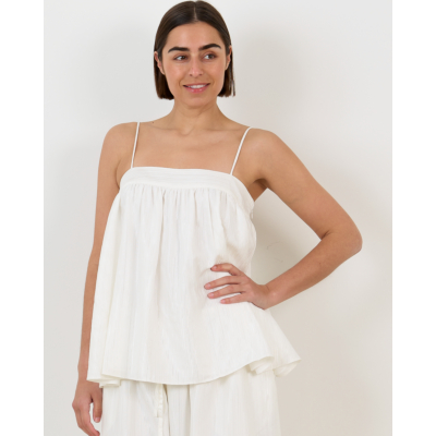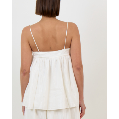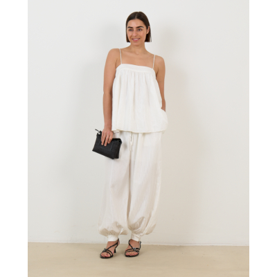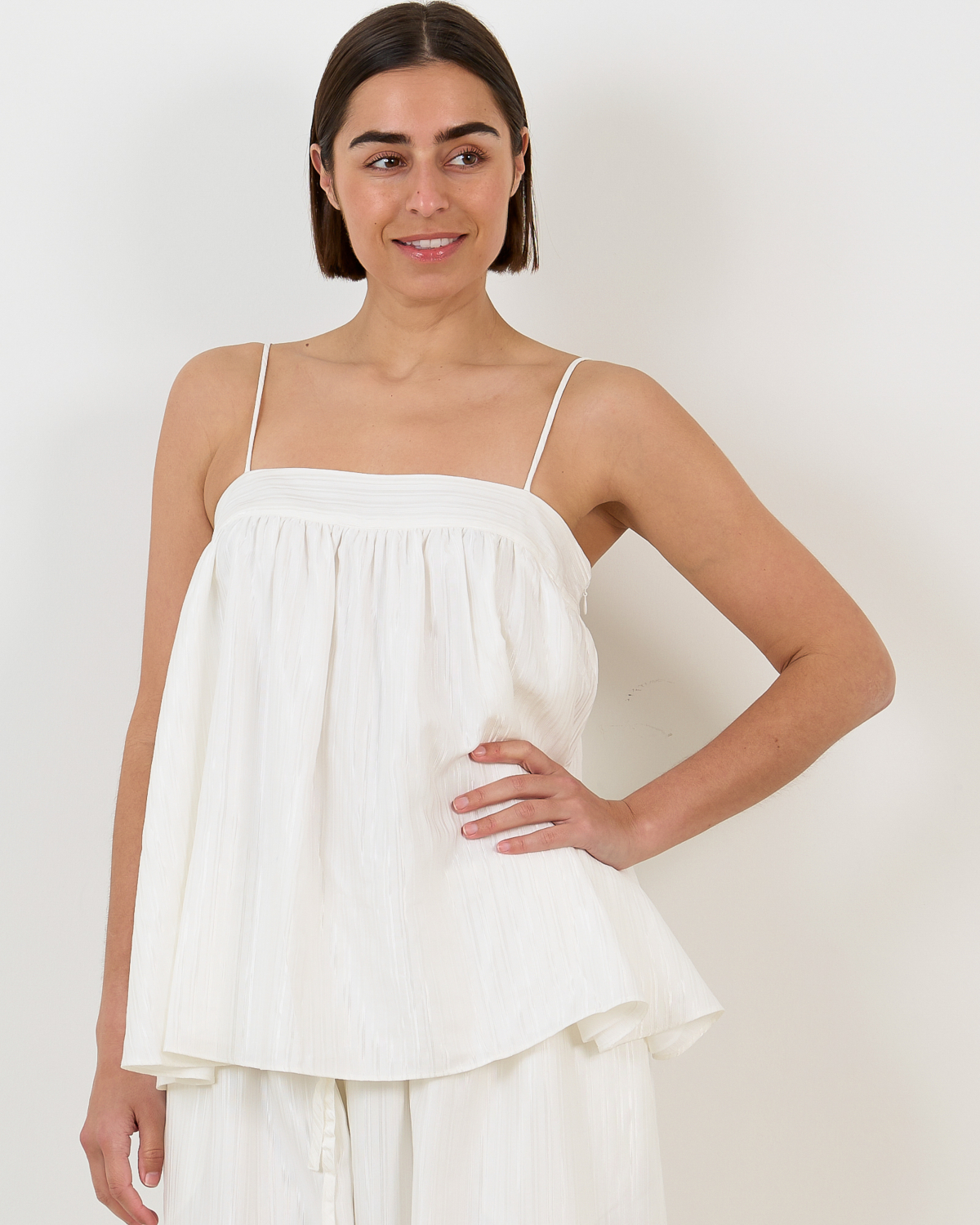 This elegant white slip top showcases subtle striped texture throughout the 100% viscose fabric. The straight neckline and delicate spaghetti straps create a refined silhouette, while the gathered detail below the bust adds feminine charm. The relaxed fit ensures comfortable wear throughout the day. From Rotate, this piece embodies modern sophistication with its clean lines and premium fabric quality.