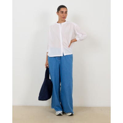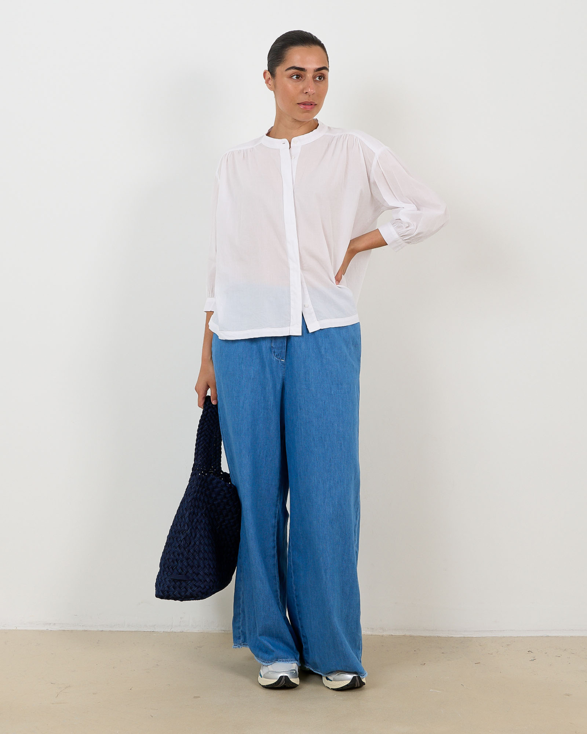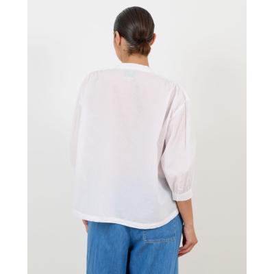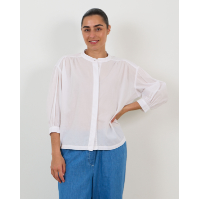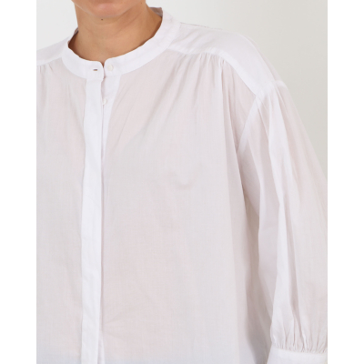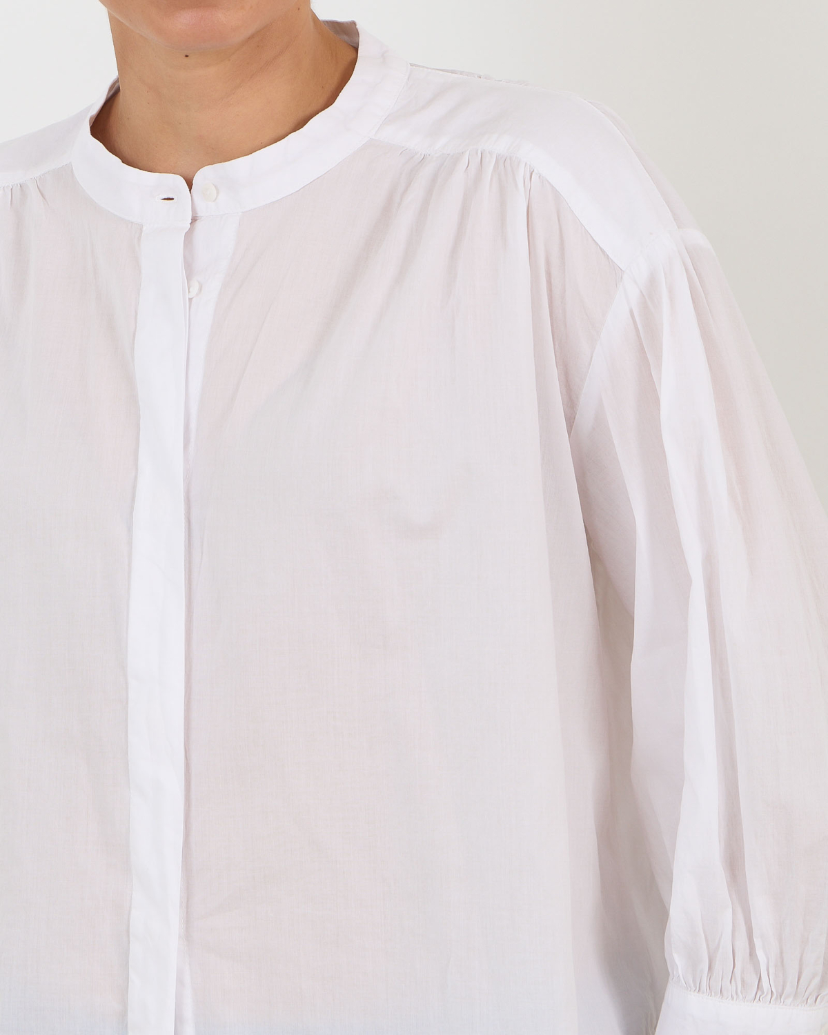This white mandarin collar blouse from Sacrécoeur brings contemporary elegance to your women's clothing collection. The crisp white cotton features a distinctive mandarin collar and relaxed fit that flatters beautifully. Long sleeves with gathered cuffs add refined volume, while the button-front closure creates clean lines. Crafted from 100% cotton, this piece offers both comfort and sophistication.