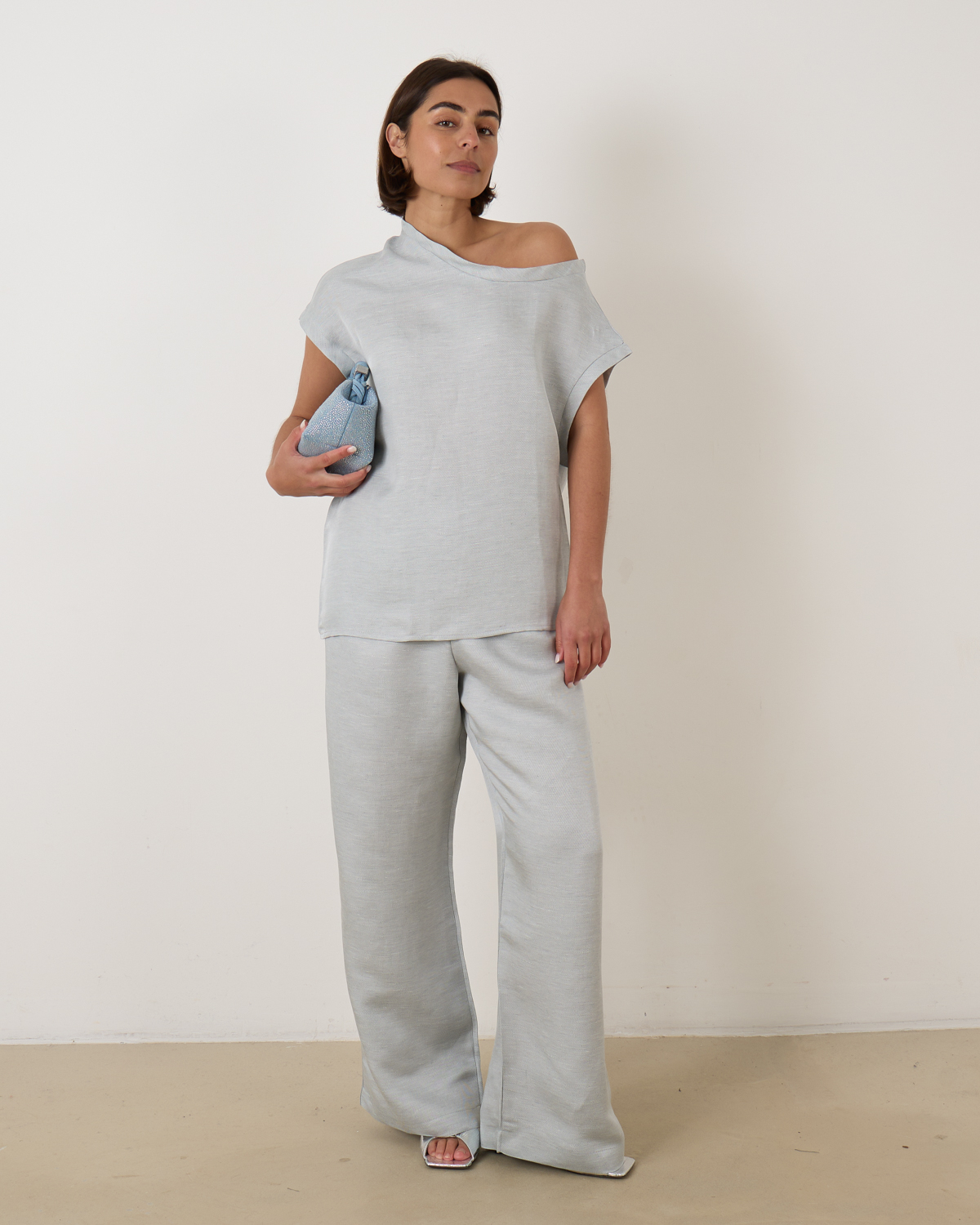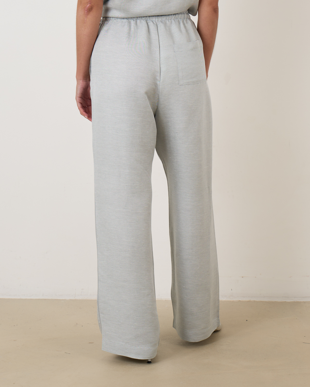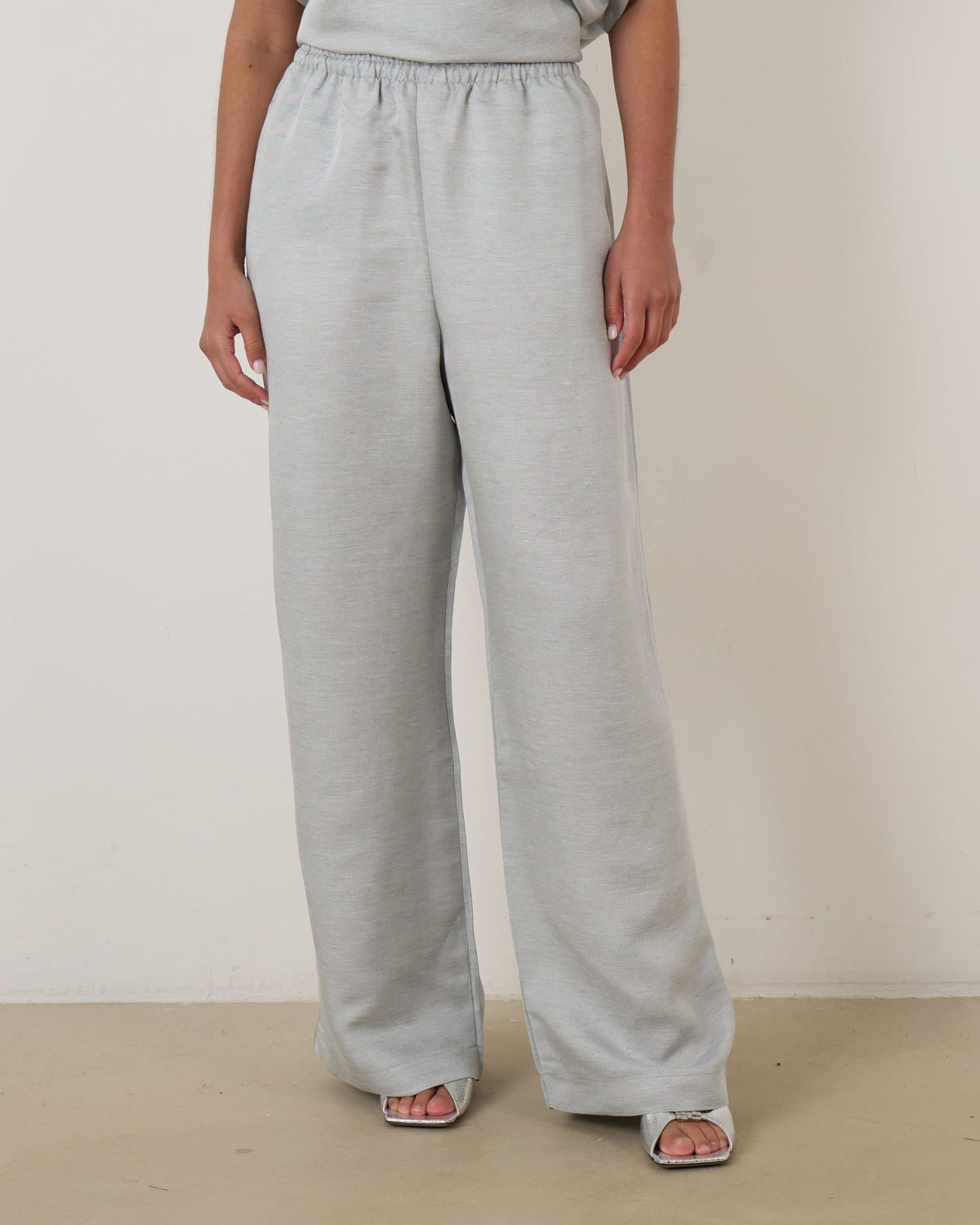 Ontdek de wijd-uitlopende stijl van de Super Bruce Pants van Sea Me Happy. De pantalon komt in de kleur Silver Blend en heeft een brede elastische tailleband, één achterzak en steekzakken. De soepelvallende pijpen benadrukken het wijde silhouet op een elegante manier.
