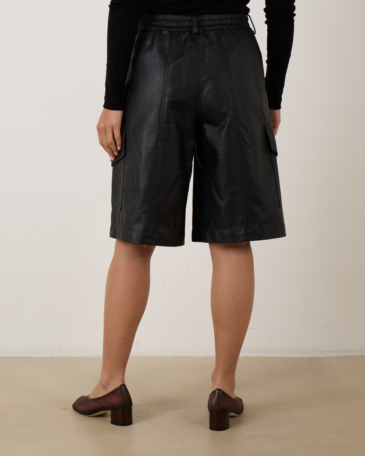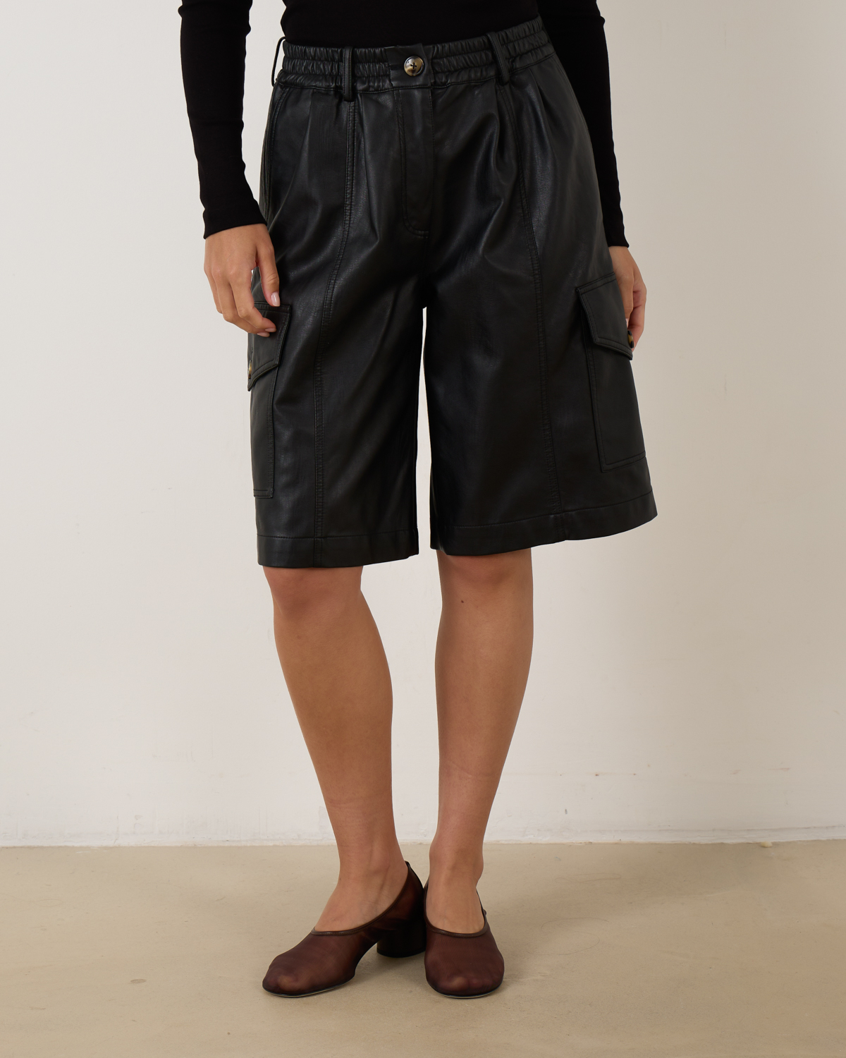 De Neeto Shorts van Baum und Pferdgarten zijn een eigentijdse interpretatie van de klassieke bermuda, uitgevoerd in zwart imitatieleer. Met een hoge taille en relaxte pasvorm bieden deze shorts zowel comfort als stijl. De elastische tailleband met riemlussen, zijzakken en een ritssluiting met knoop zorgen voor praktische details.