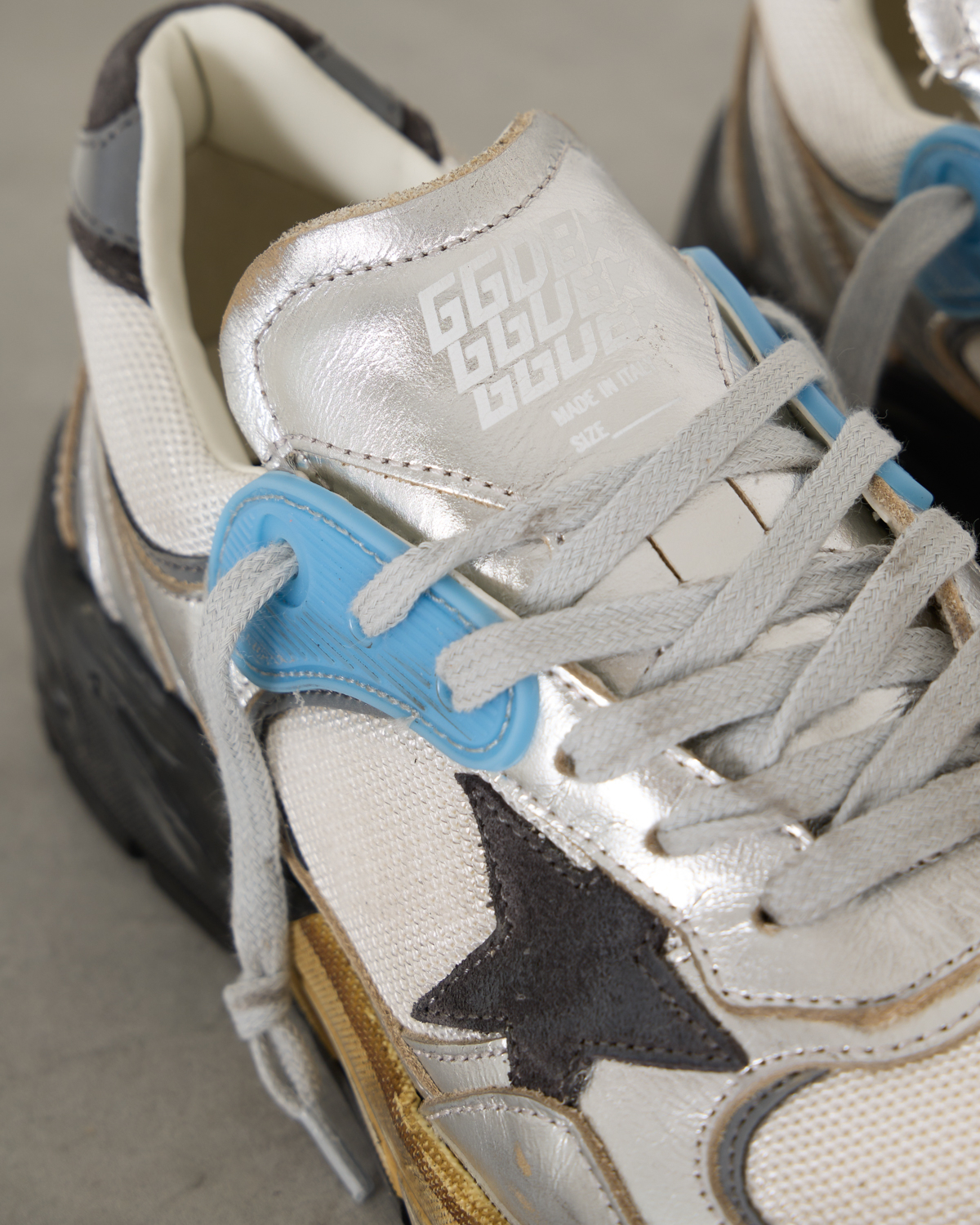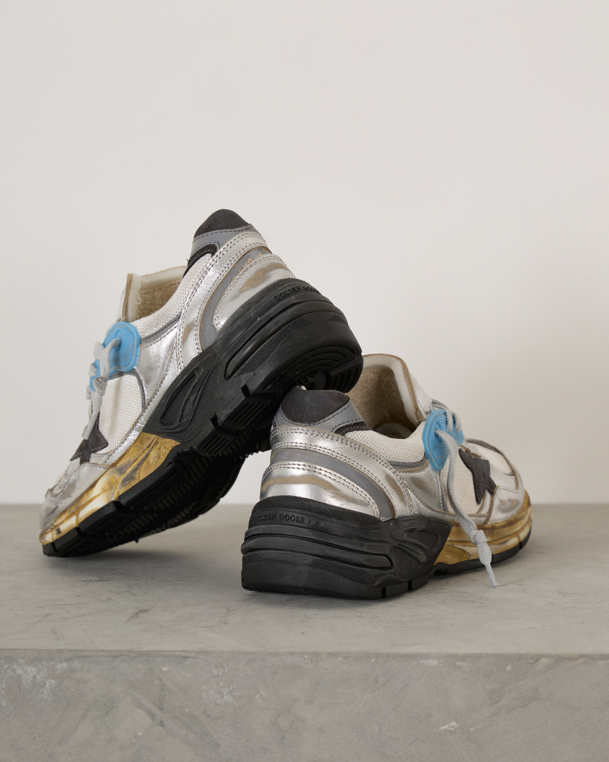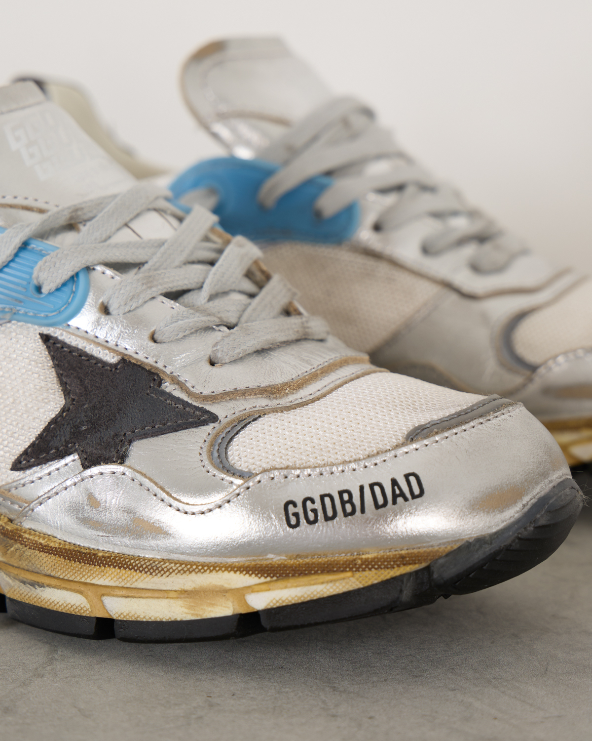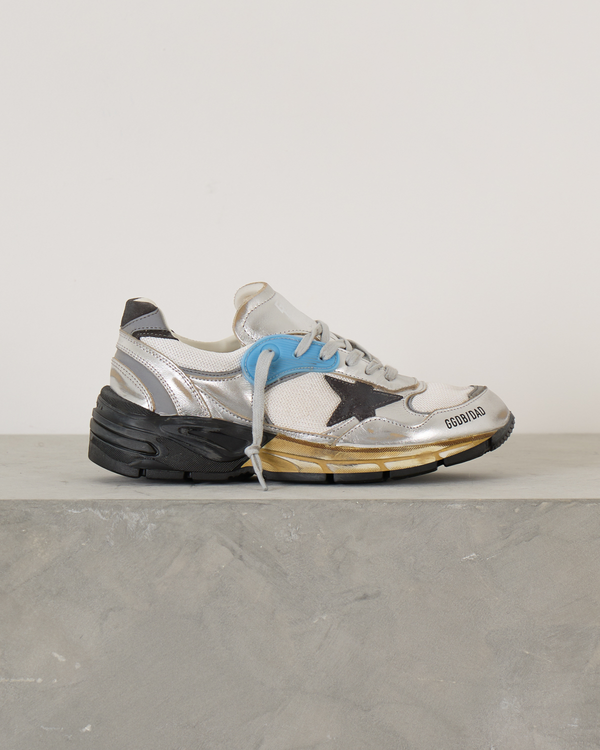 De Dad-Star sneakers zijn tijdloos en ontworpen om als stijl generaties door te worden gegeven. Deze sneakers hebben een bovenwerk van wit mesh, zilver kleurig leer en Blauwe oogjes. De authenieke vintage look met diverse merk-bedrukking maken de sneakers stoer en compleet.