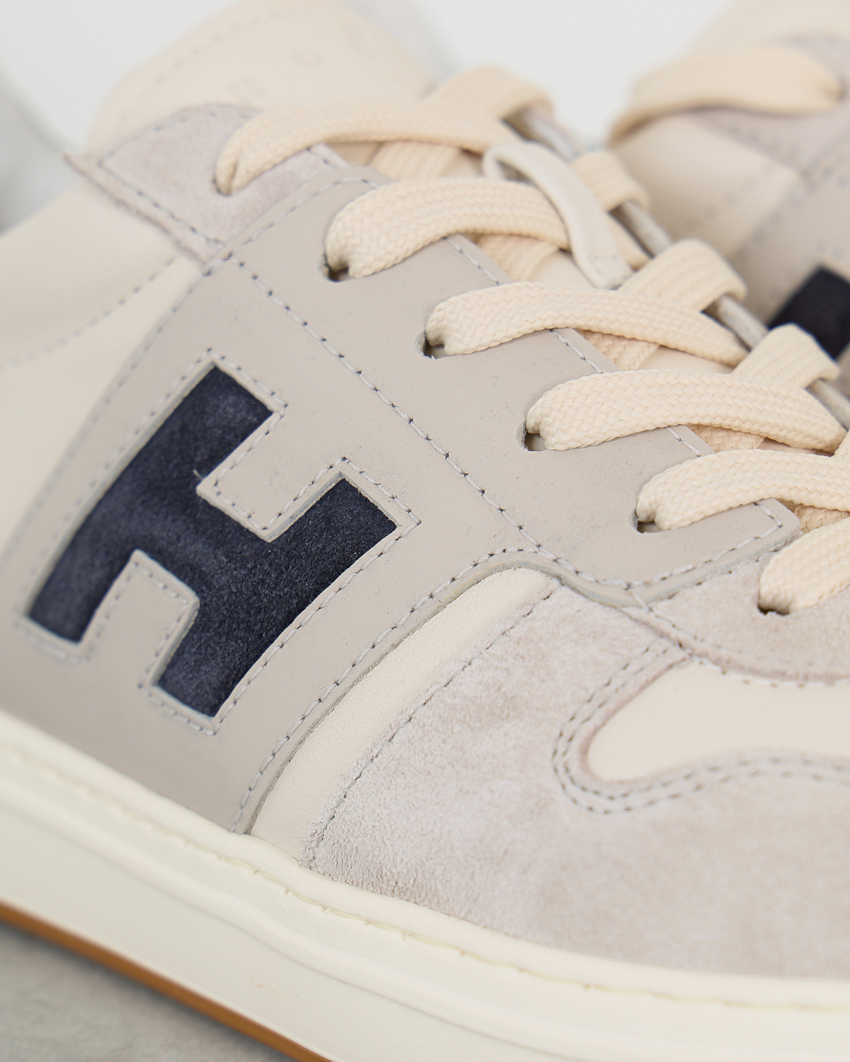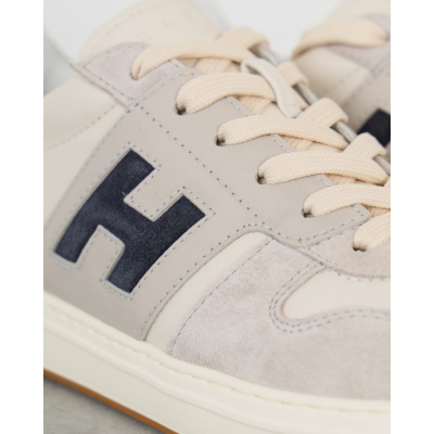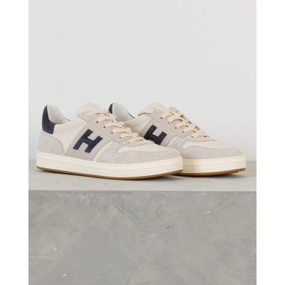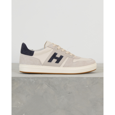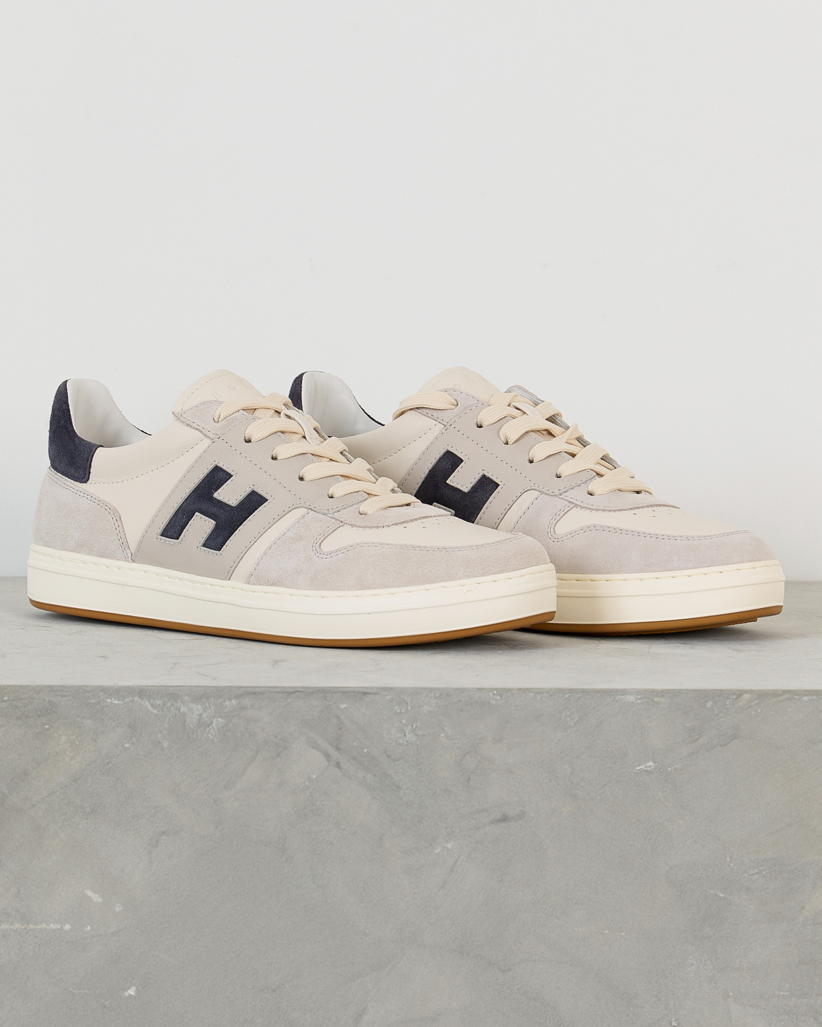 These white sneakers from Hogan combine premium leather and suede for refined men's clothing style. The clean white base features navy suede accents on the iconic H-logo and heel tab, while cream laces add subtle contrast. The flat profile creates a sleek silhouette, complemented by precise stitching details throughout the upper. A white midsole pairs with a gum rubber outsole for classic court-inspired aesthetics.