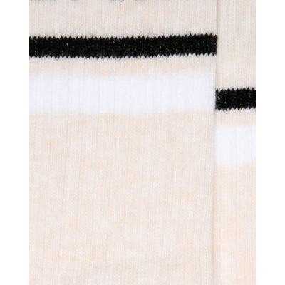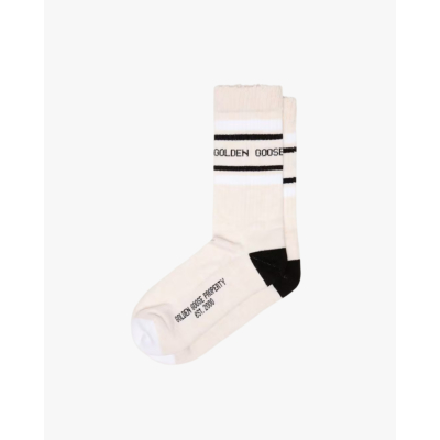 These ribbed socks in off-white bring athletic-inspired style to your everyday men's clothing essentials. Crafted from a comfortable blend of 67% cotton, 29% polyester, and 4% spandex, they offer the perfect balance of breathability and stretch. The high-ribbed texture creates visual interest, while contrasting black stripes and heel add a sporty touch. The knitted Golden Goose logo displays authentic brand craftsmanship. From Golden Goose, these crew socks combine comfort with contemporary design.