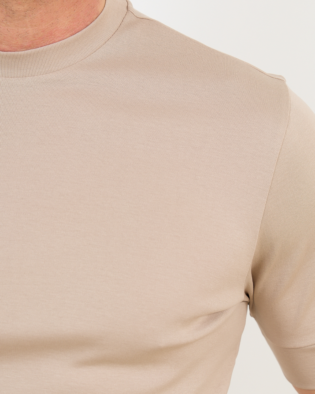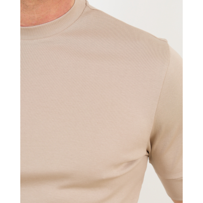 Pair this beige tee with dark denim and white sneakers for relaxed weekend looks, or layer under a navy blazer with chinos for smart casual occasions. The neutral tone complements earth tones like olive green or chocolate brown trousers beautifully.