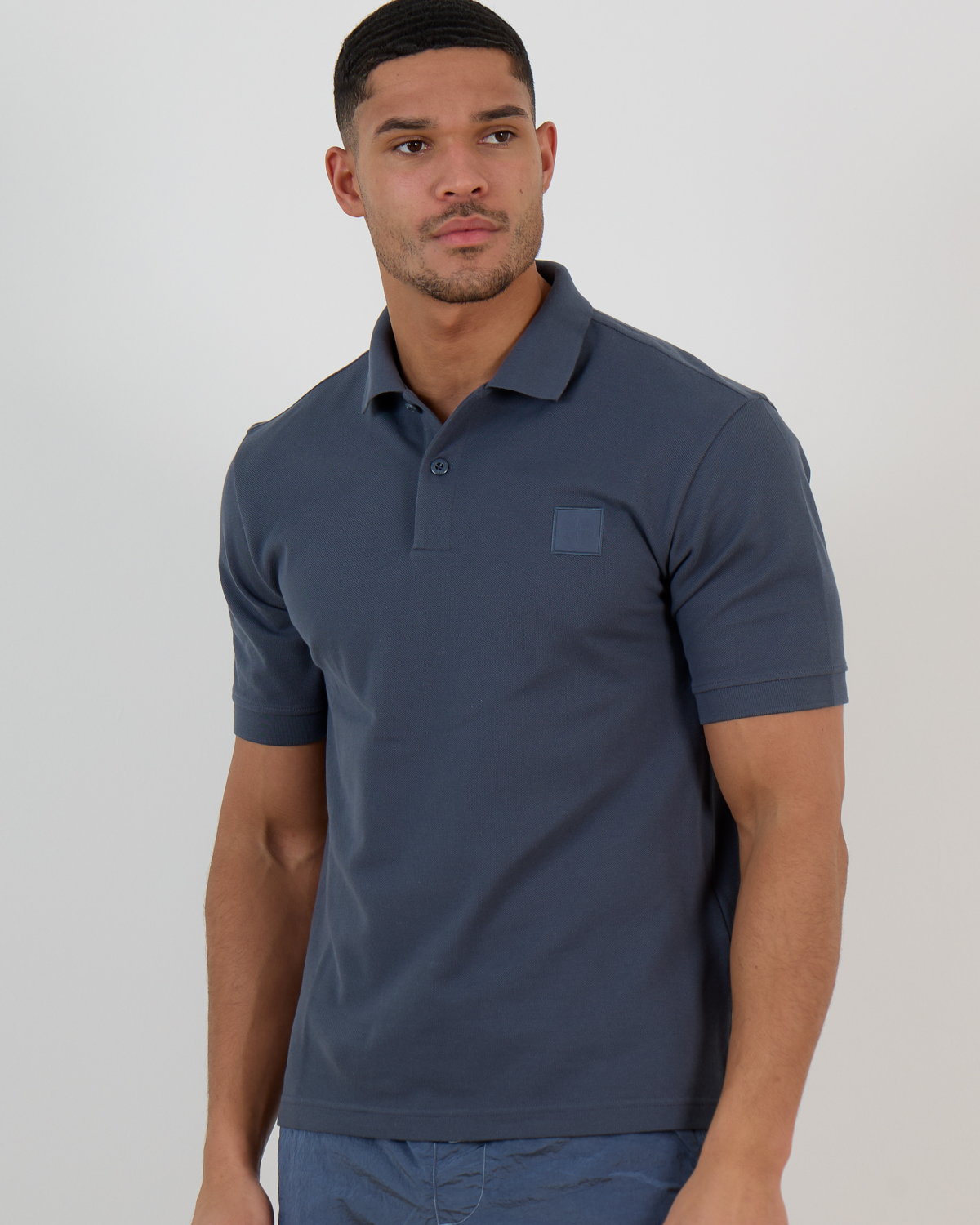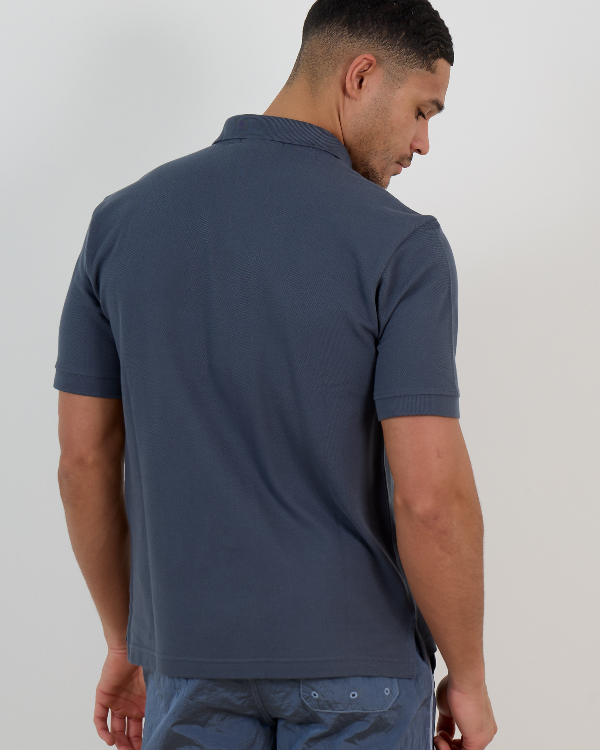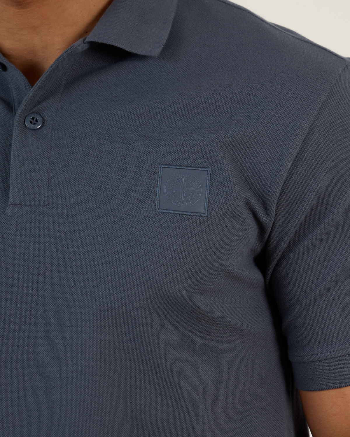 This refined blue polo shirt from Stone Island combines classic design with contemporary appeal. Crafted from 100% cotton, the men's clothing piece features a smooth texture and comfortable regular fit. The short-sleeved design includes a traditional polo collar with three-button closure and signature square logo patch on the chest. The rich slate blue tone offers sophisticated versatility for various styling occasions.