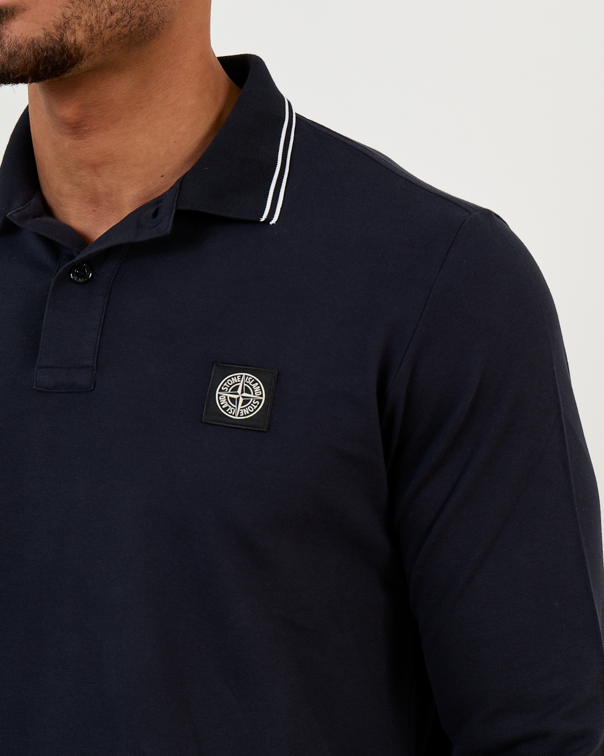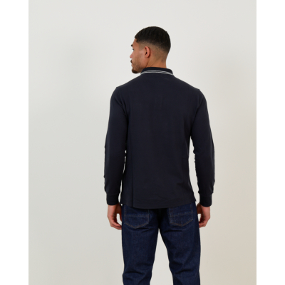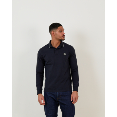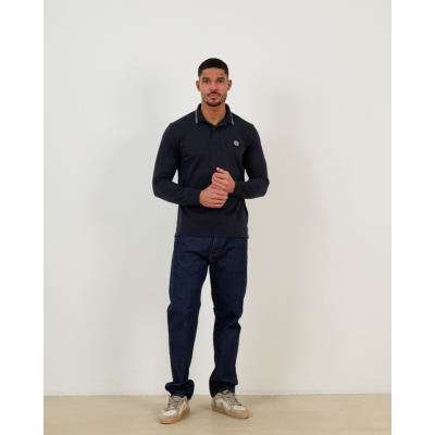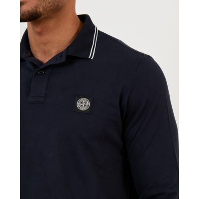 This refined navy blue long sleeve polo brings classic sophistication to your men's clothing collection. Crafted from 95% cotton with 5% elastane, the fabric offers exceptional comfort while maintaining its shape. The slim fit cut creates a modern silhouette that feels tailored yet relaxed. White contrast piping along the collar adds a distinctive finishing touch, while the iconic Stone Island compass badge provides authentic brand recognition.