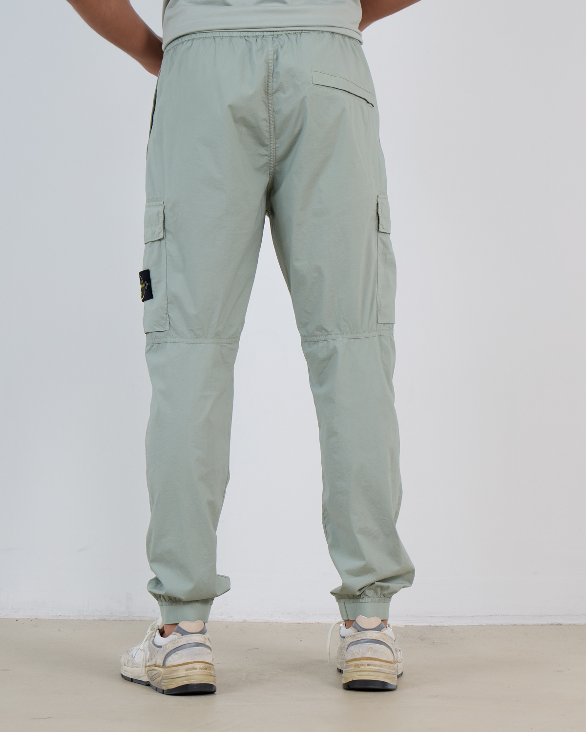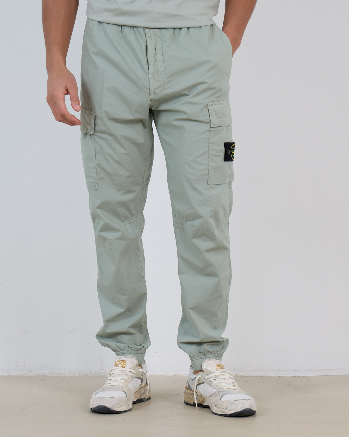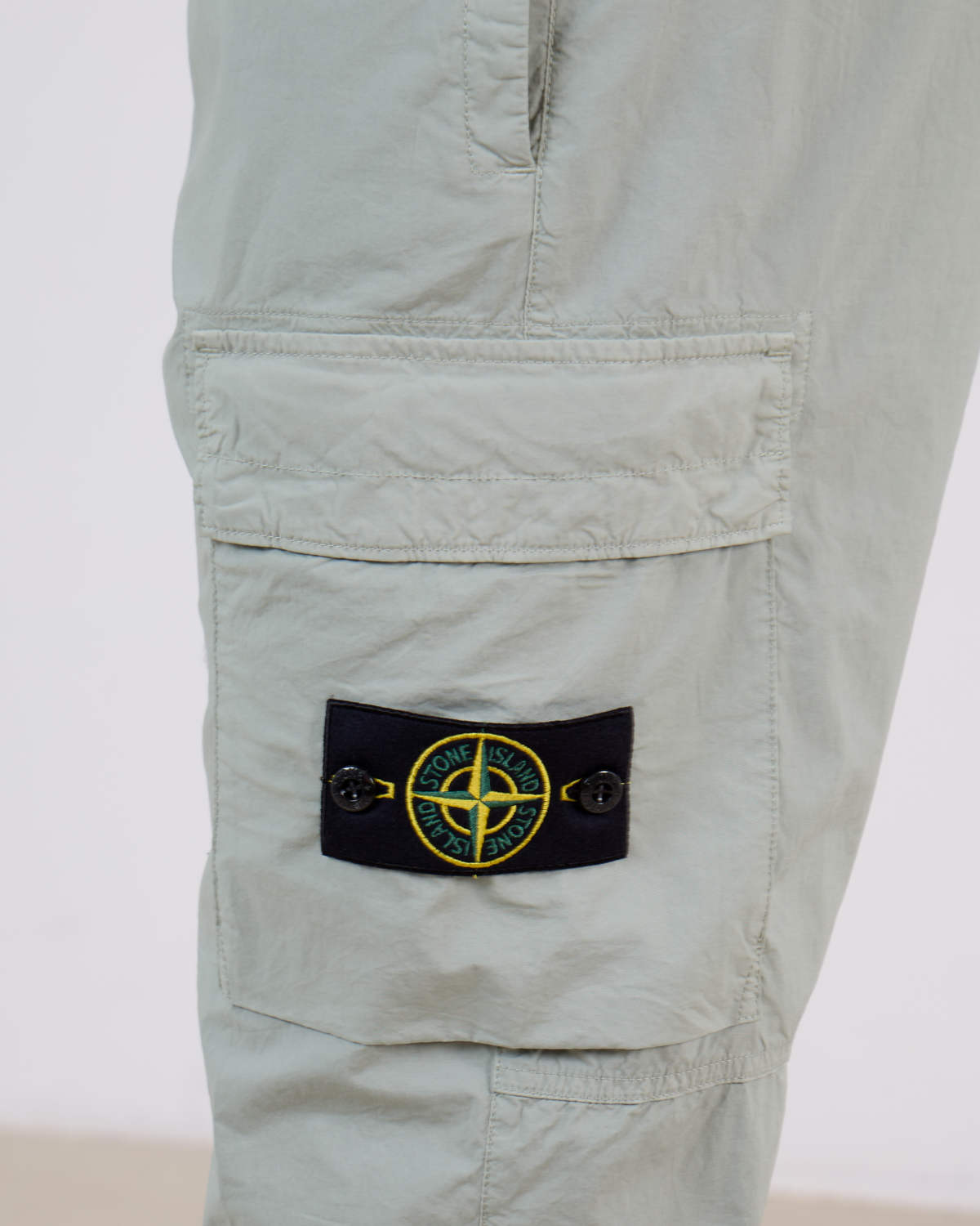 This sage green cargo trouser from Stone Island combines functional design with contemporary men's clothing aesthetics. The light green cotton-elastane blend (97% cotton, 3% elastane) ensures comfortable movement while maintaining shape. The regular fit provides a relaxed silhouette with multiple cargo pockets on the legs and an elastic waistband with drawstring closure. The iconic Stone Island compass badge adds authentic brand recognition to these versatile trousers.