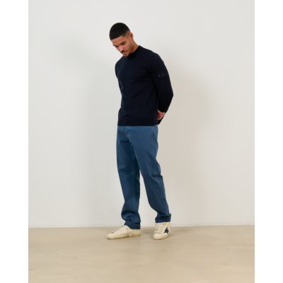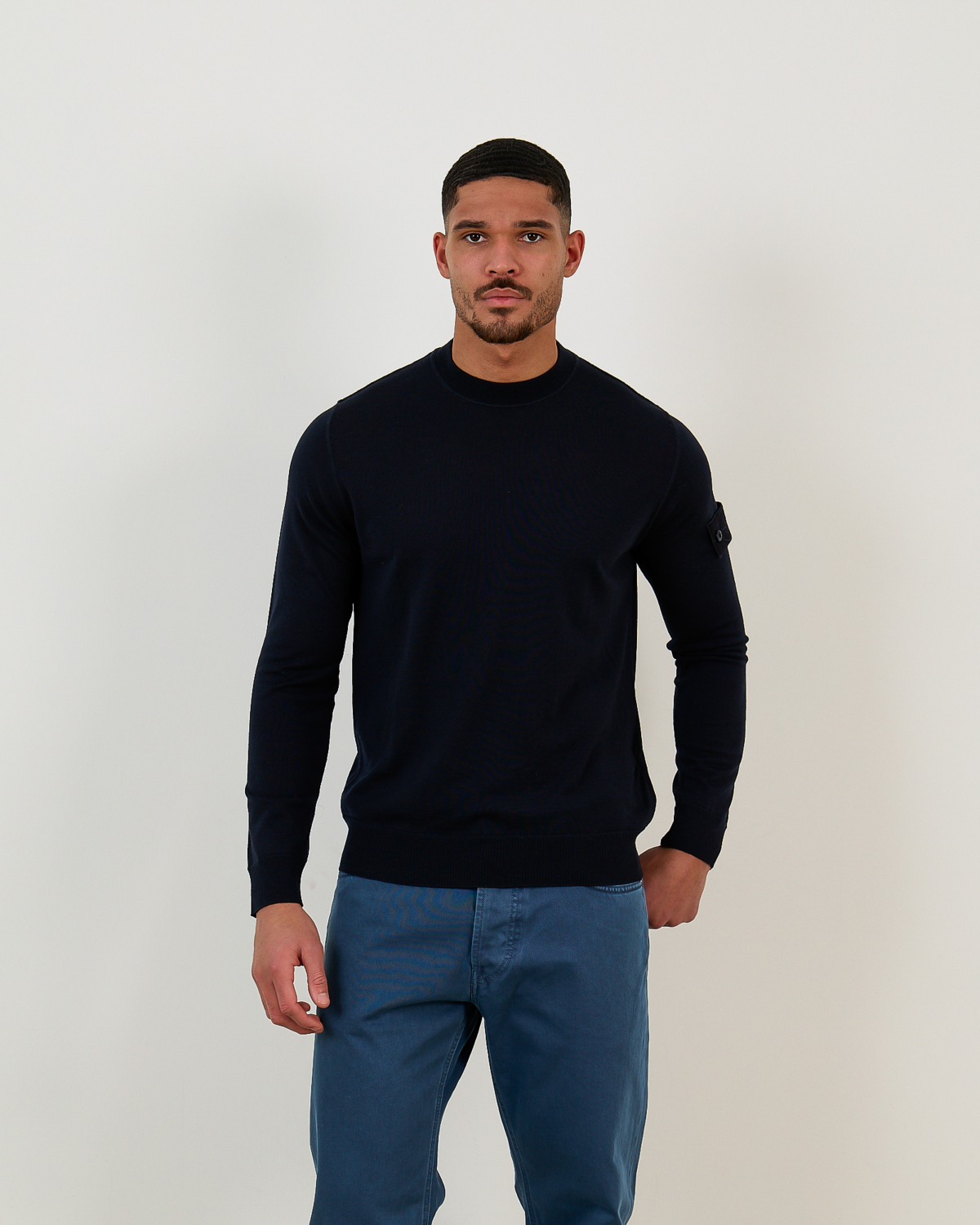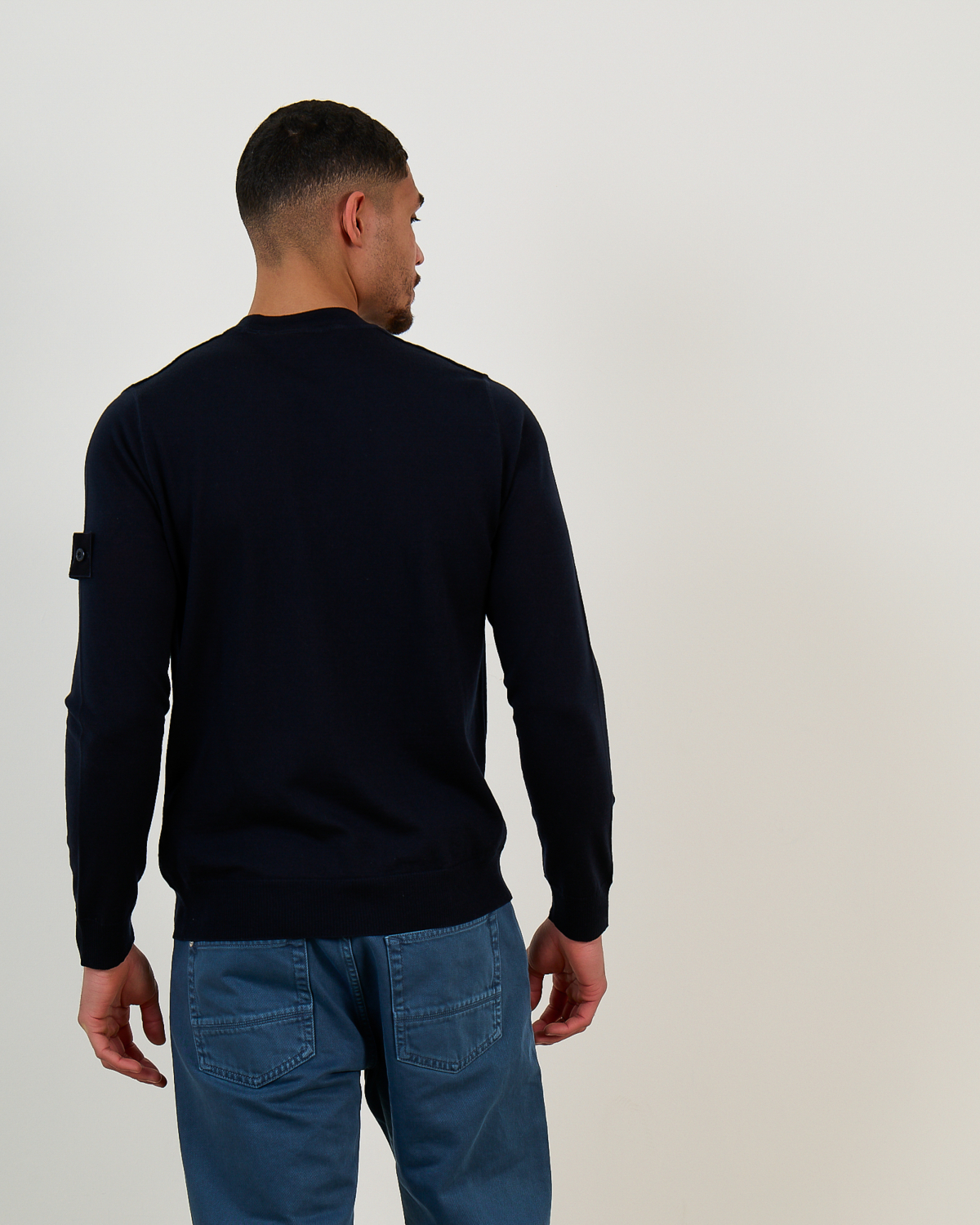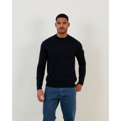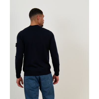 This navy pullover represents refined men's clothing with understated elegance. The 100% virgin wool construction provides exceptional warmth and breathability, while the regular fit offers comfortable movement throughout the day. The crew neck design features long sleeves with distinctive compass patch detailing on the left arm, showcasing the signature Stone Island craftsmanship. The rich navy tone creates a versatile foundation for both casual and smart-casual styling.