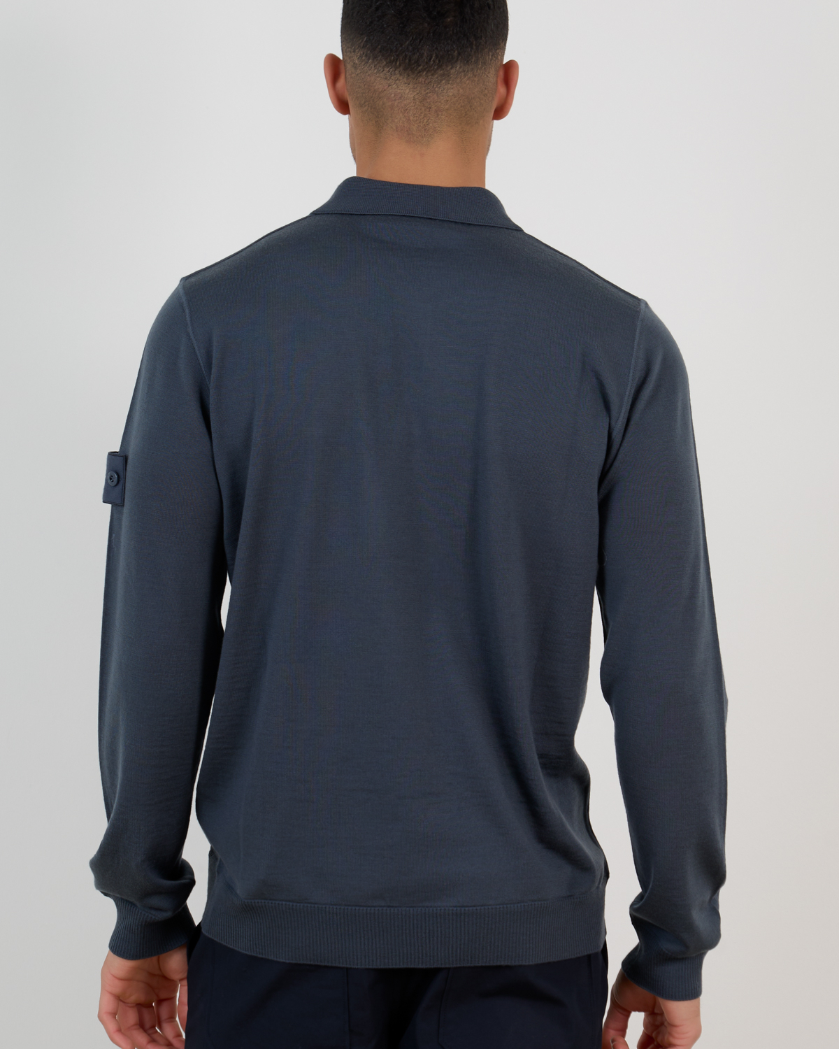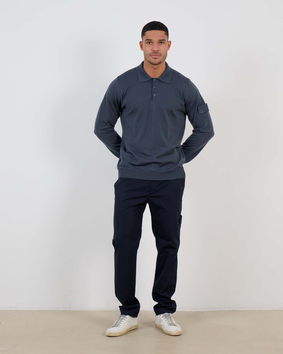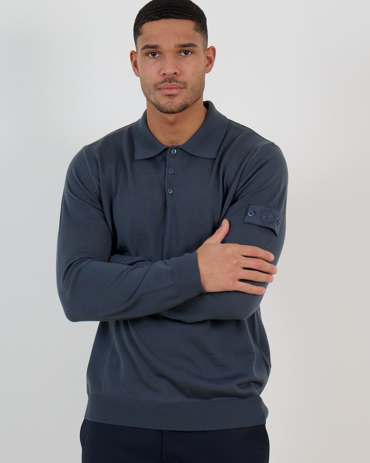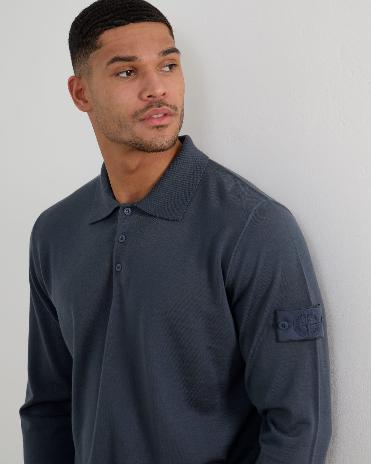 This slate blue long sleeve polo from Stone Island brings refined men's clothing to your wardrobe. The 100% wool construction offers exceptional comfort and warmth, while the classic polo collar and button placket create timeless appeal. The regular fit ensures comfortable movement throughout the day. The signature Stone Island badge on the left sleeve adds an authentic designer touch to this premium pullover.
