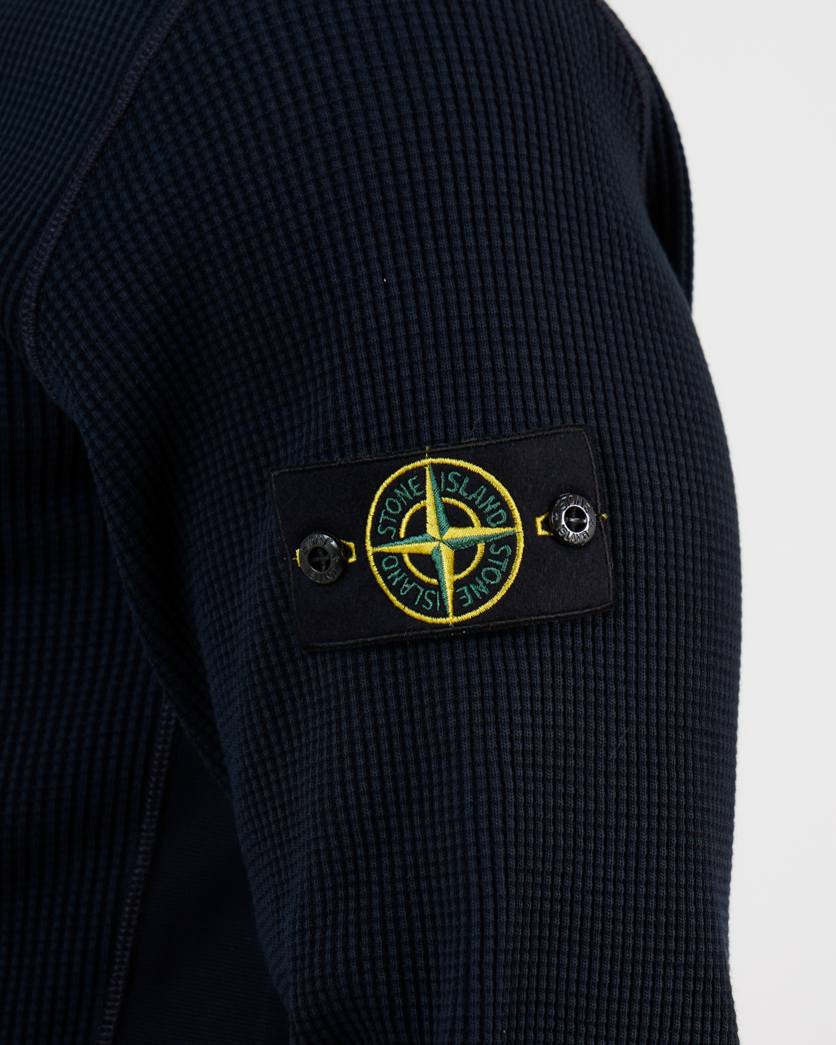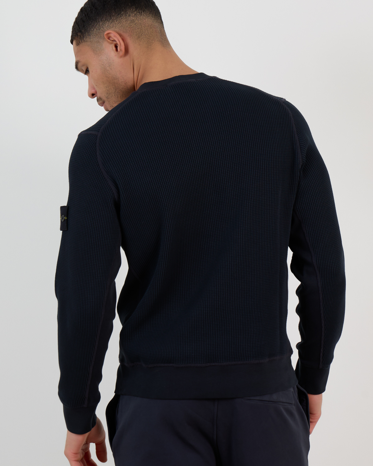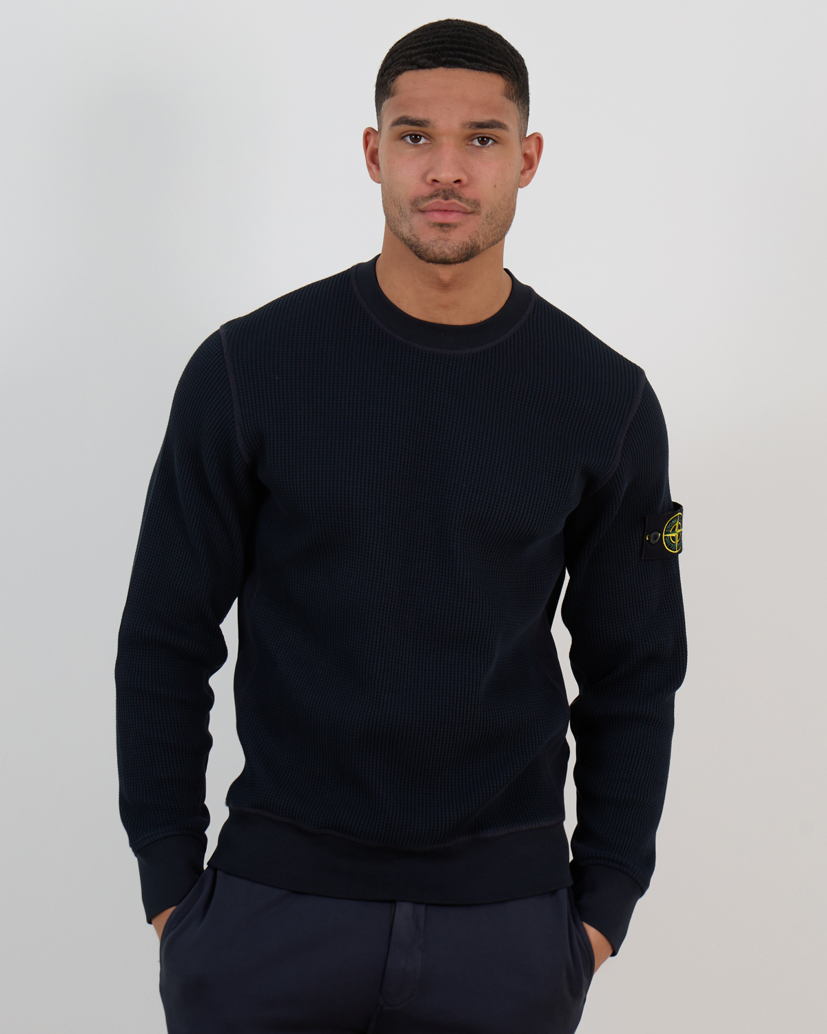 This navy blue crew neck sweatshirt from Stone Island combines classic men's clothing with contemporary design. The 100% cotton construction features a distinctive ribbed texture throughout, creating visual depth and tactile appeal. The regular fit ensures comfortable movement while maintaining a refined silhouette. The iconic Stone Island compass badge adorns the left sleeve, secured with signature button fastenings. Long sleeves and a classic crew neckline complete the sophisticated design.